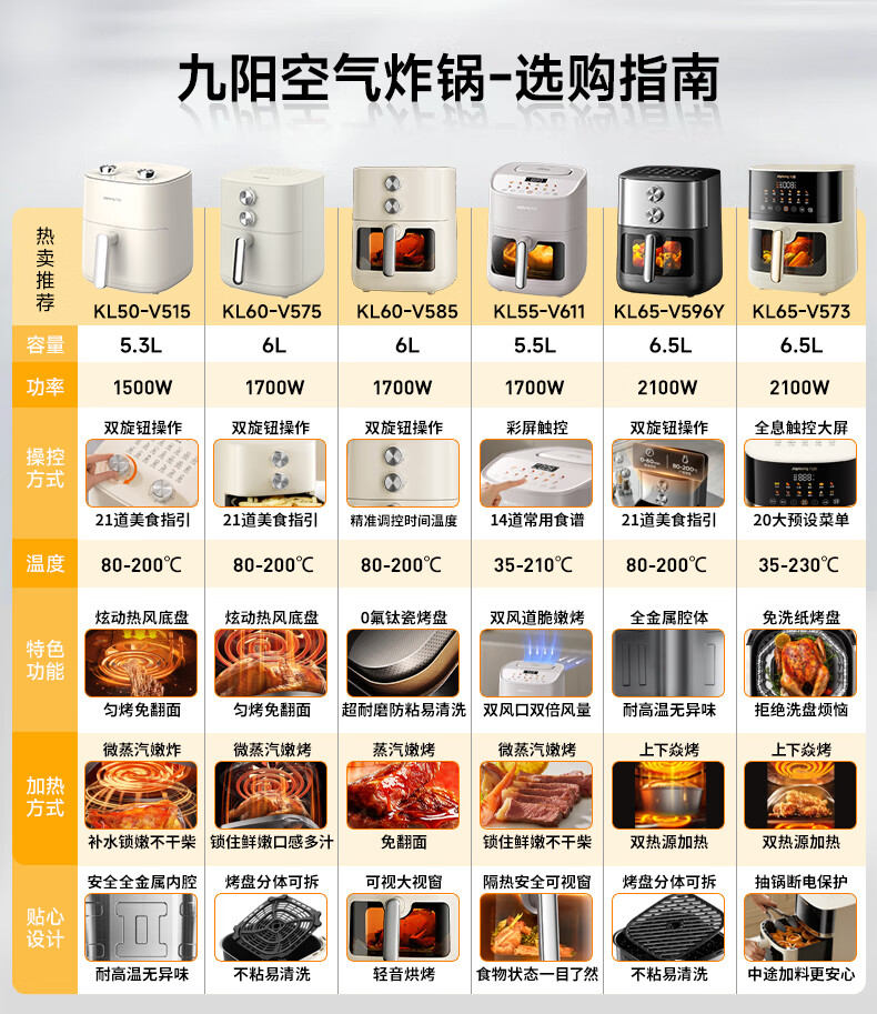 九阳(Joyoung)空气炸锅家用 5L大容量不沾易清洗 蒸汽嫩烤准确定时无油煎炸 薯条机蒸烤一体机 KL45-VF501