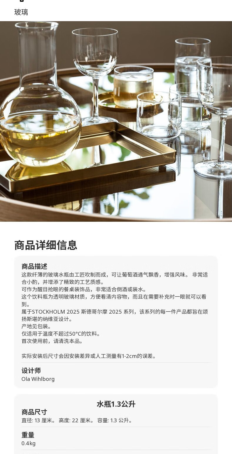 宜家(IKEA)STOCKHOLM斯德哥尔摩餐用水瓶1.3L玻璃家用 餐用水瓶玻璃 1.3L
