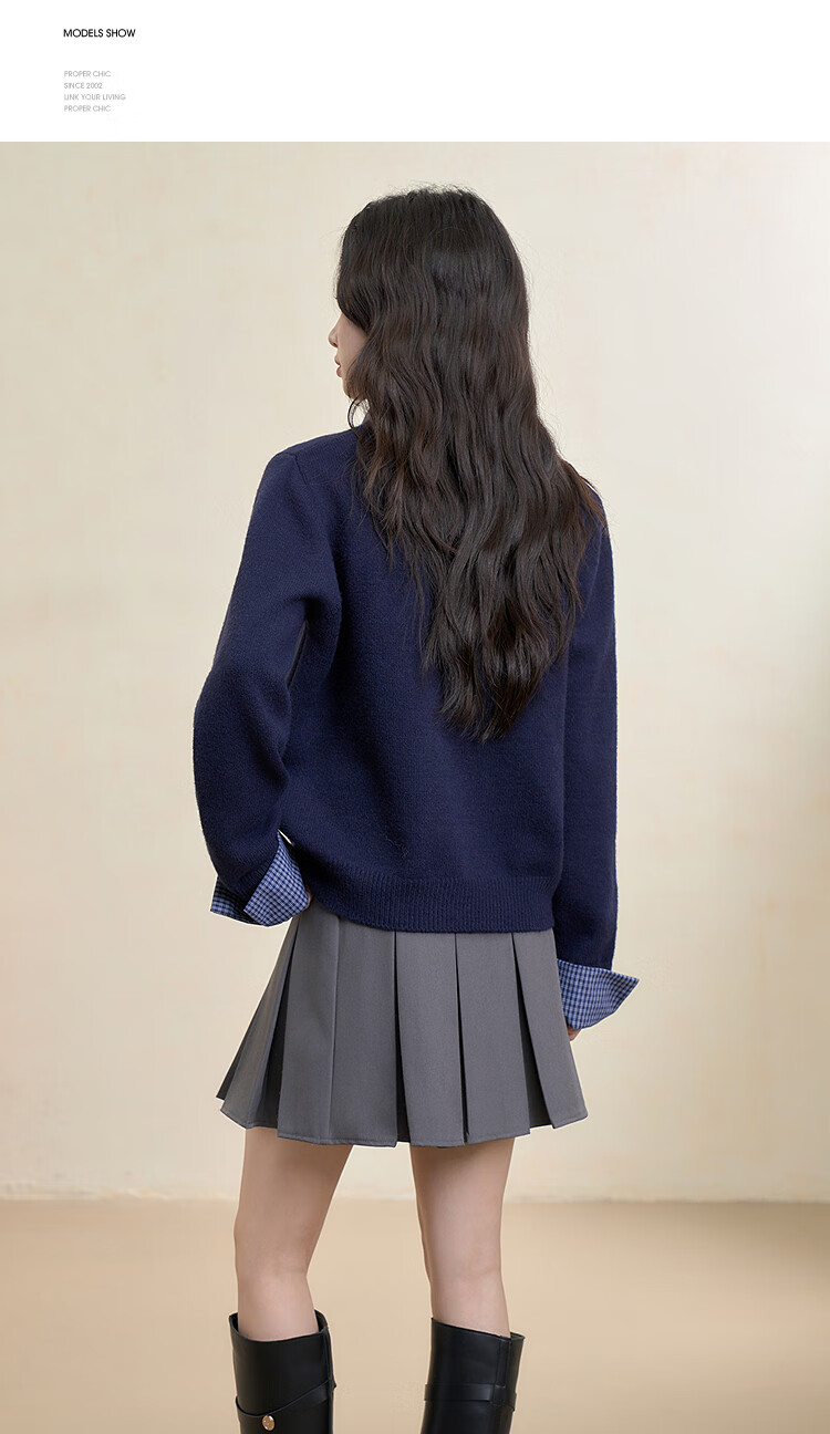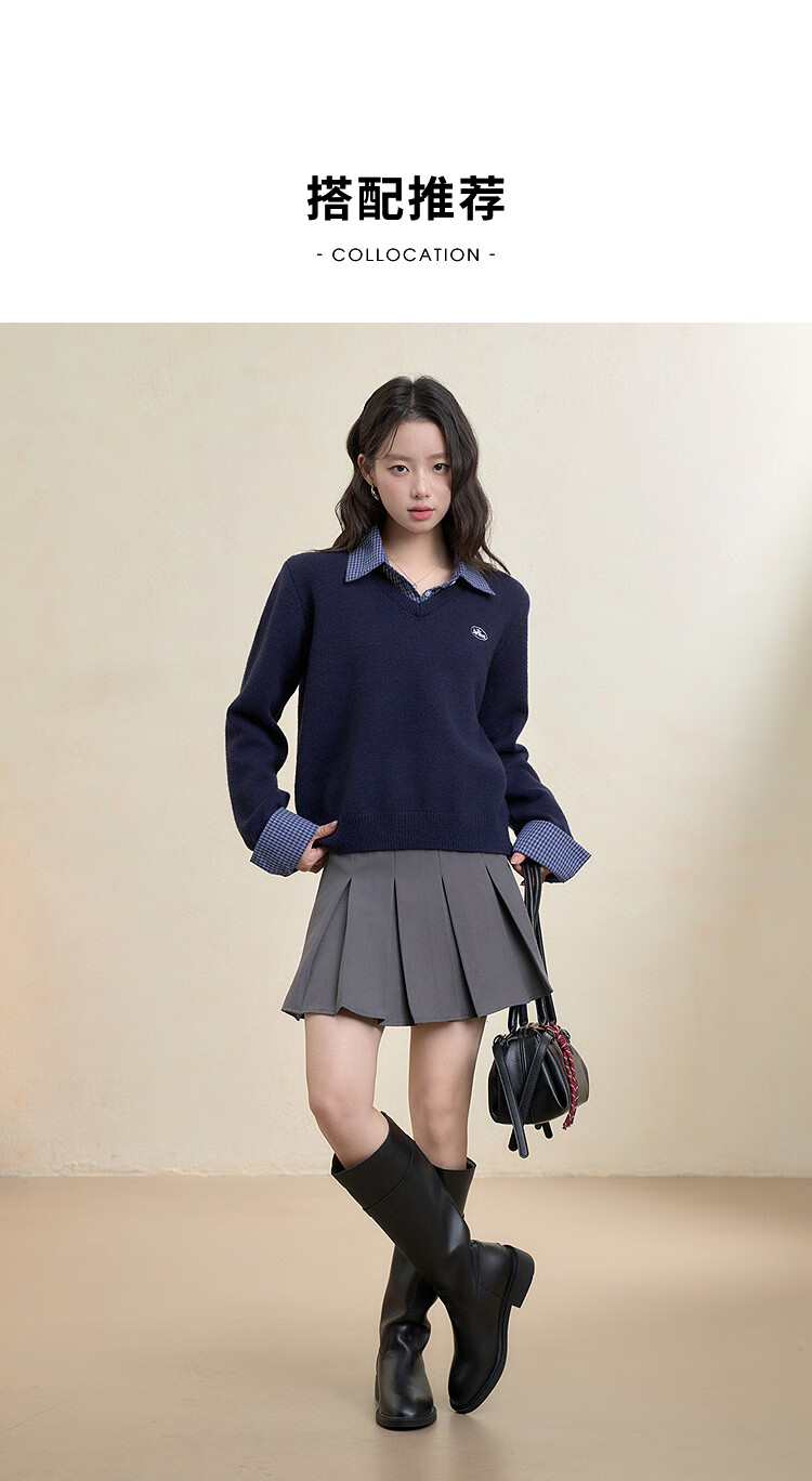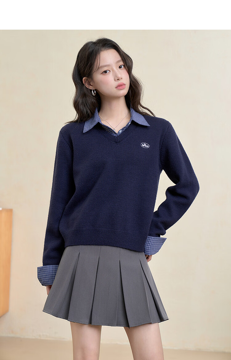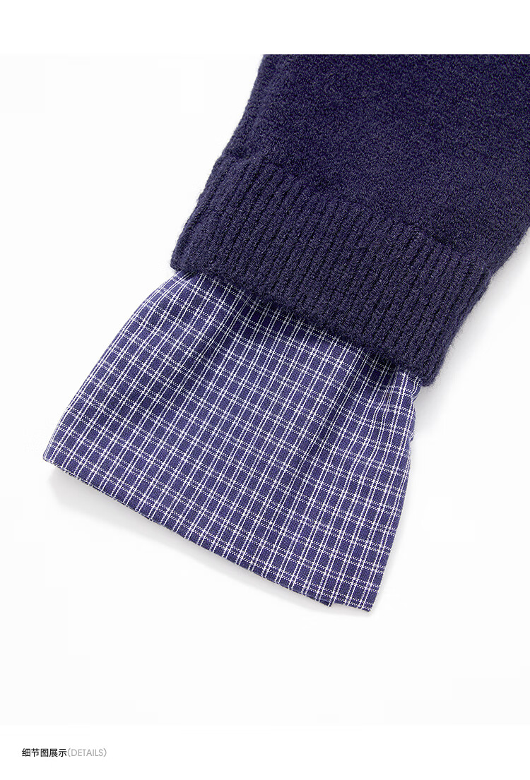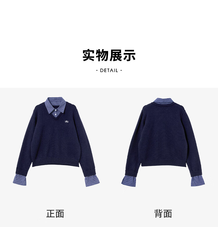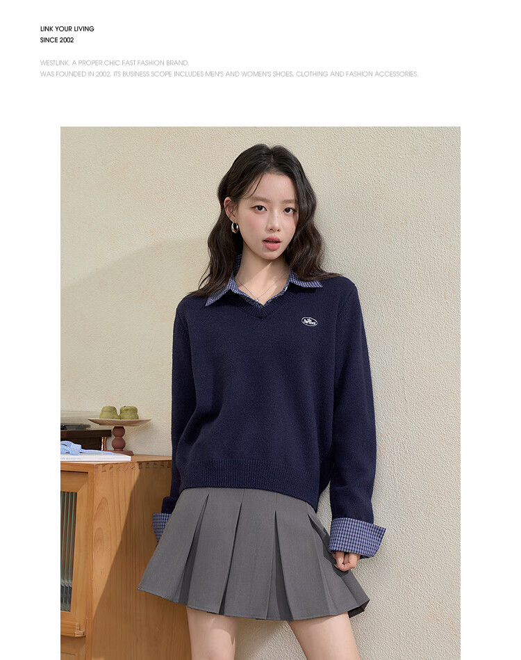 西遇(Westlink)假两件长袖针织衫女秋季新款格纹拼接翻领慵懒风毛衣 宝蓝色 (预售15天) M (160)