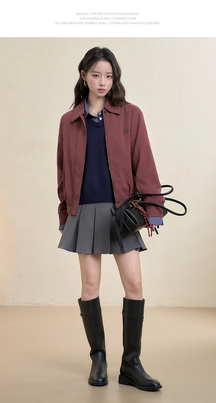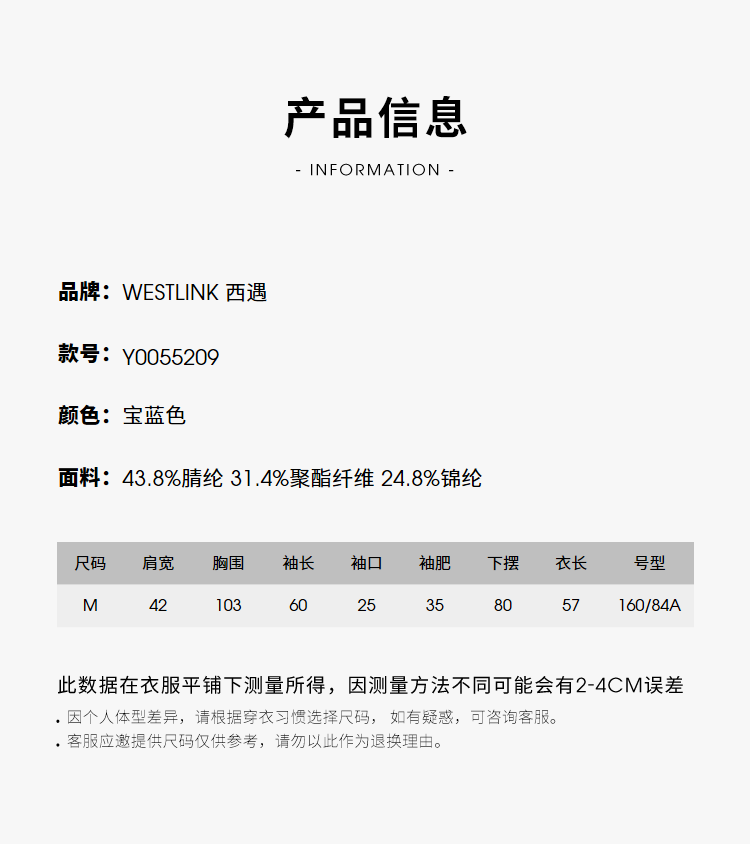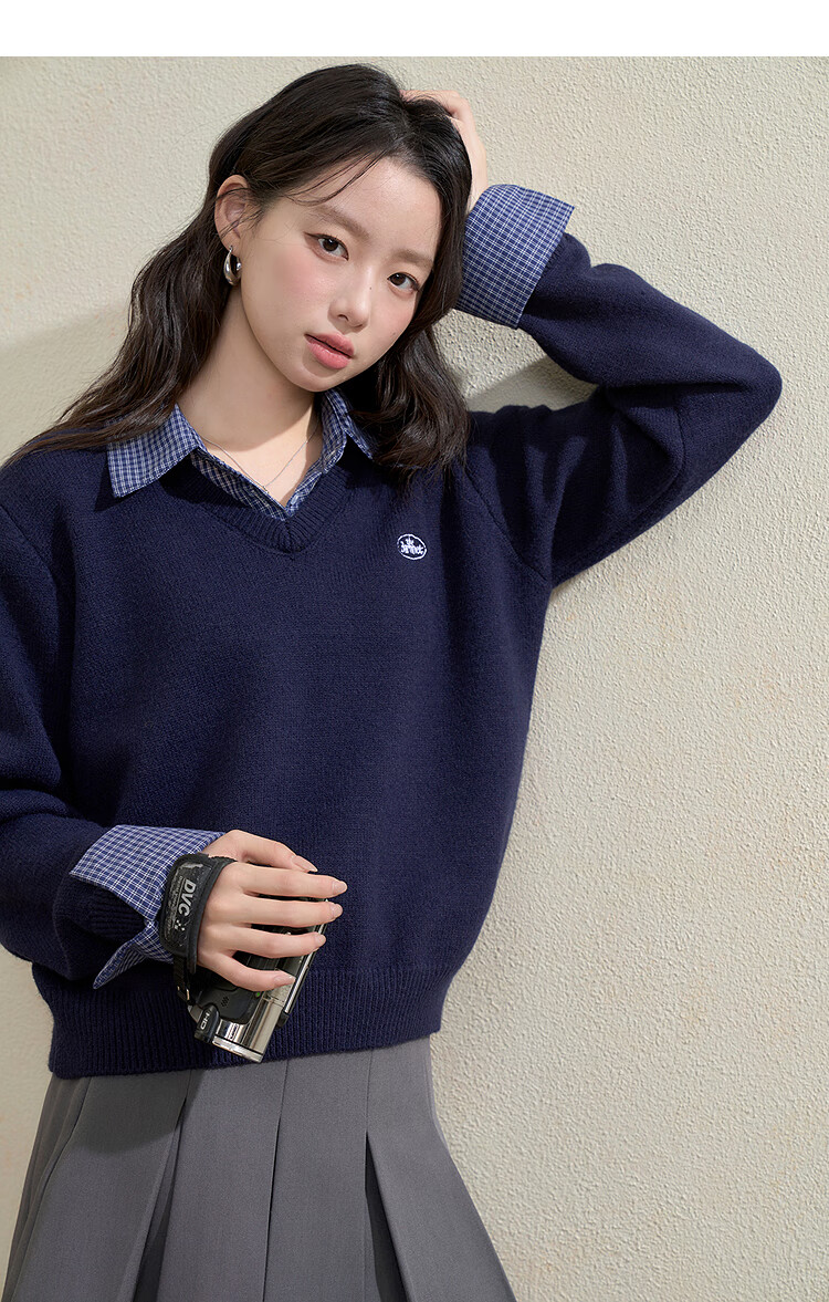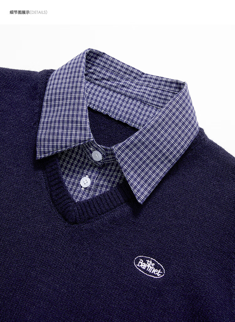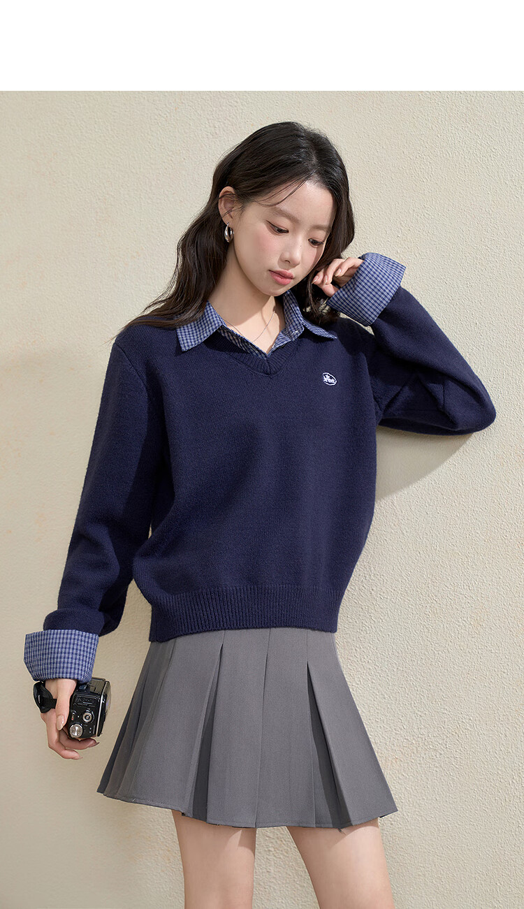 西遇(Westlink)假两件长袖针织衫女秋季新款格纹拼接翻领慵懒风毛衣 宝蓝色 (预售15天) M (160)