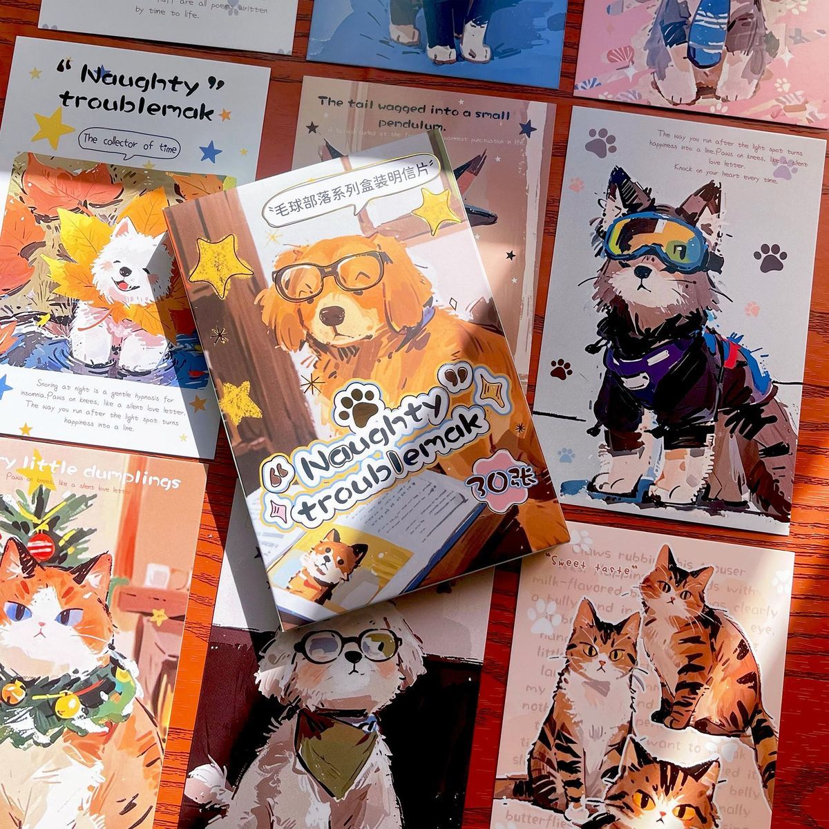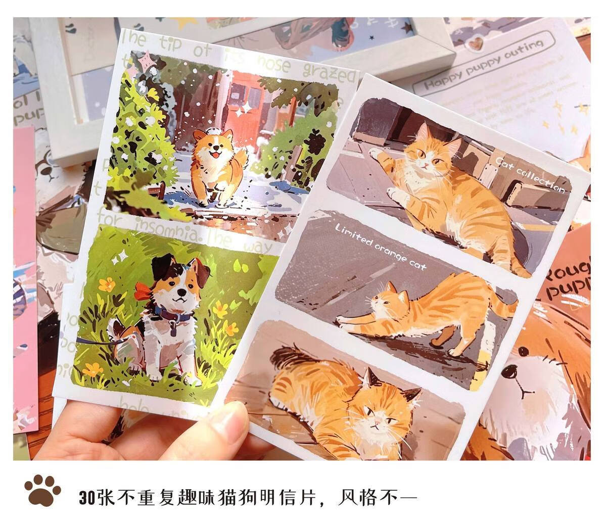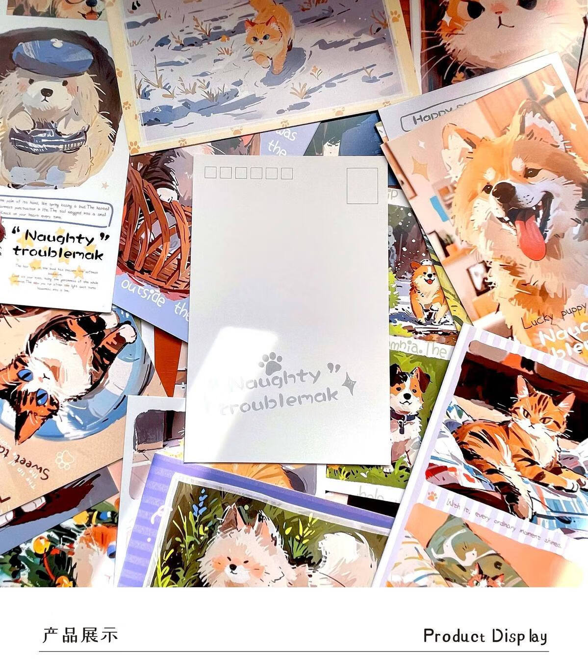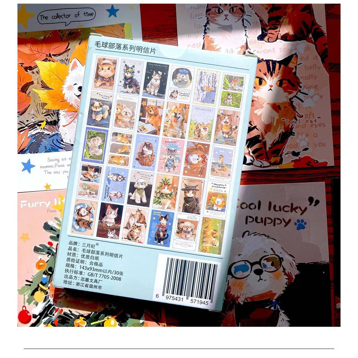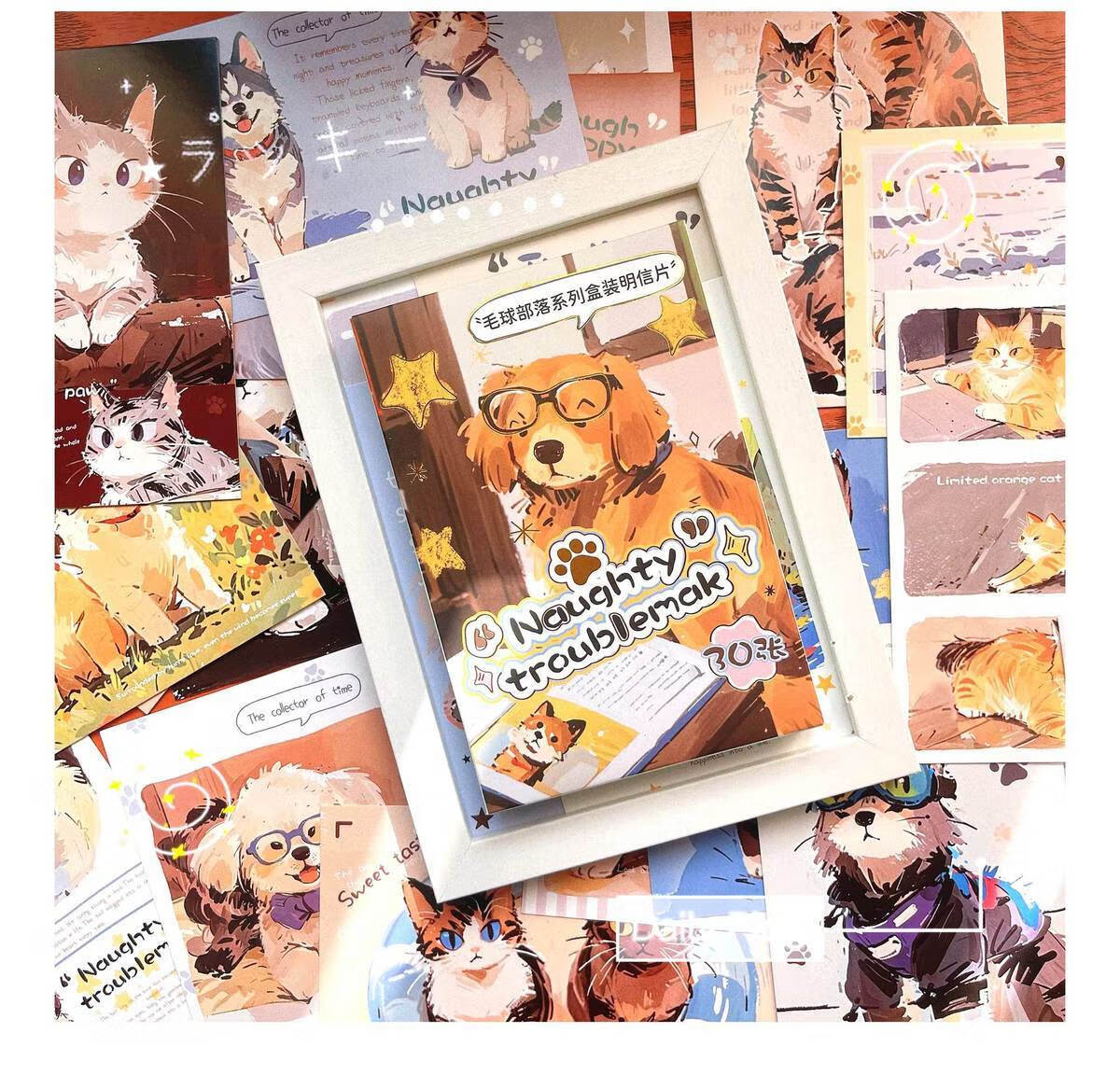 嘟嘟麦毛球部落盒装留言明信片卡通萌宠小狗小猫插画节日礼物装饰贺卡片 毛球部落-明信片30张入