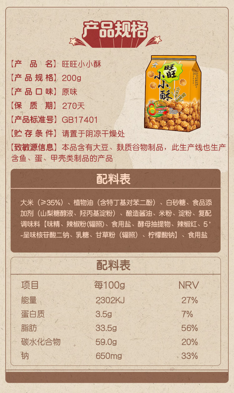 旺旺 小小酥 原味 200g 袋装 休闲膨化食品糕点零食酥脆饼干