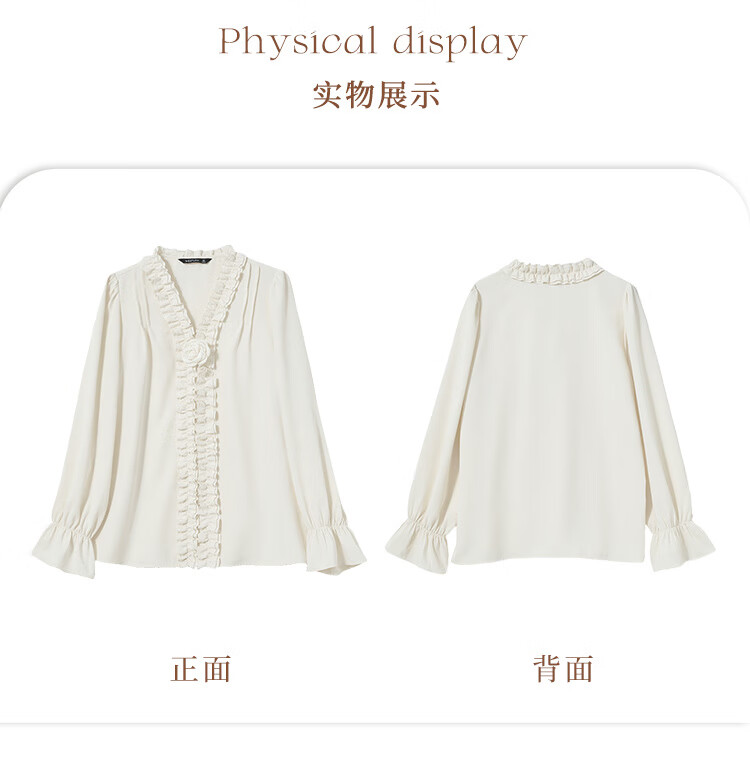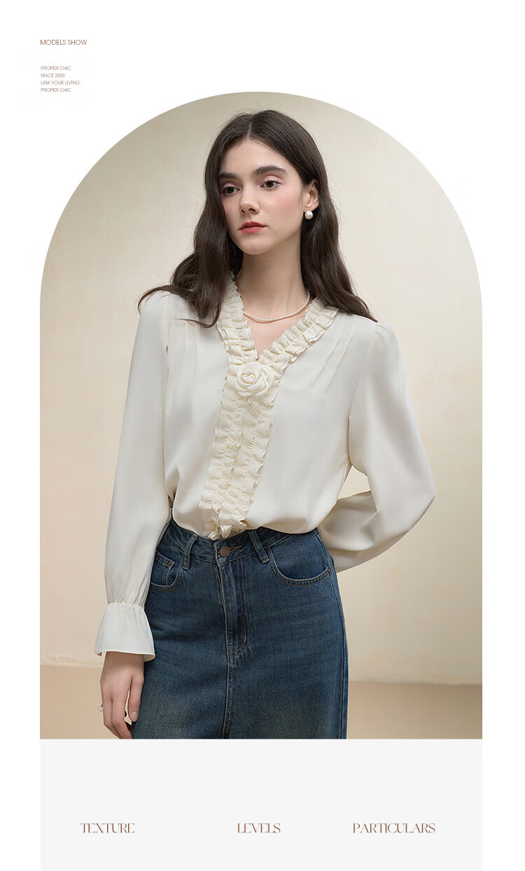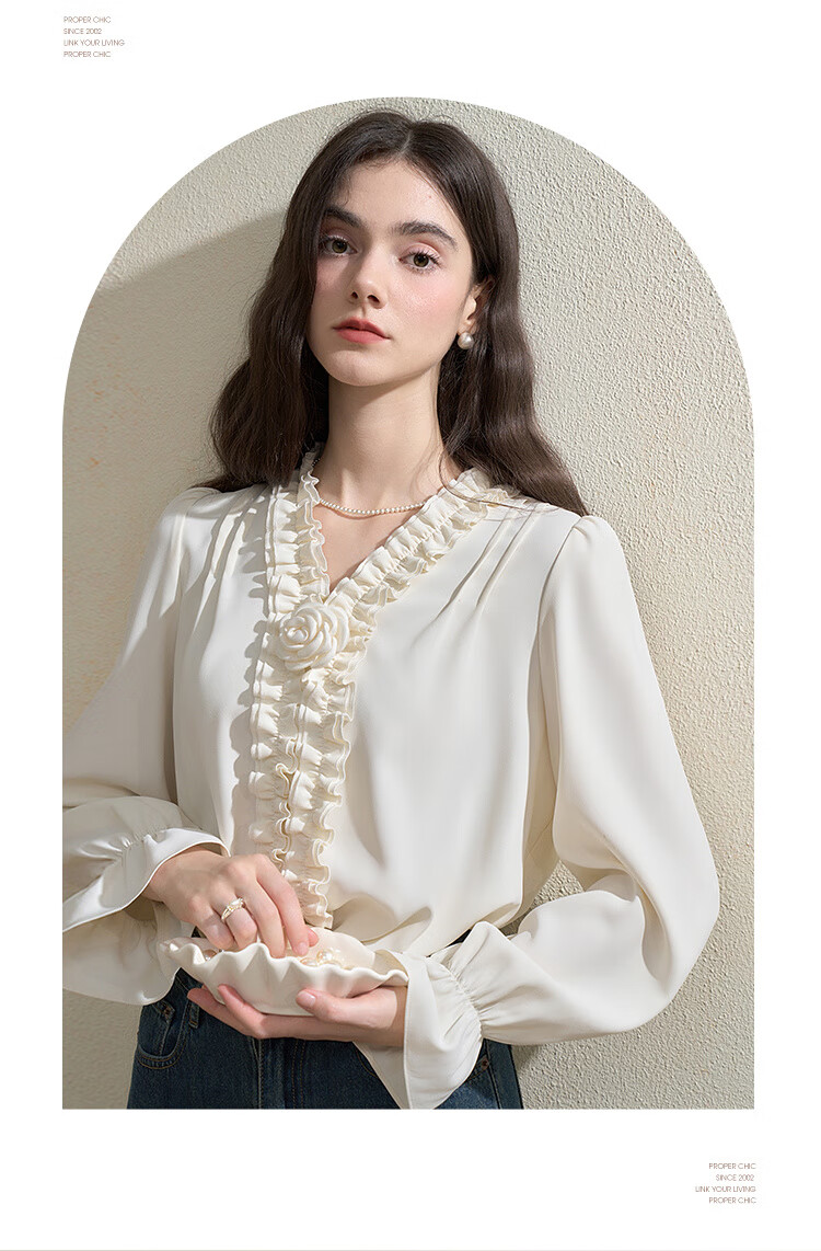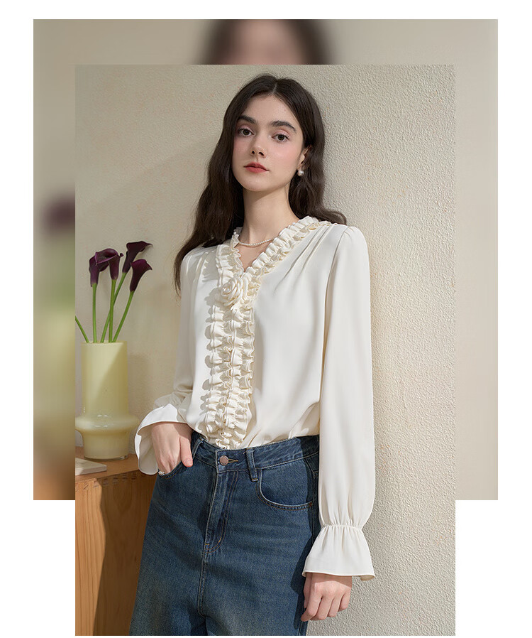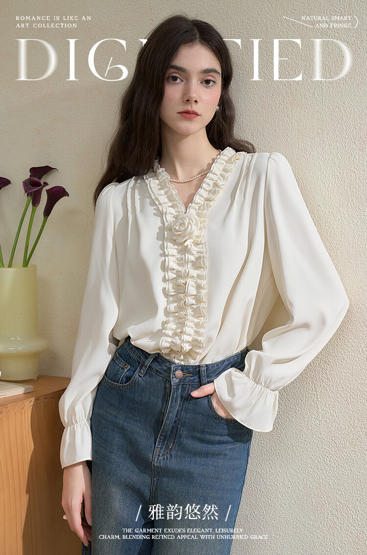 西遇法式重工木耳花边玫瑰通勤衬衫女2025秋季设计感垂感长袖上衣 杏色 M (160)