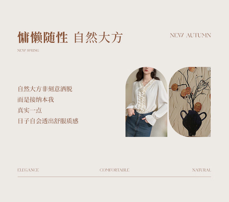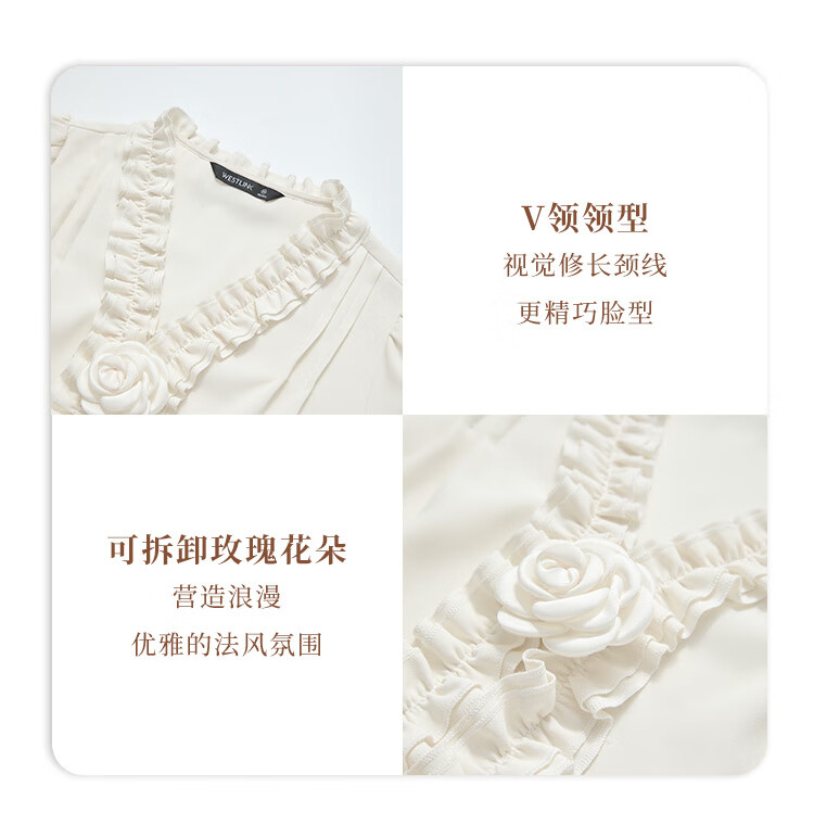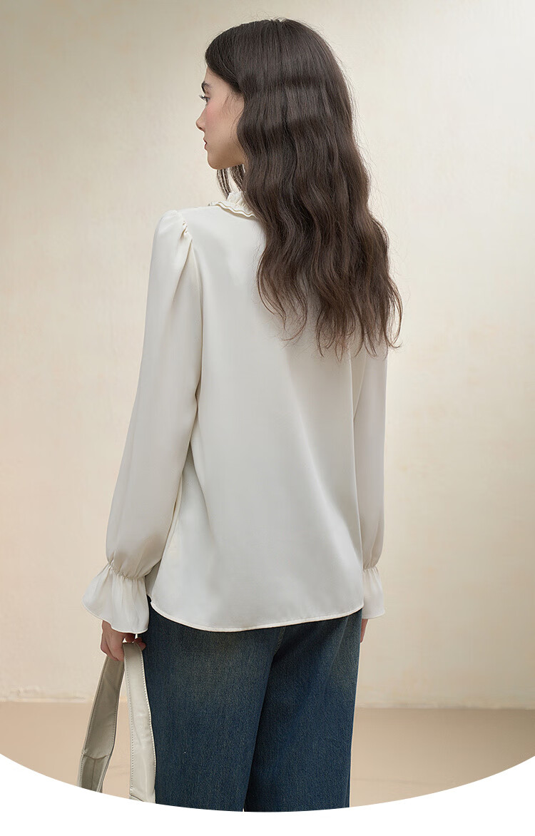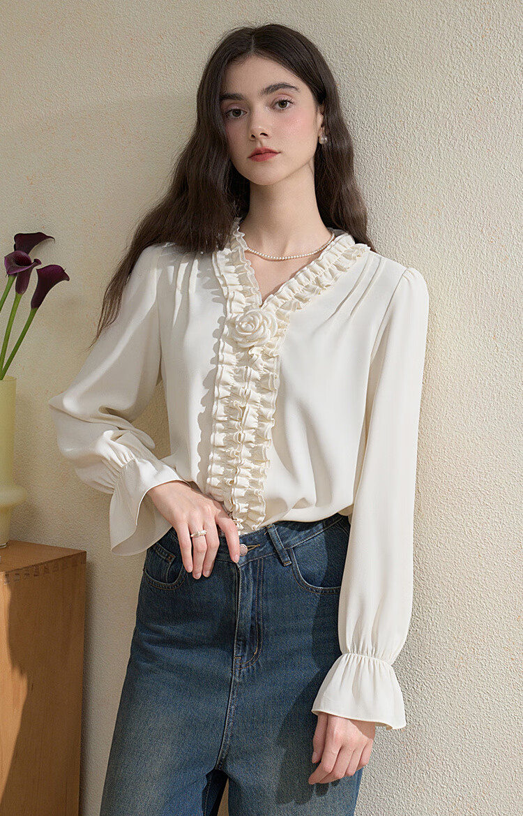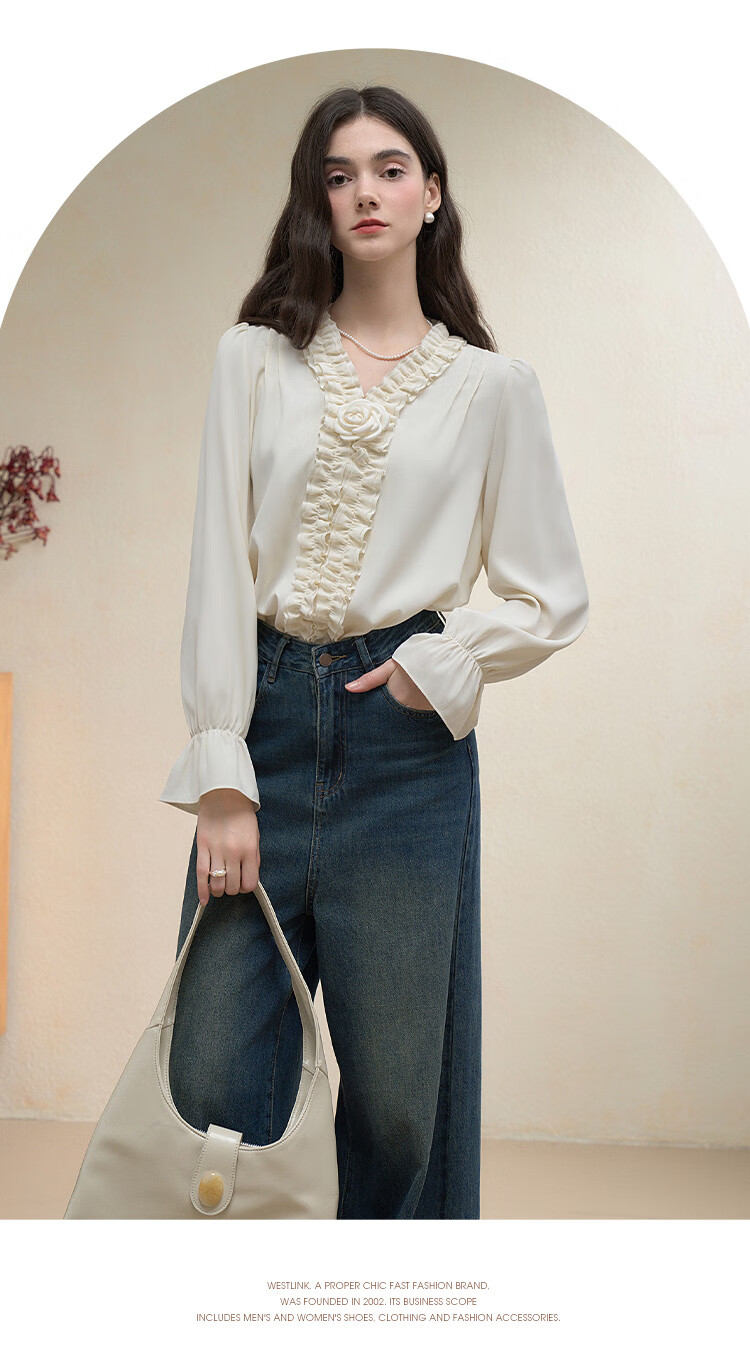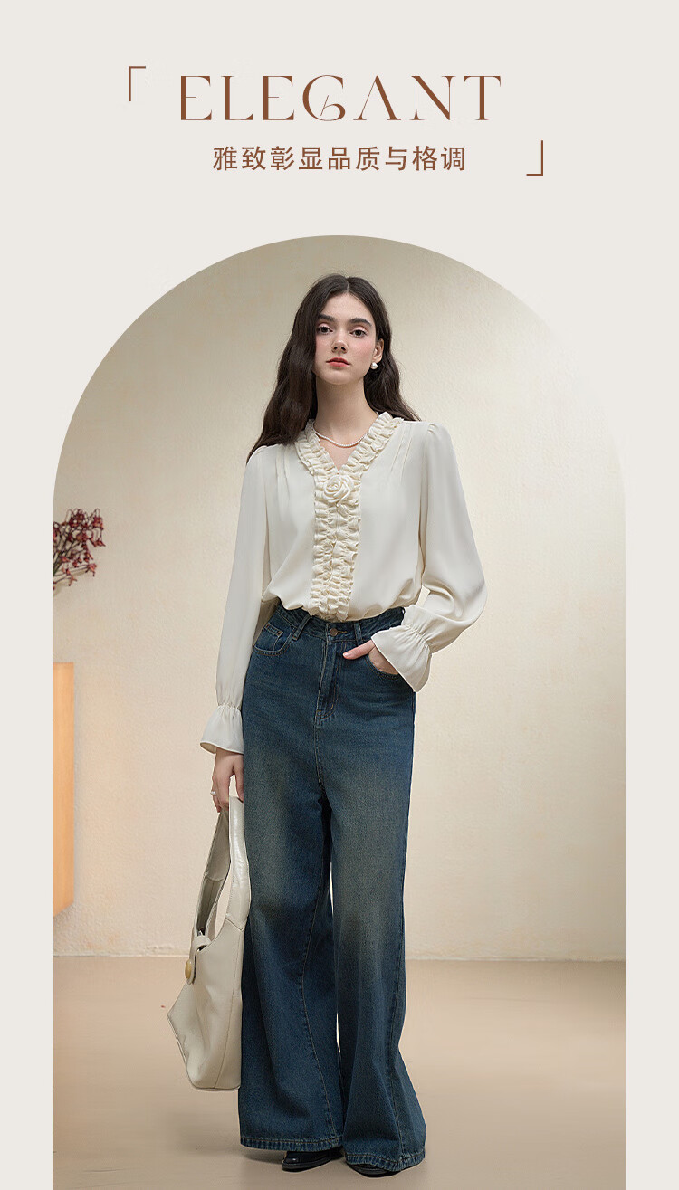 西遇法式重工木耳花边玫瑰通勤衬衫女2025秋季设计感垂感长袖上衣 杏色 M (160)