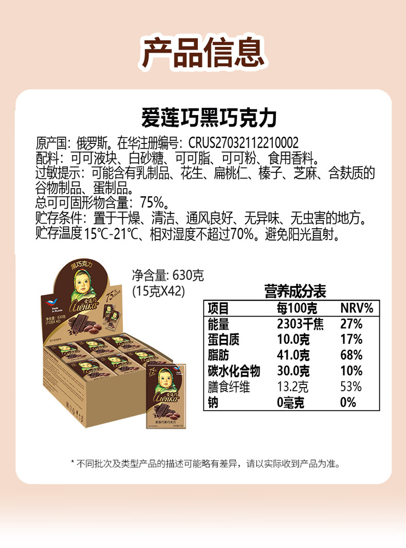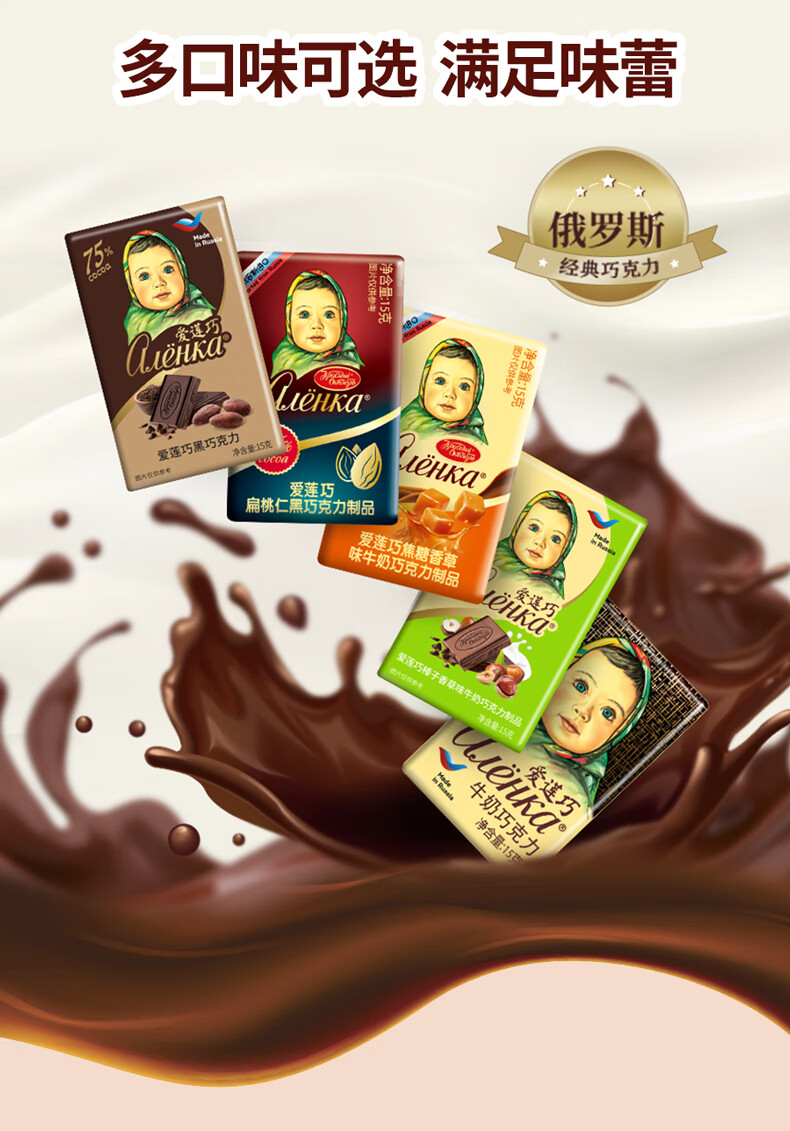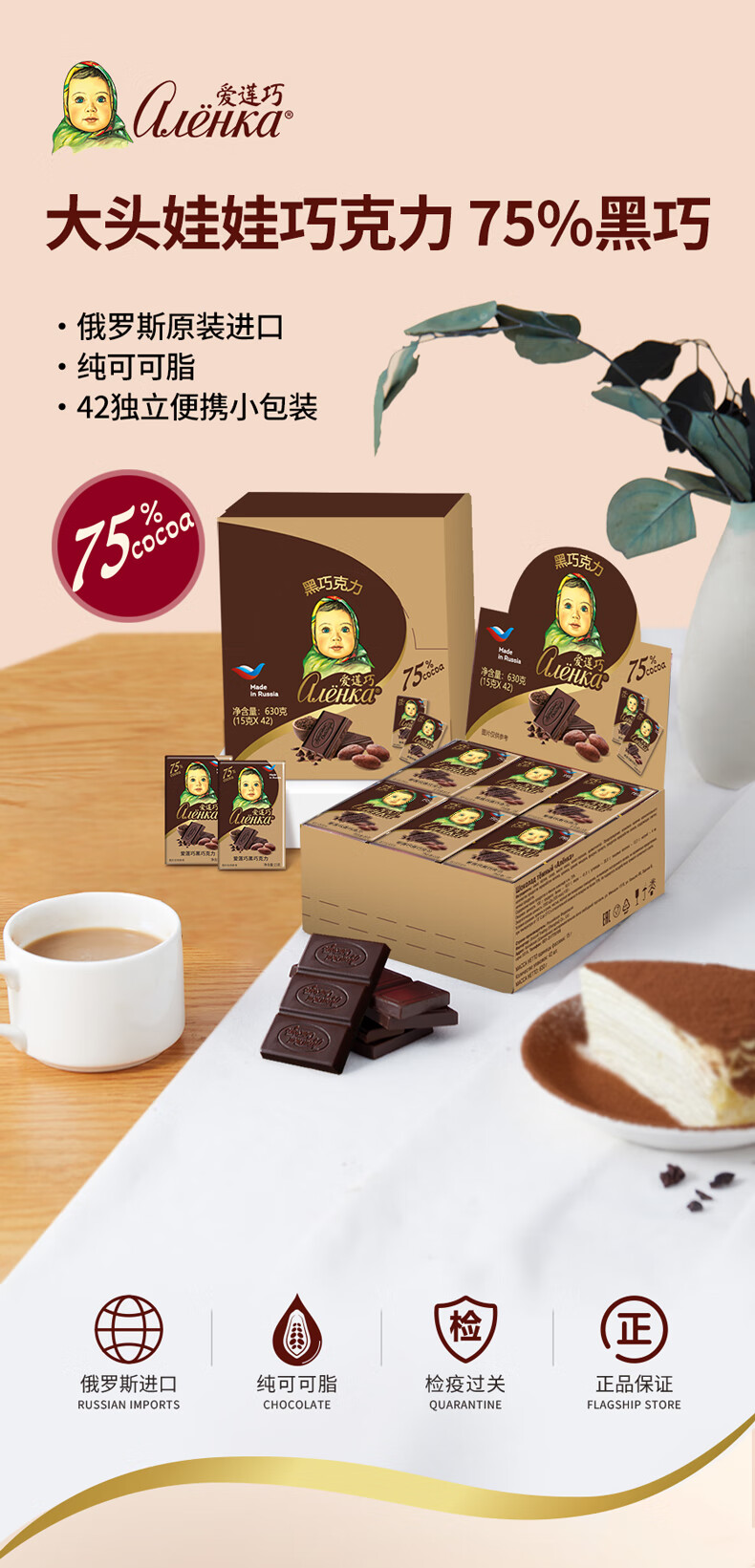 爱莲巧75%黑巧15g*42俄罗斯进口巧克力 大头娃娃 休闲零食 下午茶