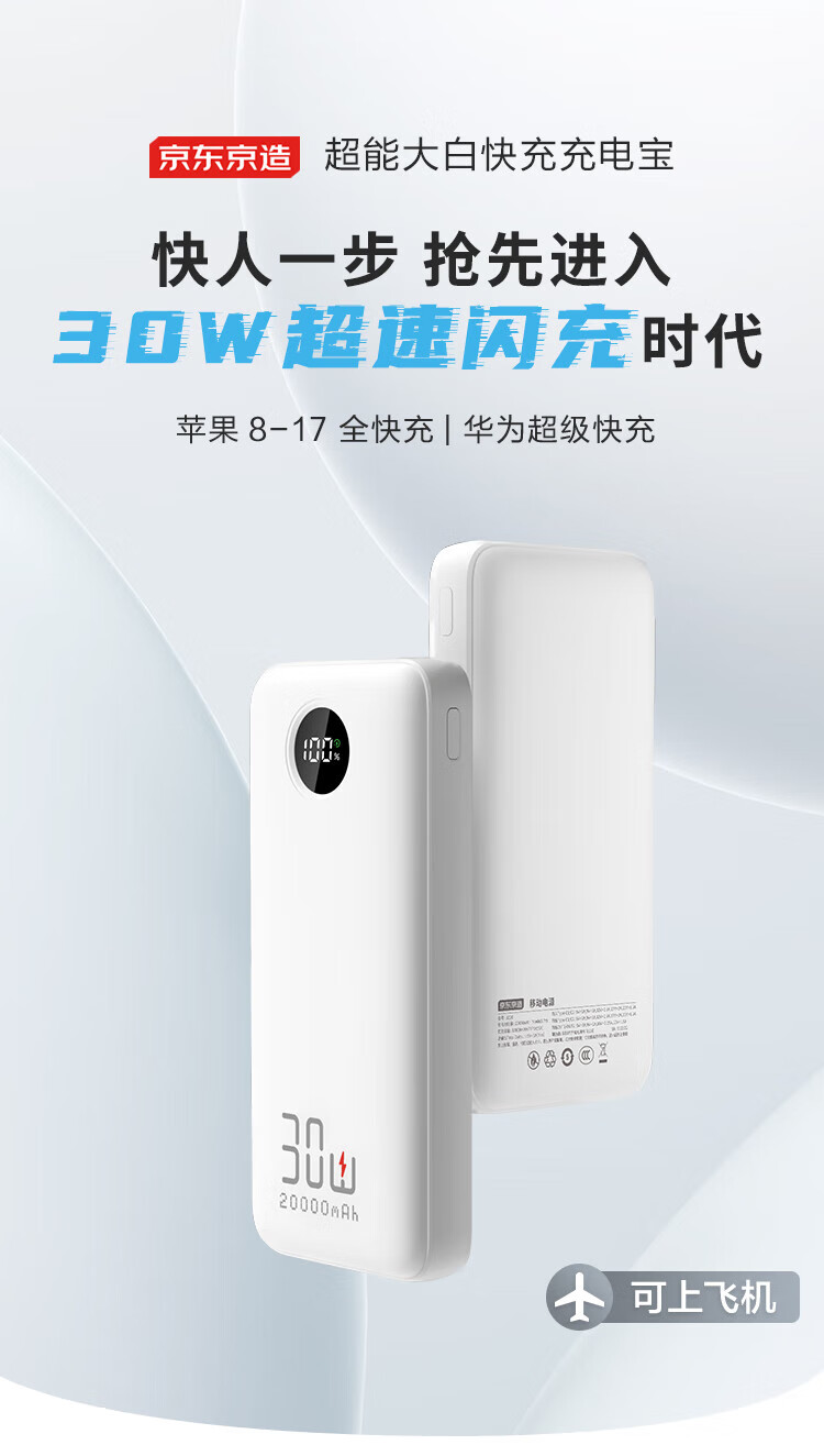 京东京造3c认证可上飞机充电宝20000毫安30W双向快充移动电源大容量适用户外苹果17小米17华为荣耀