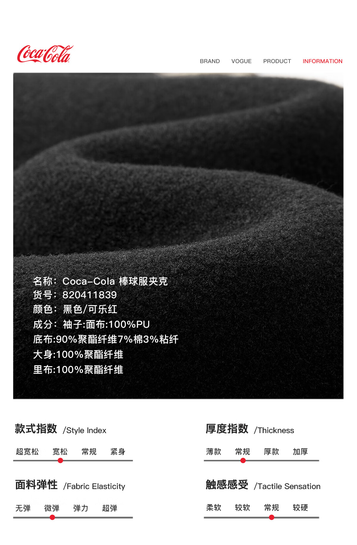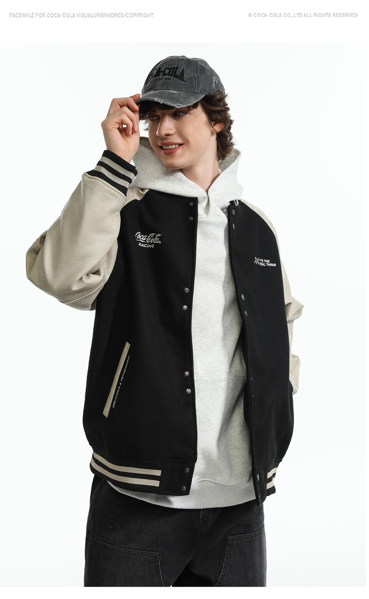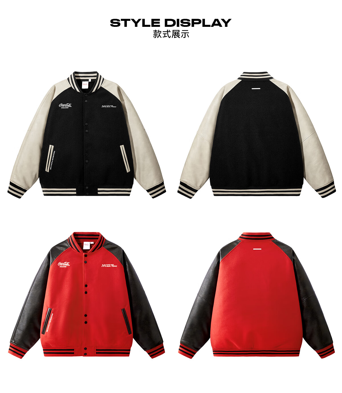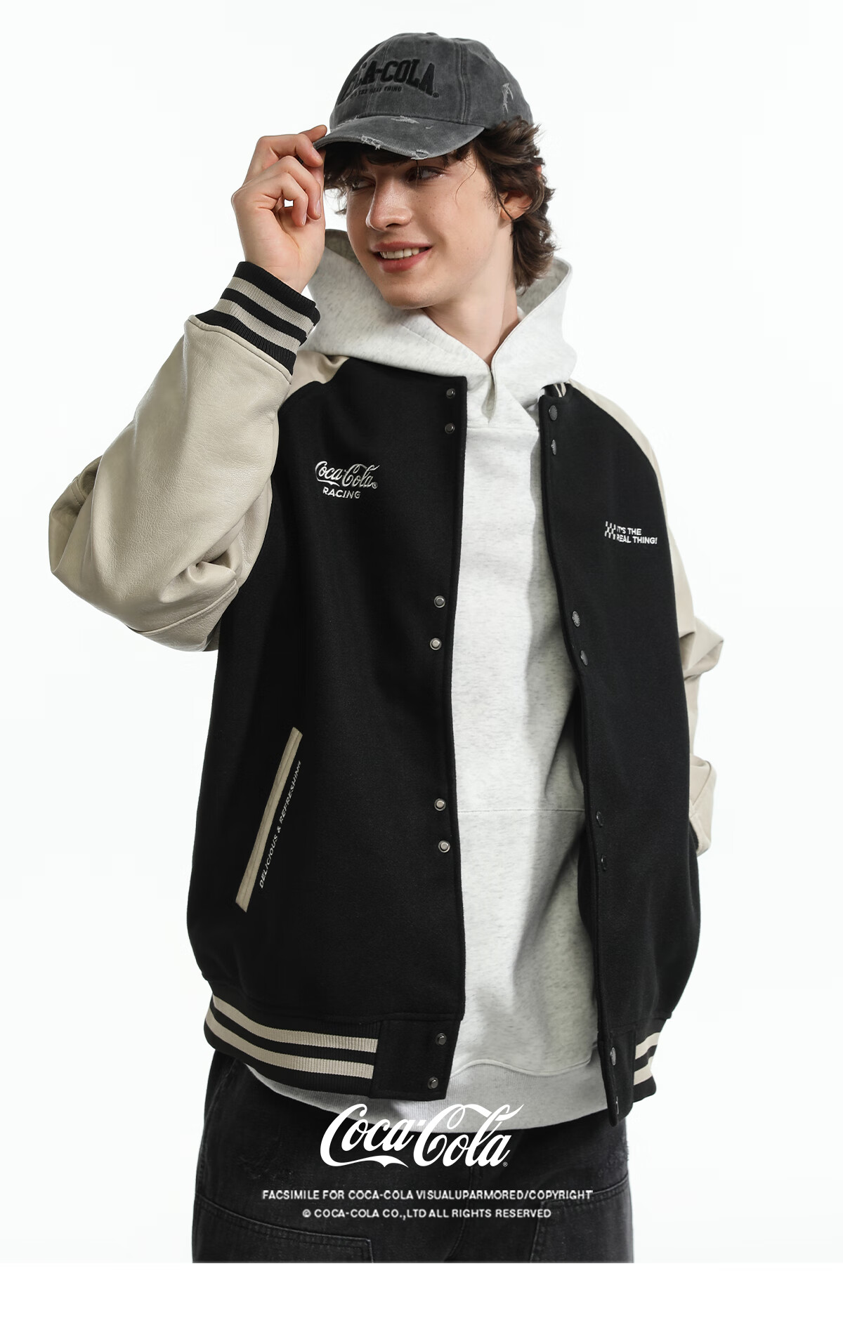 可口可乐(Coca-Cola) PU皮夹克男美式刺绣春秋款外套毛呢棒球服女 黑色 S