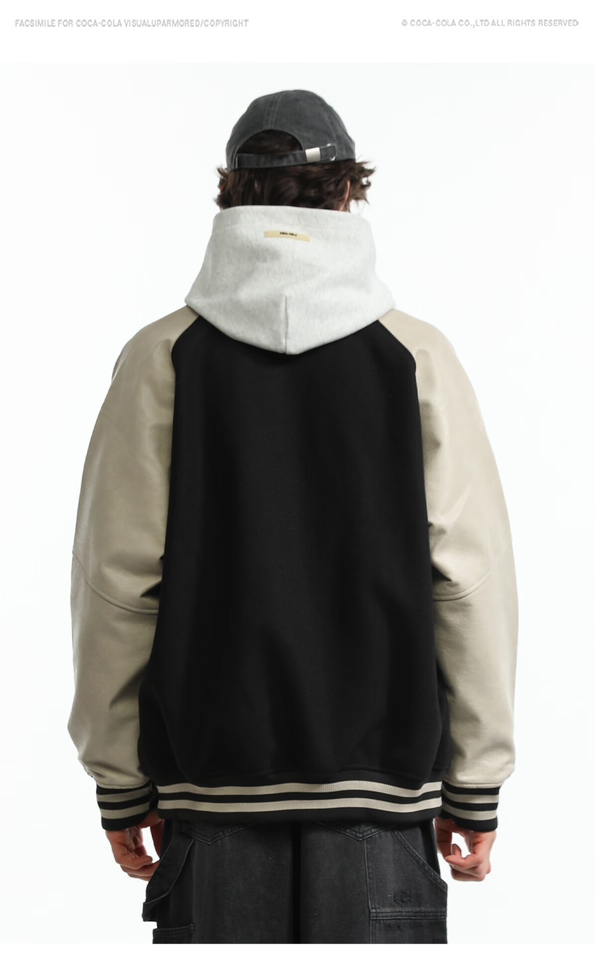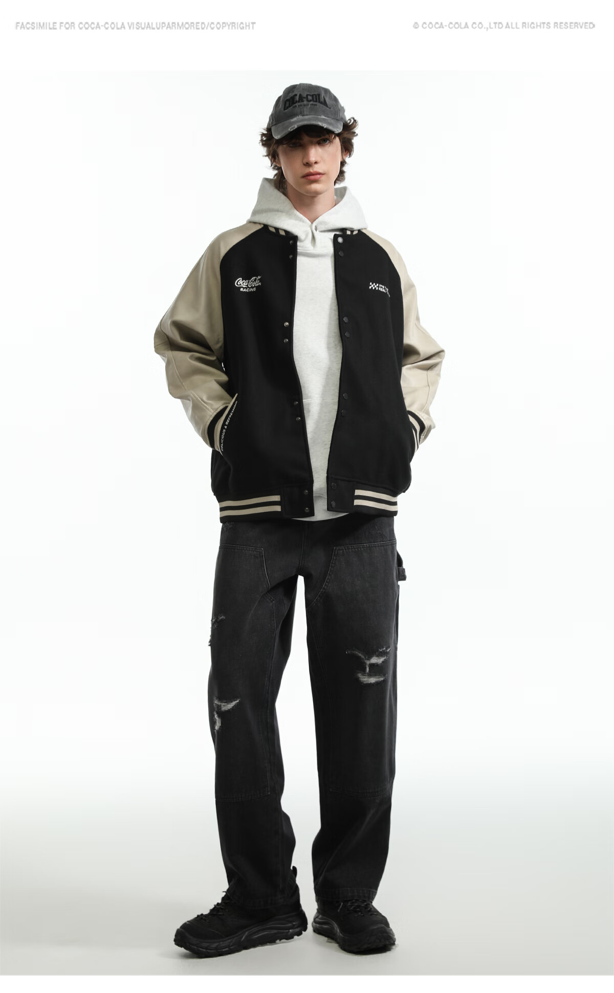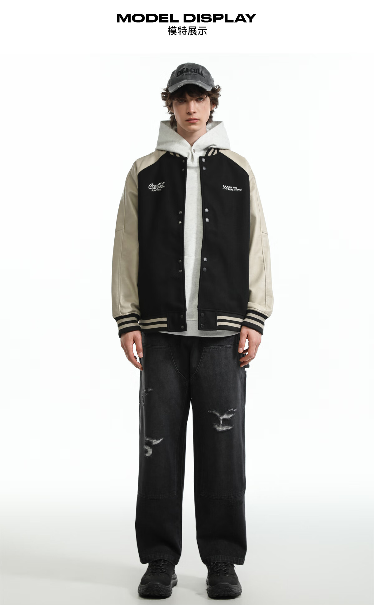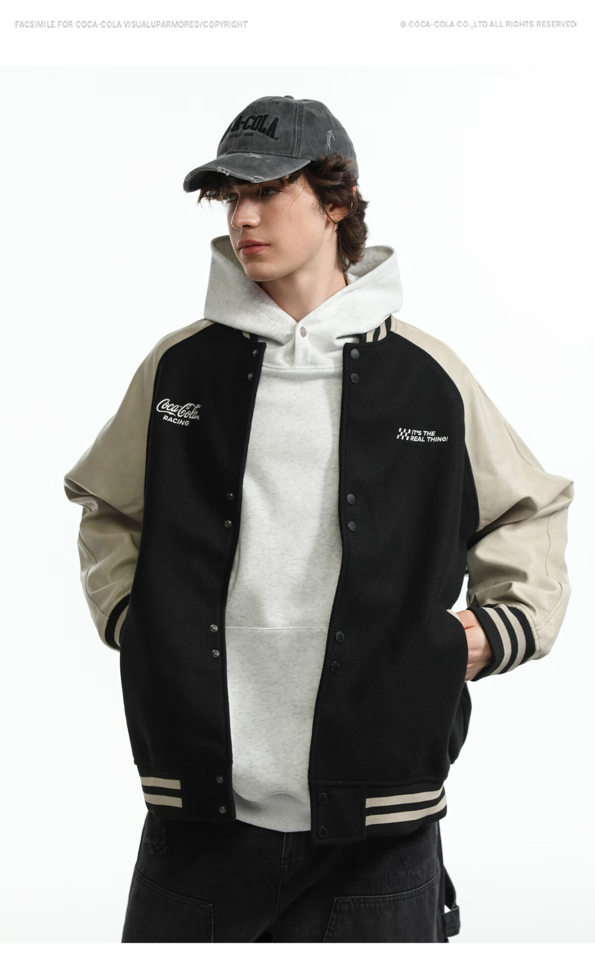 可口可乐(Coca-Cola) PU皮夹克男美式刺绣春秋款外套毛呢棒球服女 黑色 S