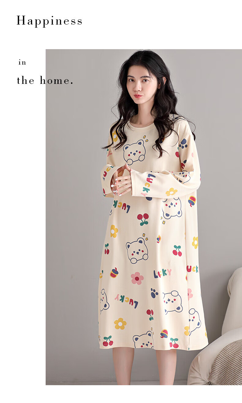 芬腾睡裙女2025秋新款纯棉亲肤圆领长袖卡通少女连衣裙长裙外穿 杏色 2XL
