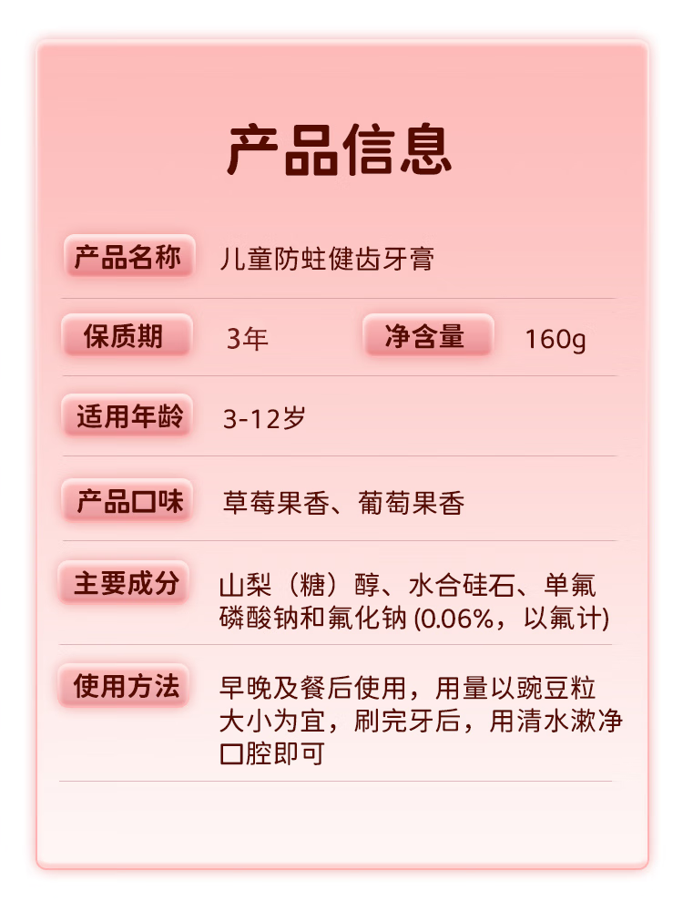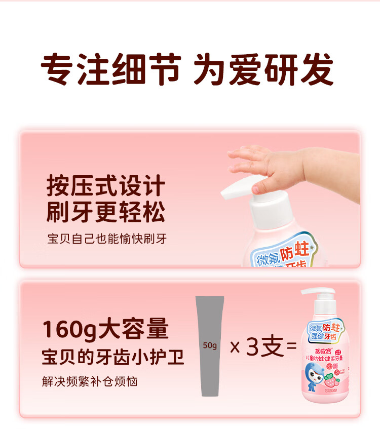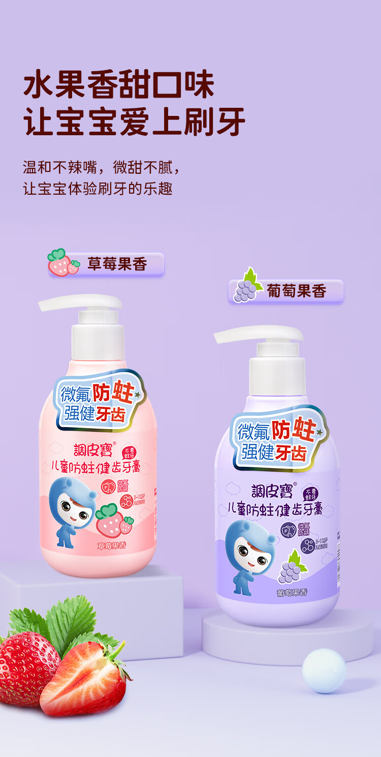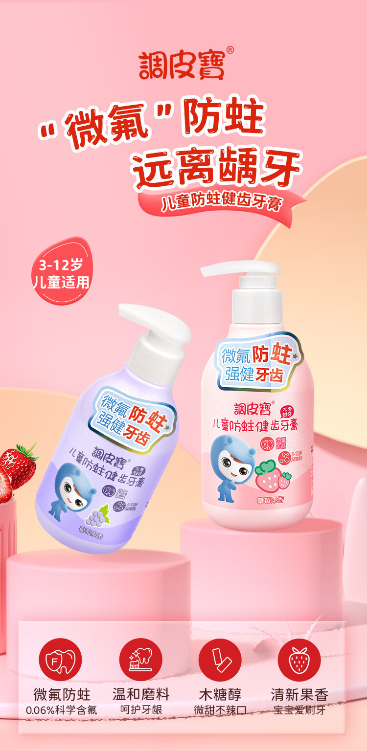 调皮宝儿童牙膏宝宝按压式牙膏3-6-12岁换牙期含氟防蛀牙膏草莓味160g