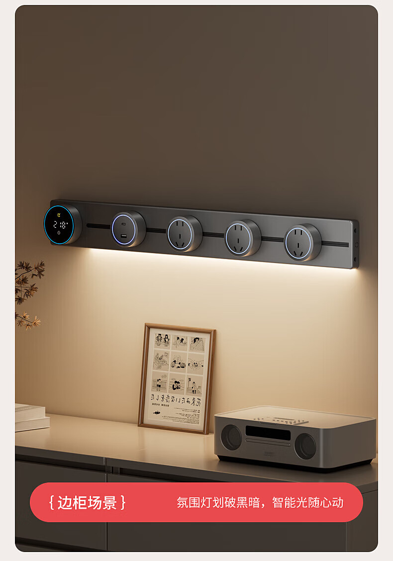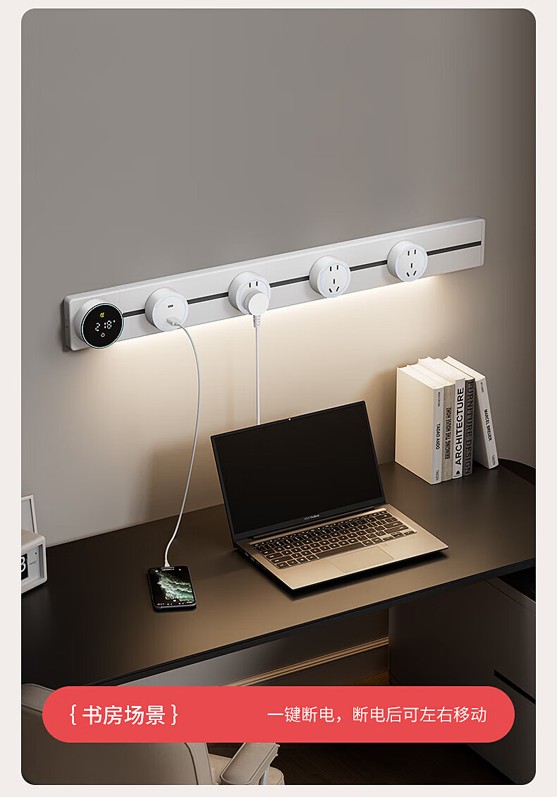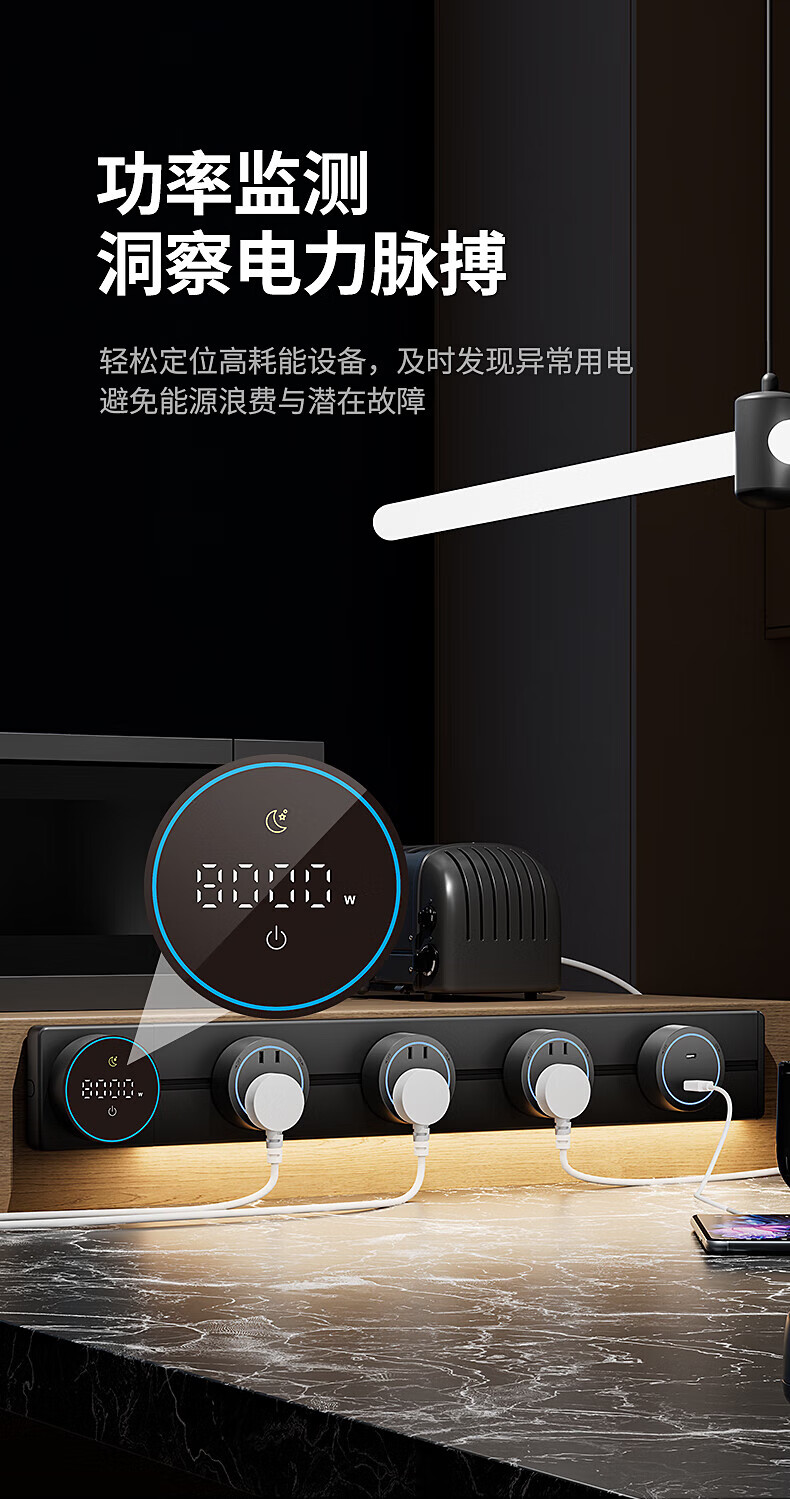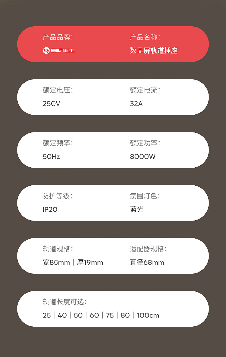 国际电工厨房滑动轨道插座移动插排免打孔明装扩展插座智能数显屏电力轨道 【一键断电数显款】50cm+4大五孔(带灯)