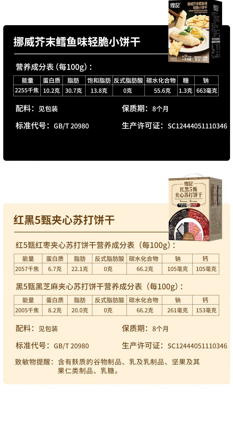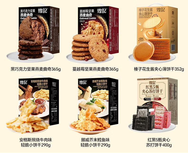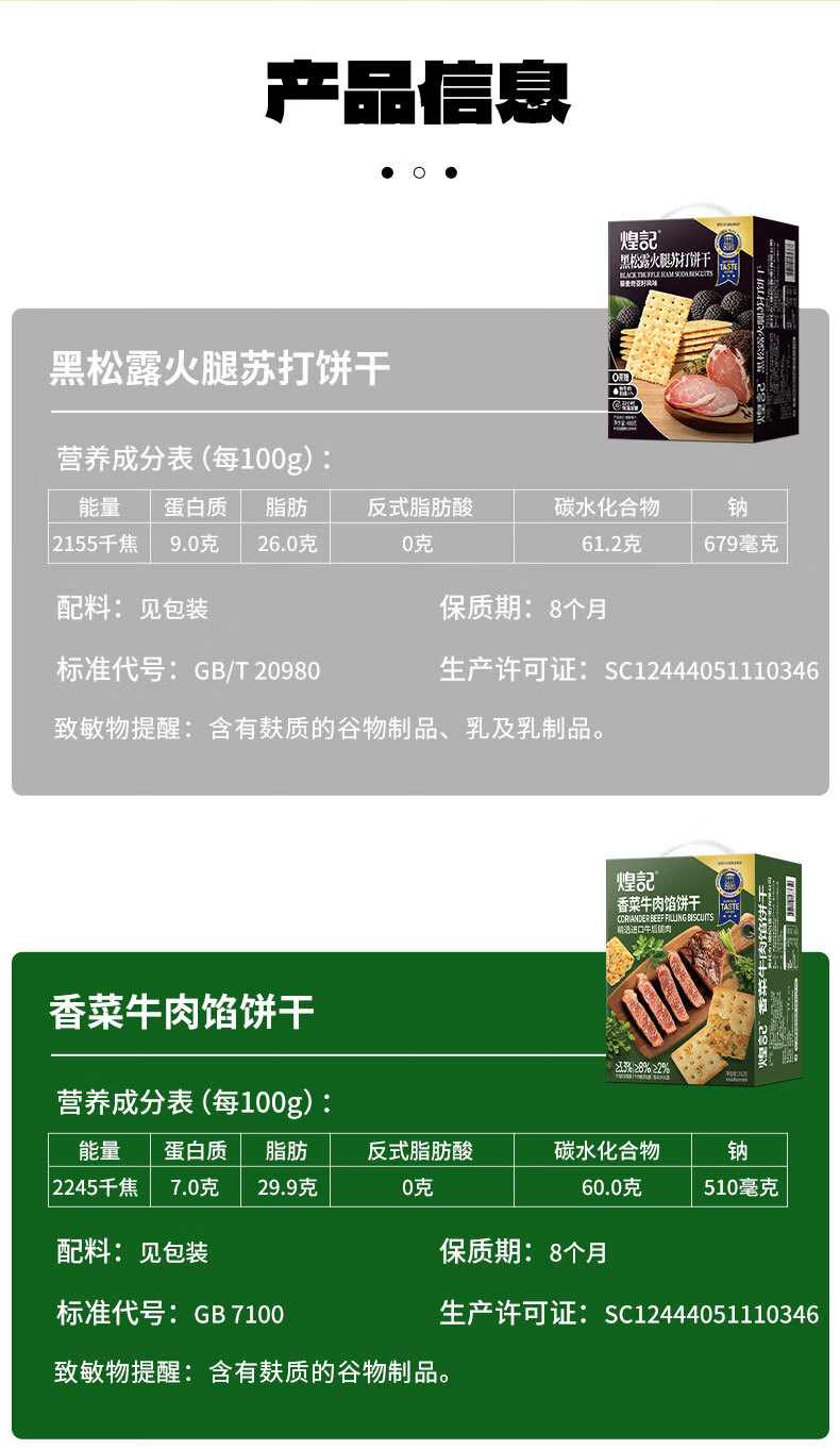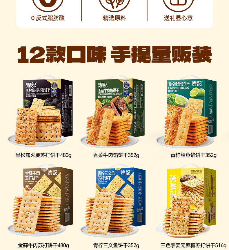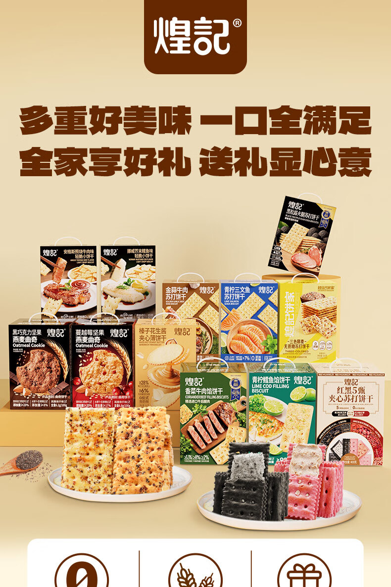 煌记黑松露火腿苏打饼干年货礼盒小零食送礼节日薄饼香菜牛肉薄脆黑巧 高蛋白肉馅饼干405手提礼盒装