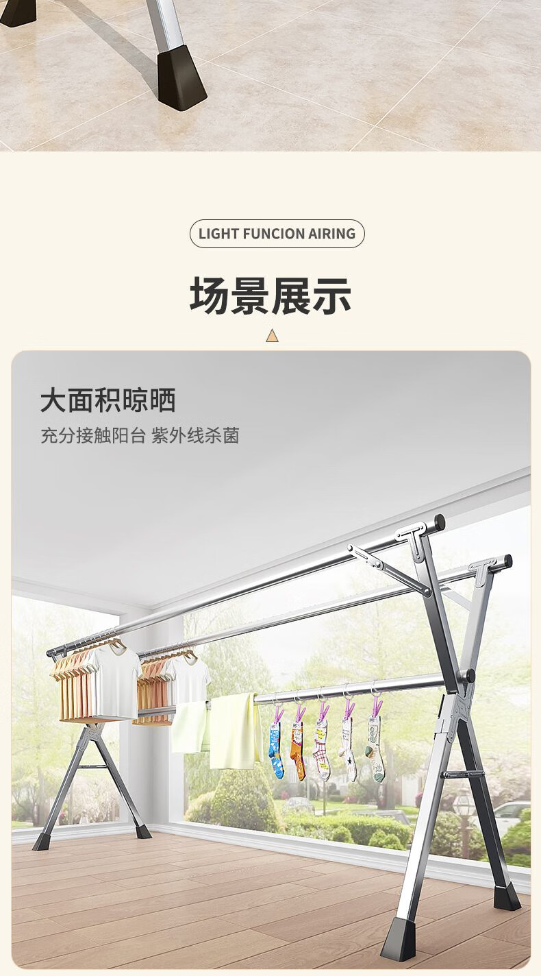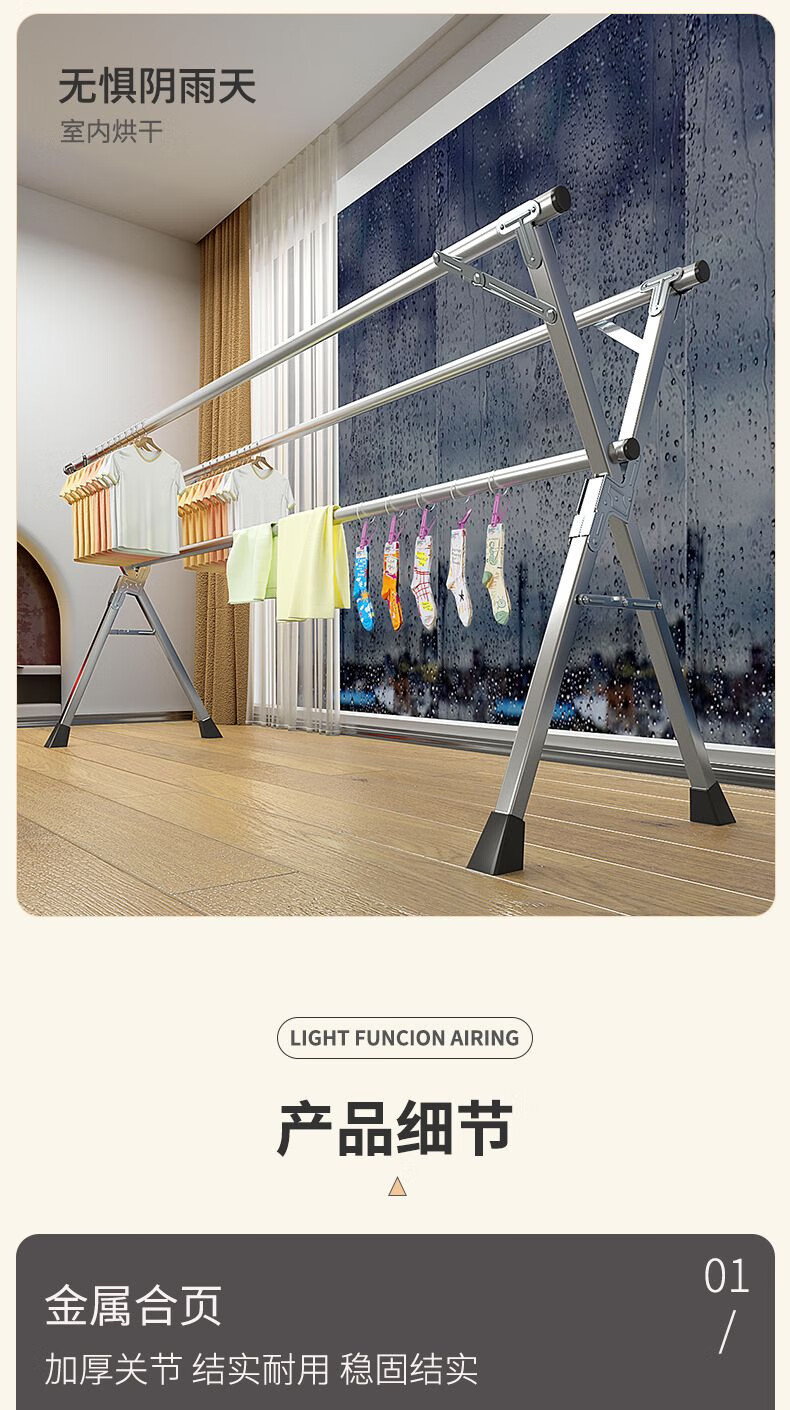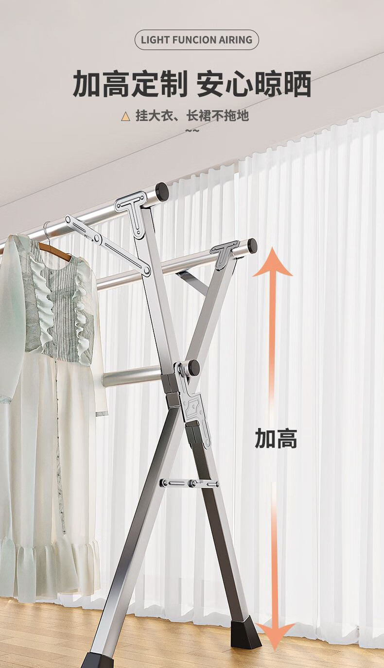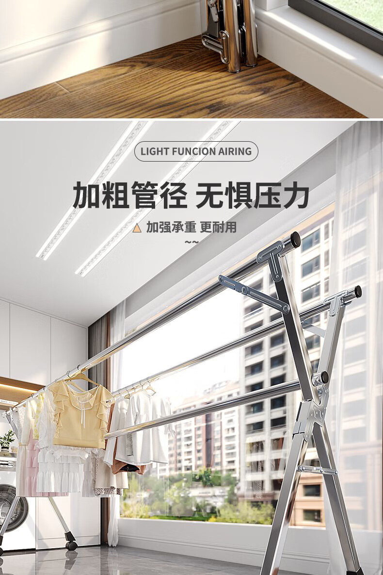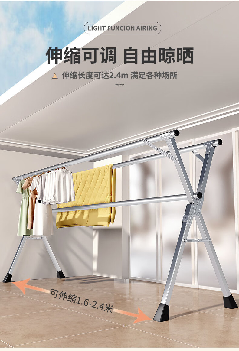 晾衣架落地折叠晾衣杆阳台伸缩室内凉衣架家用挂衣架神器加粗25管 特厚三杆伸缩2.4米