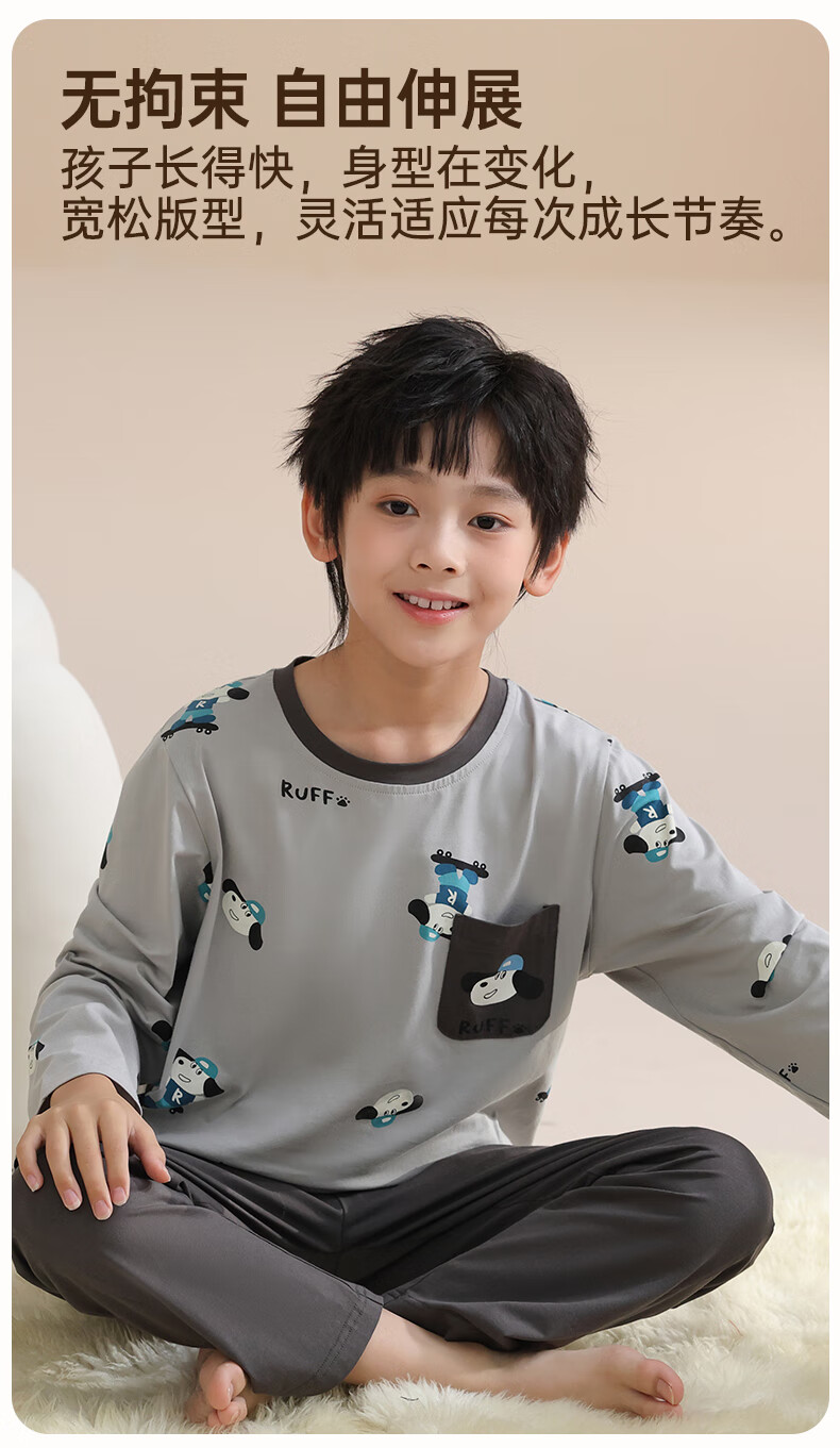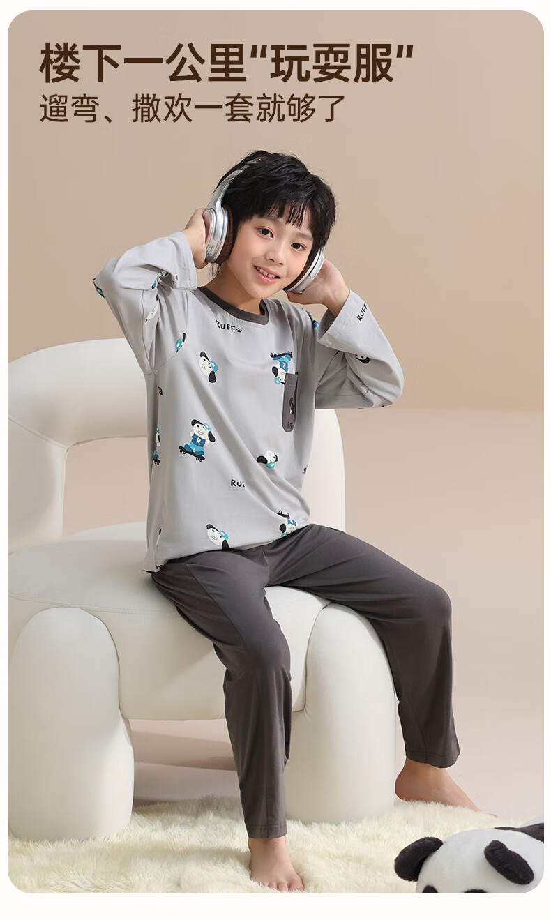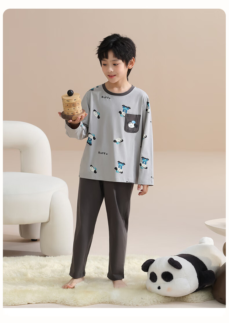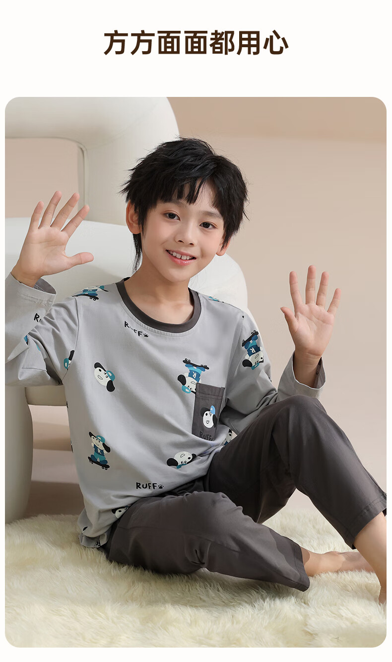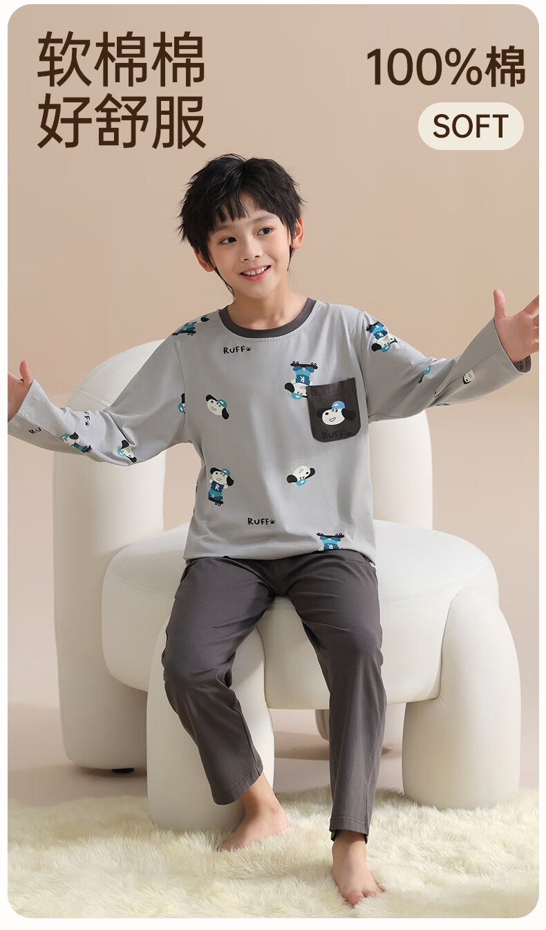 玛伦萨纯棉睡衣男童春秋季2025新款可外穿青少年学生长袖长裤家居服套装 灰色 S 120cm