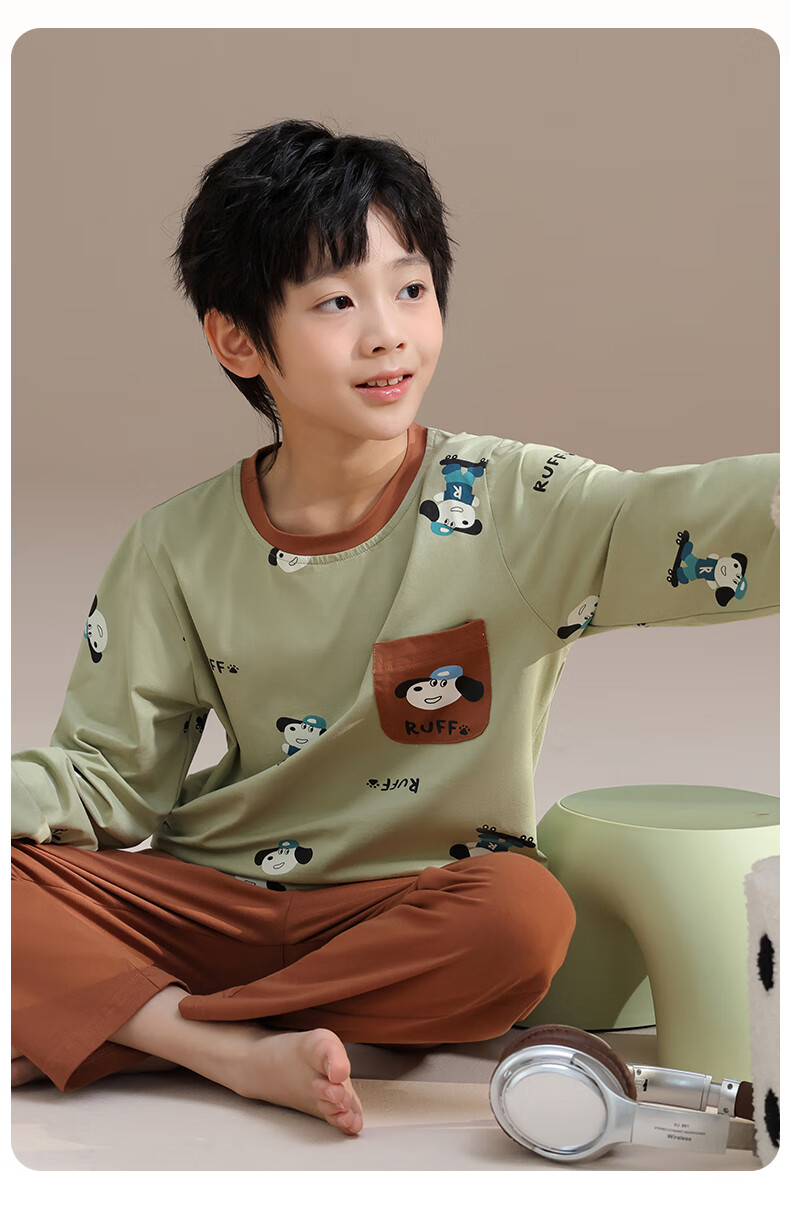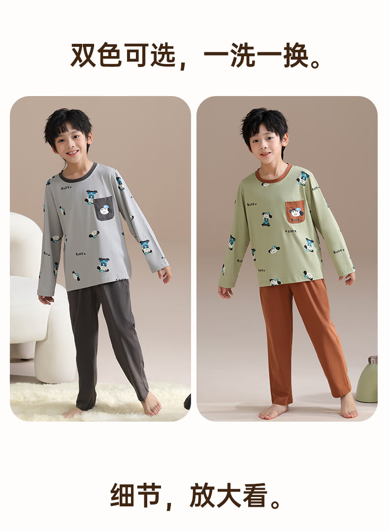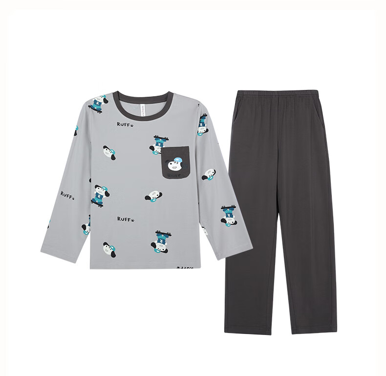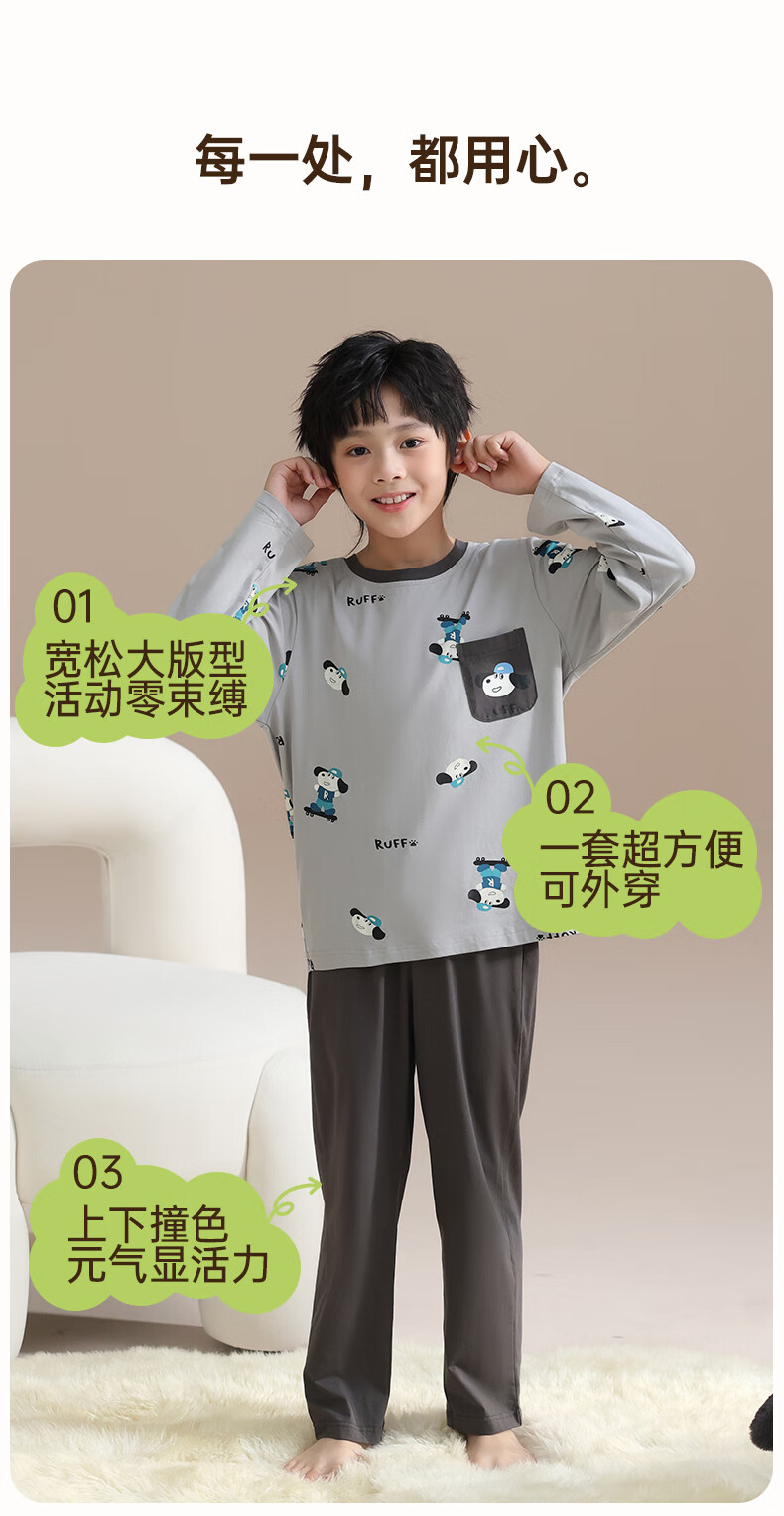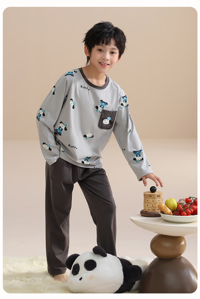 玛伦萨纯棉睡衣男童春秋季2025新款可外穿青少年学生长袖长裤家居服套装 灰色 S 120cm