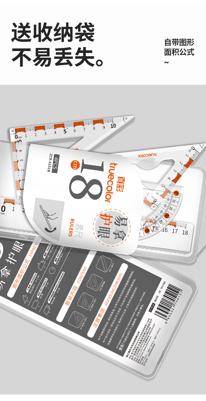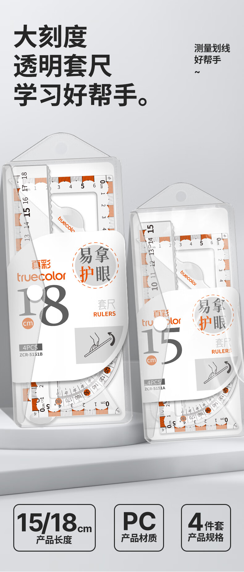 真彩(TRUECOLOR)尺子套装小学生专用套尺大数字刻度三角尺量角器直尺高透明学生考试几何绘图开学文具四件套5151A