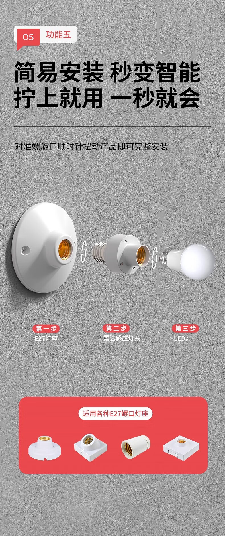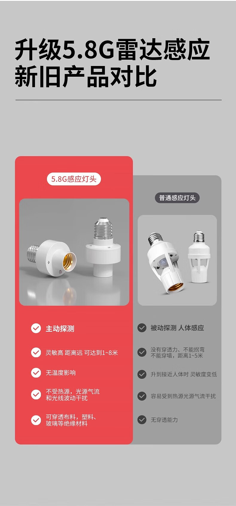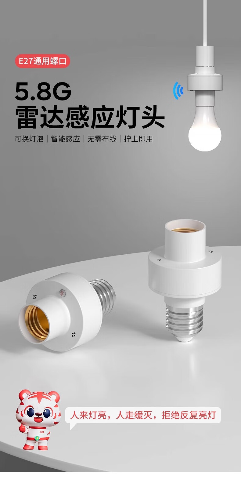 国际电工车库微波雷达感应灯头厕所人体智能感应器走廊楼道E27螺口灯座 5.8G雷达感应灯头【无灯泡】