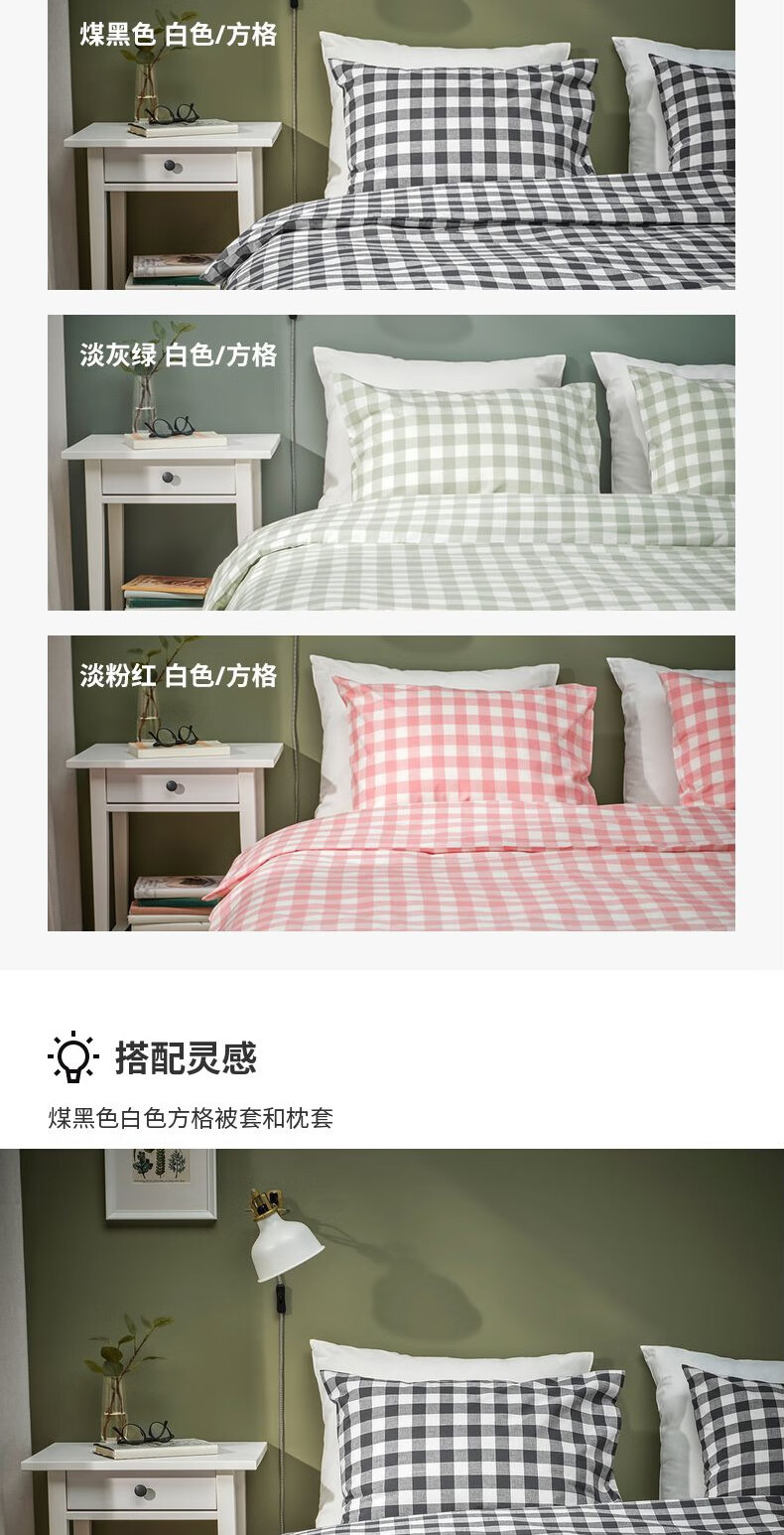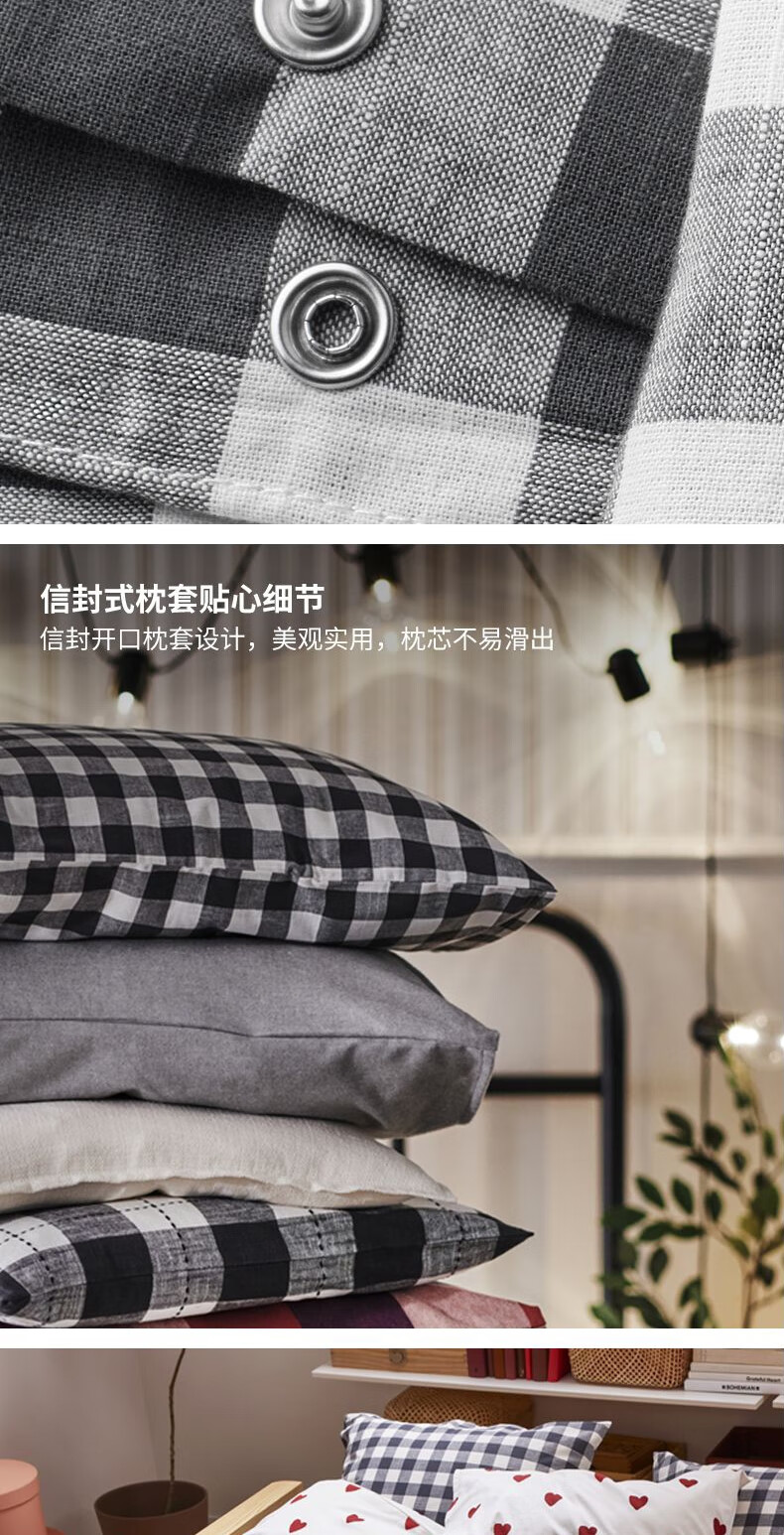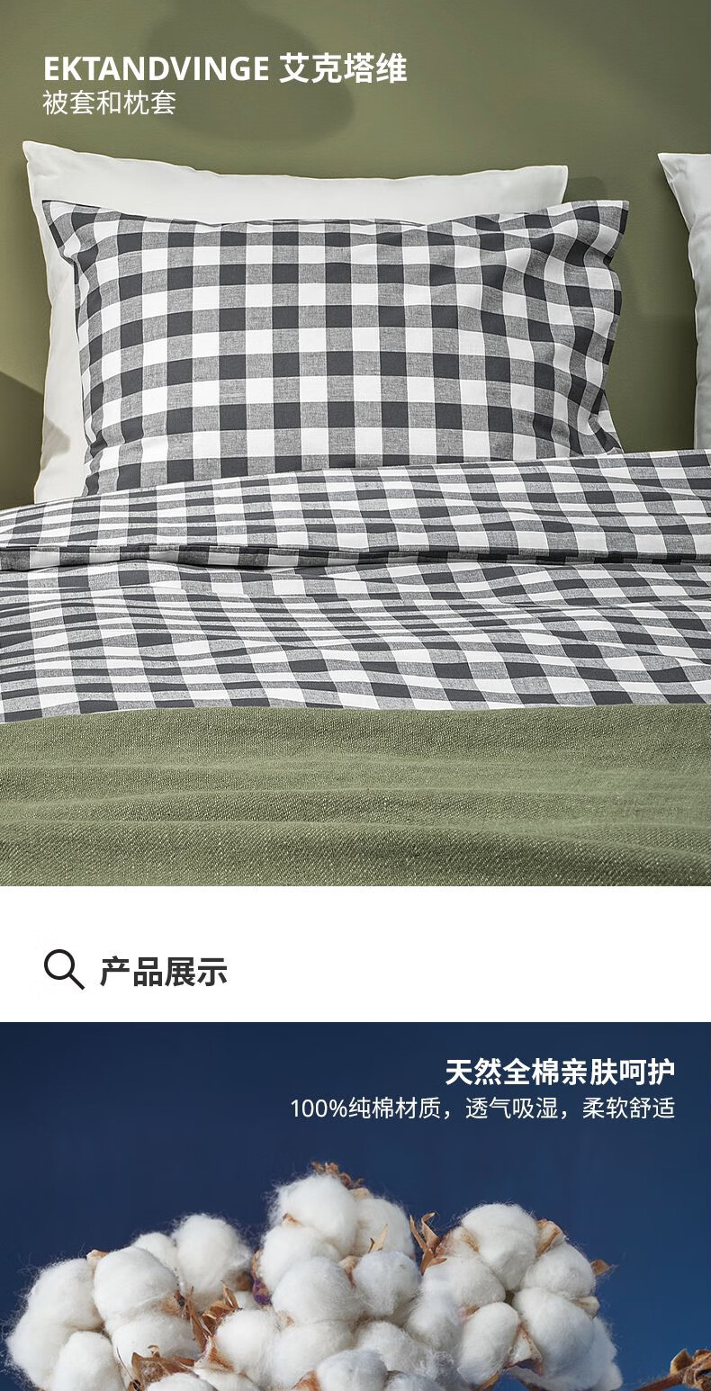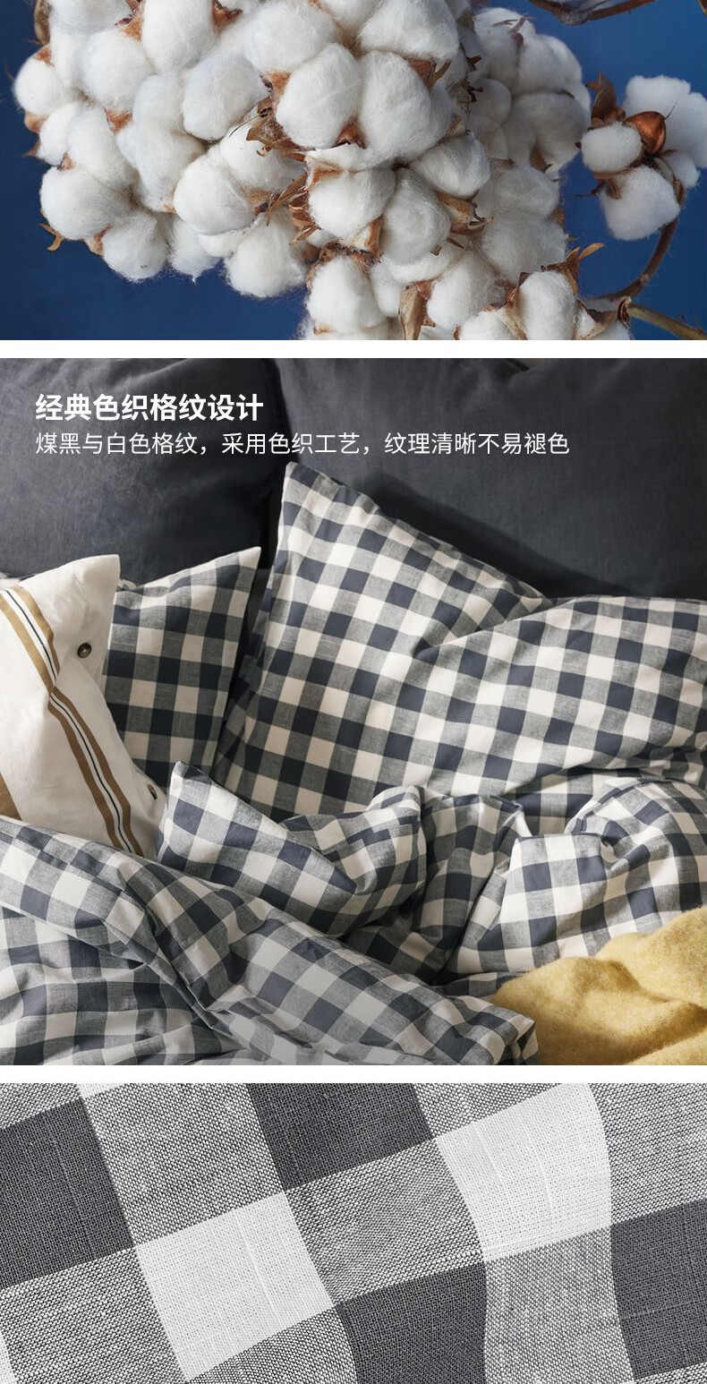宜家(IKEA)【新品】EKTANDVINGE艾克塔维枕套纯棉网格可机洗被套 煤黑白方格被套和2枕套240X220cm+白色床笠1.8m床