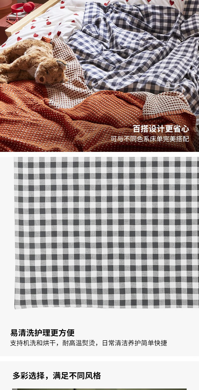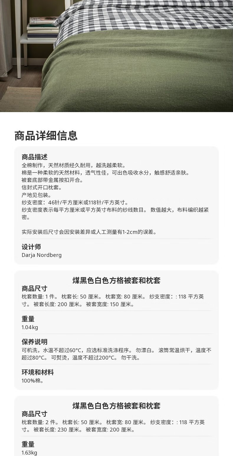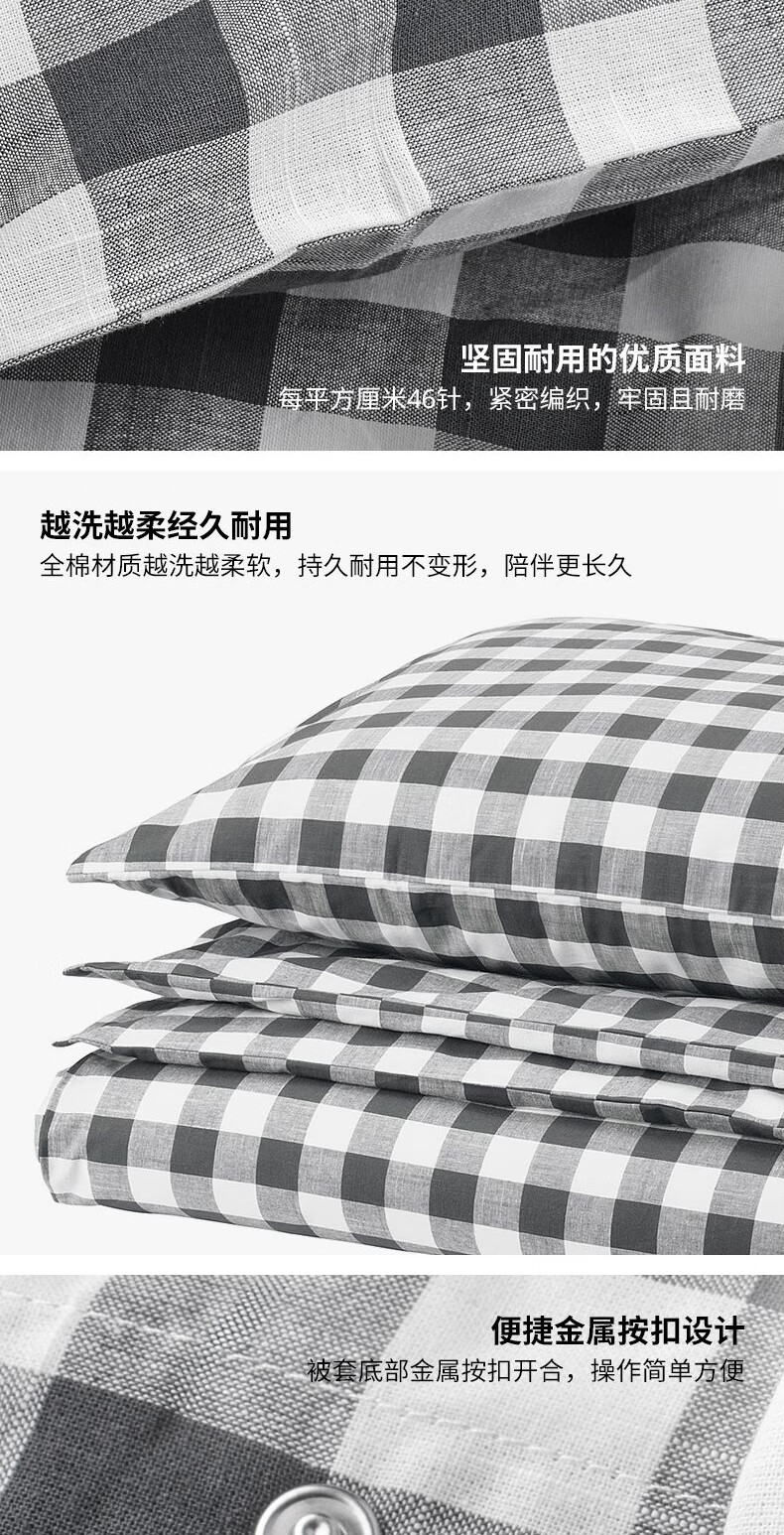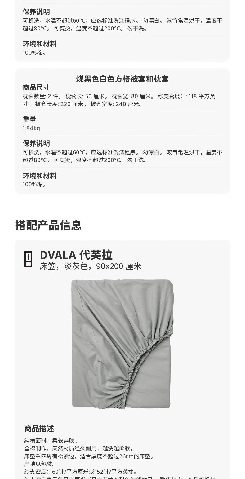 宜家(IKEA)【新品】EKTANDVINGE艾克塔维枕套纯棉网格可机洗被套 煤黑白方格被套和2枕套240X220cm+白色床笠1.8m床