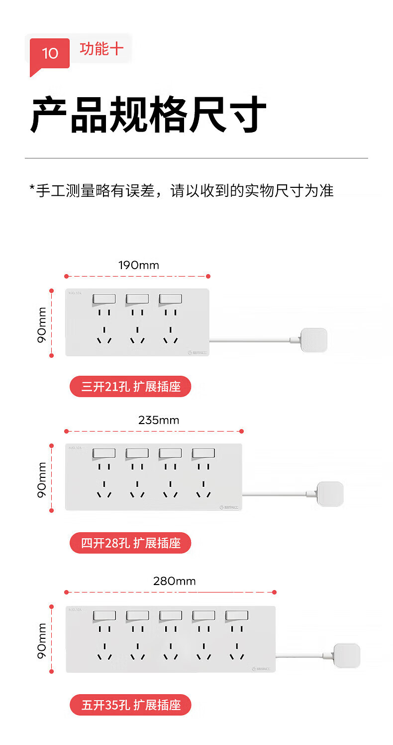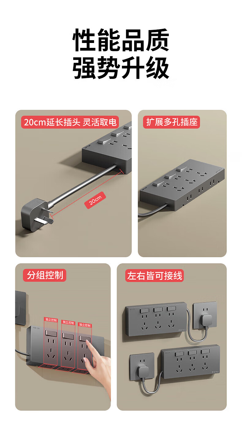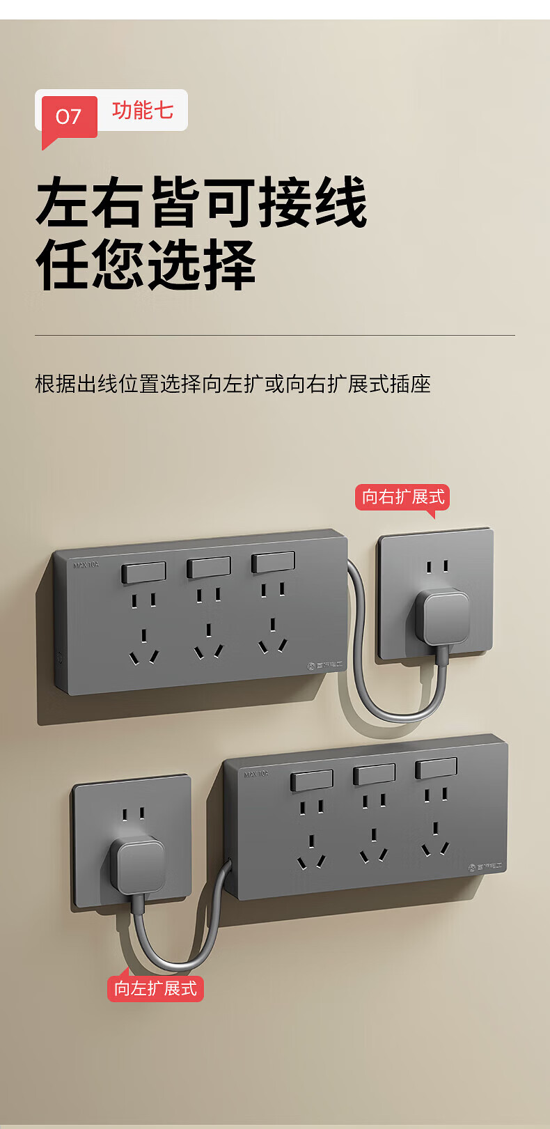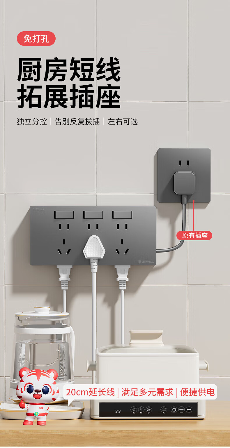 国际电工家用86型扩展插座带电源线厨房多功能墙壁拓展转换插座插排插线板 21孔向左扩展插座-白色三开分控+20厘米线