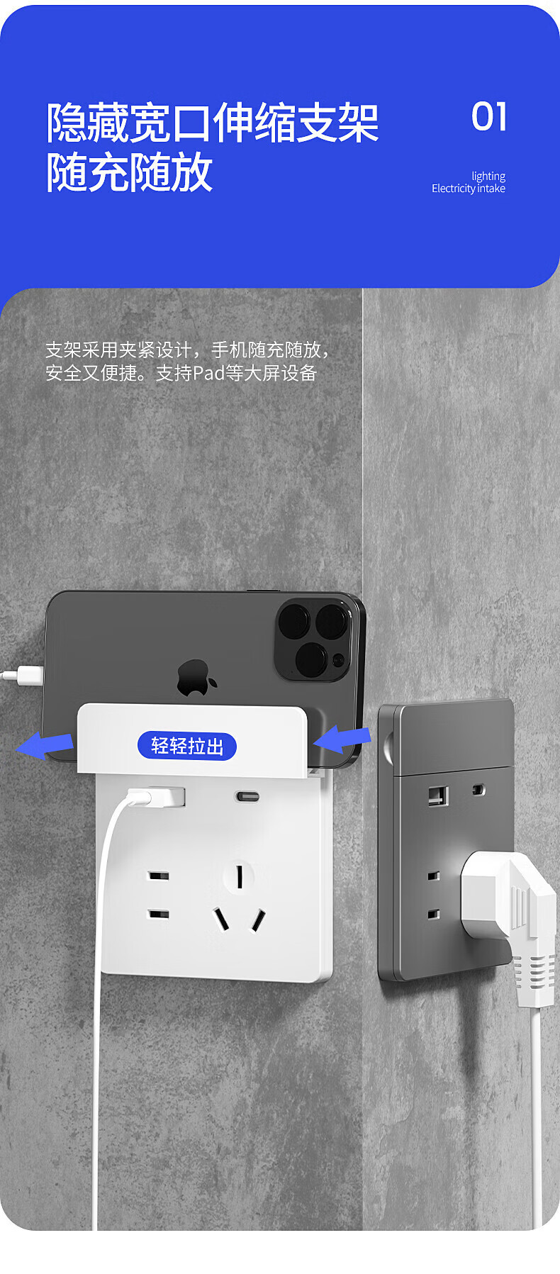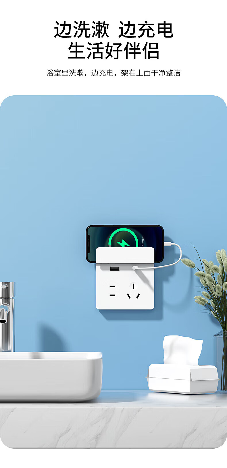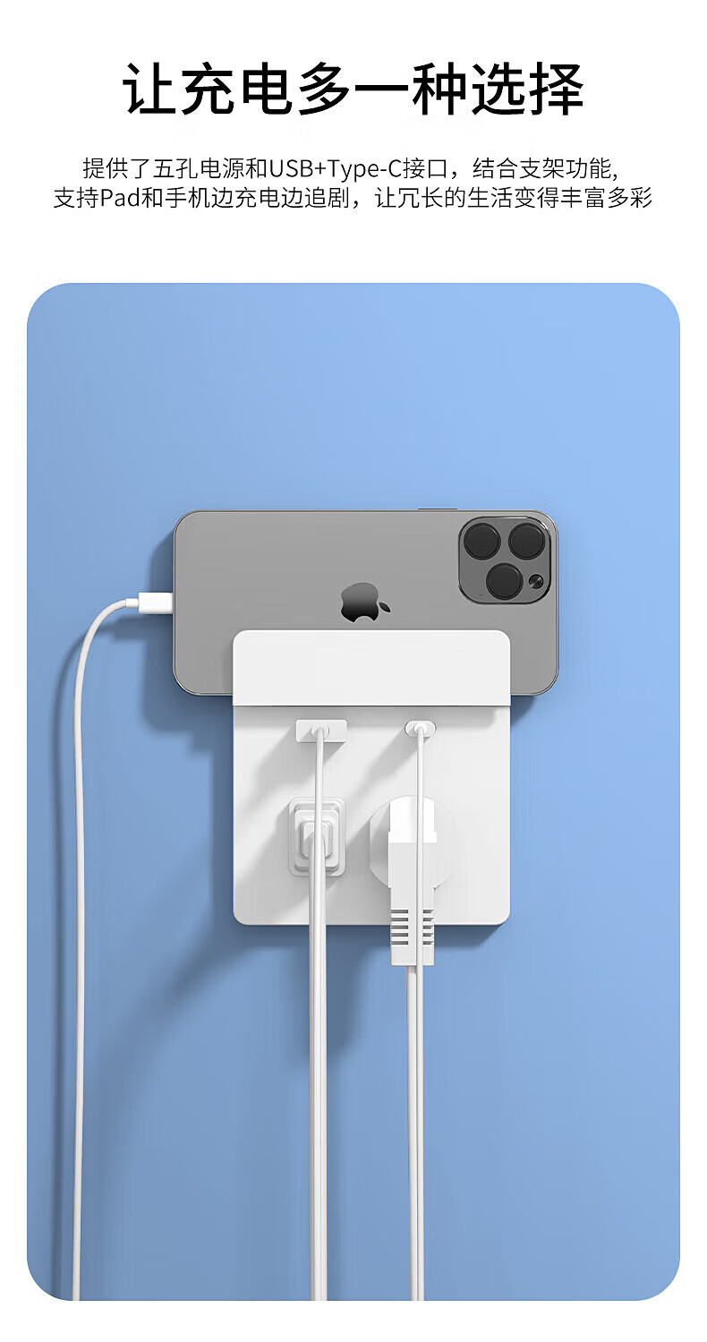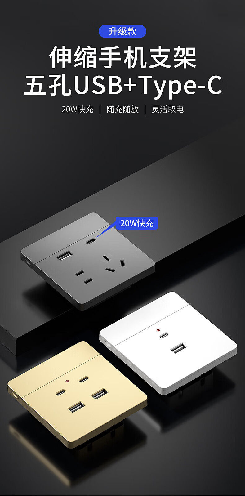国际电工86型家用type-c快充隐藏伸缩手机支架插座面板开关五孔带USB插座 时尚白-20W快充五孔USB+C-带支架