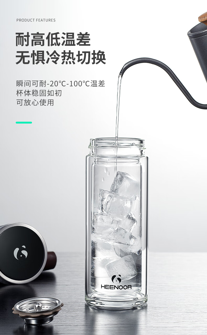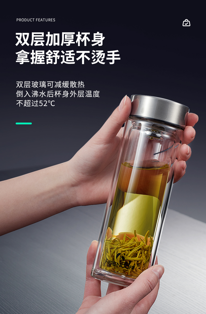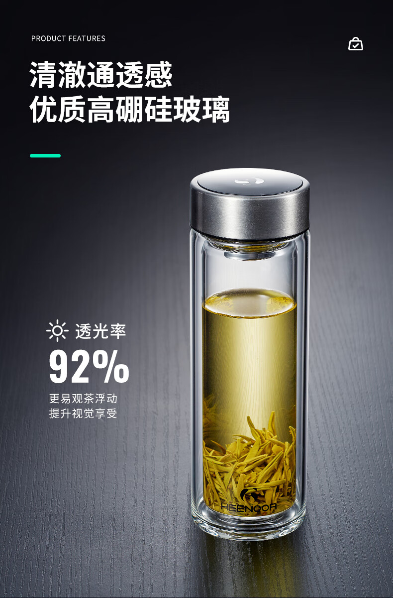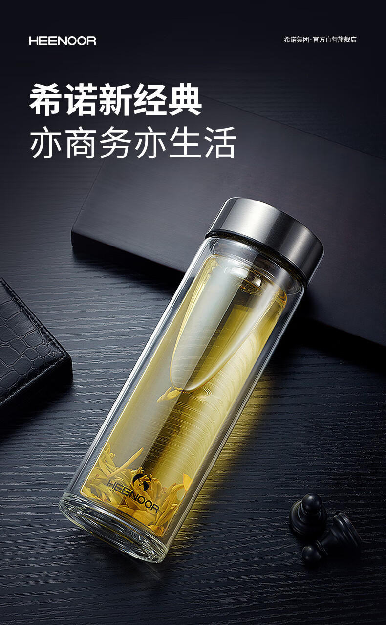 希诺(HEENOOR) 希诺玻璃杯双层官方直售男女士家用高档泡茶杯透明隔热车载水杯 本色-礼盒包装 335ml