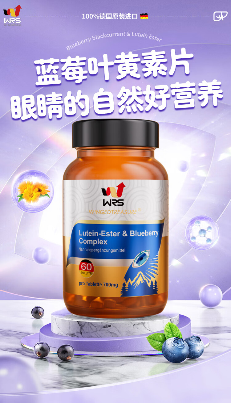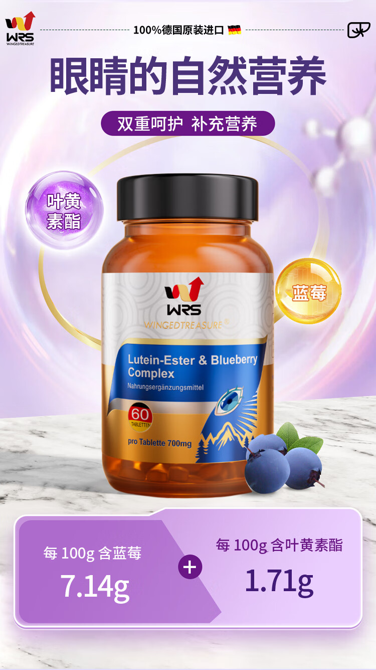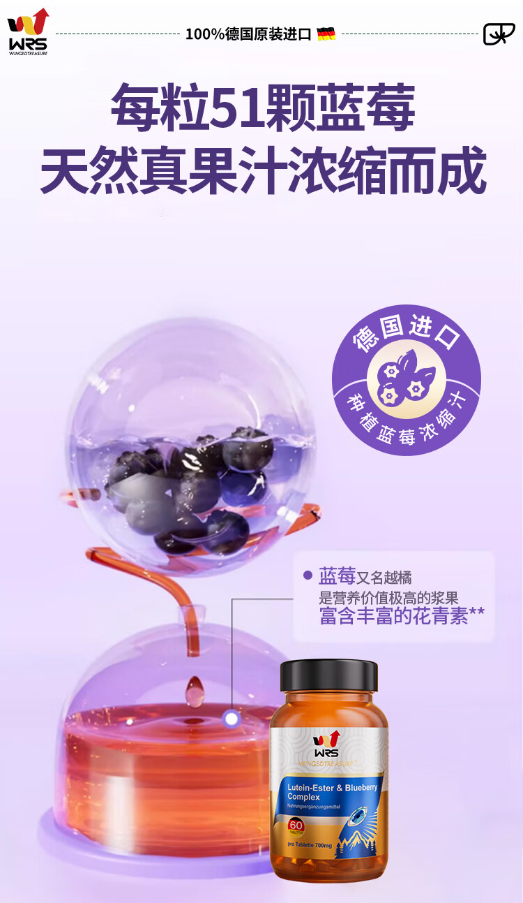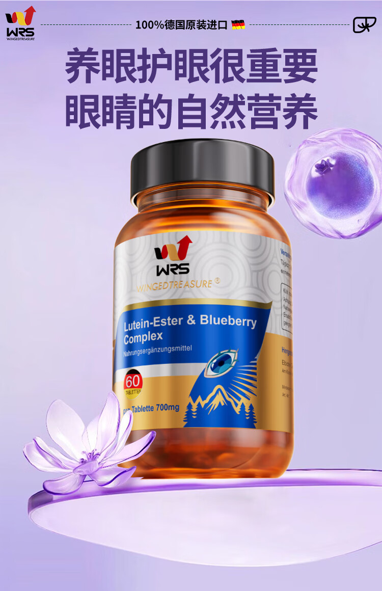 WRS德国原装进口蓝莓叶黄素护眼片剂眼干眼涩眼疲劳60粒/瓶 WRS叶黄素蓝莓片