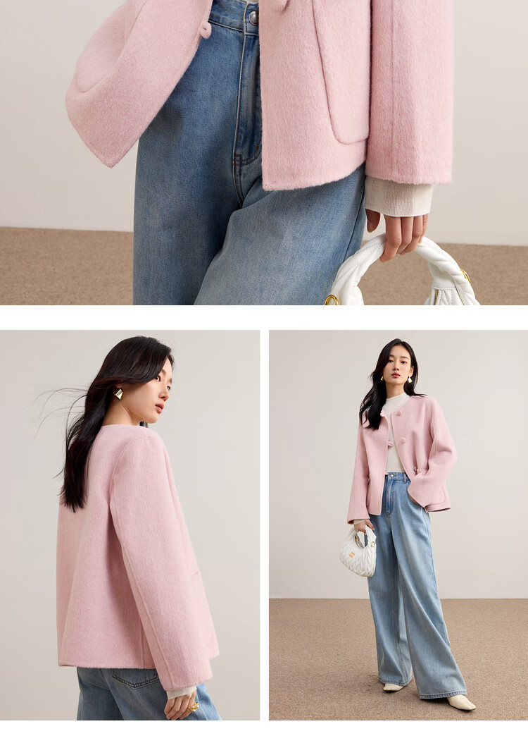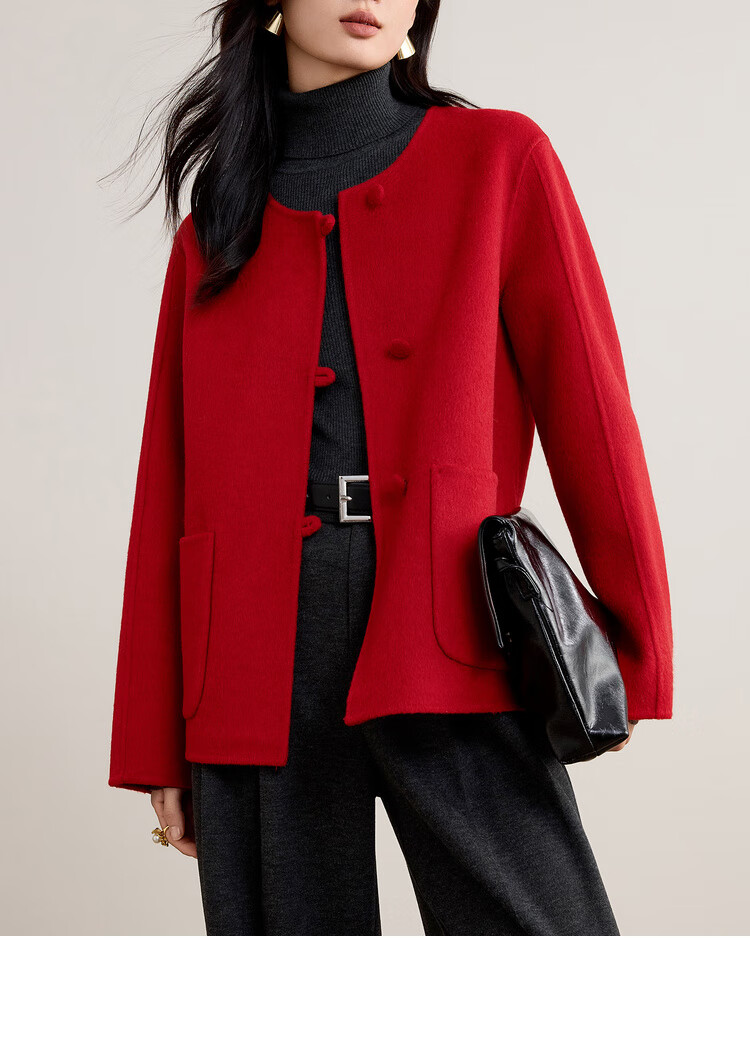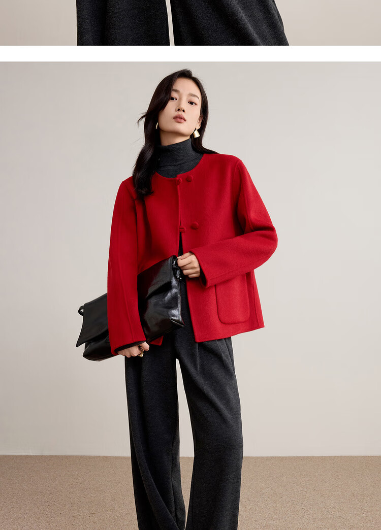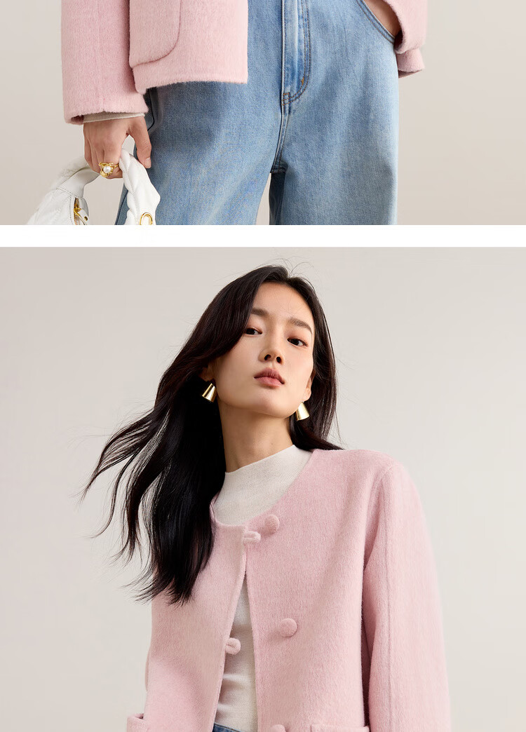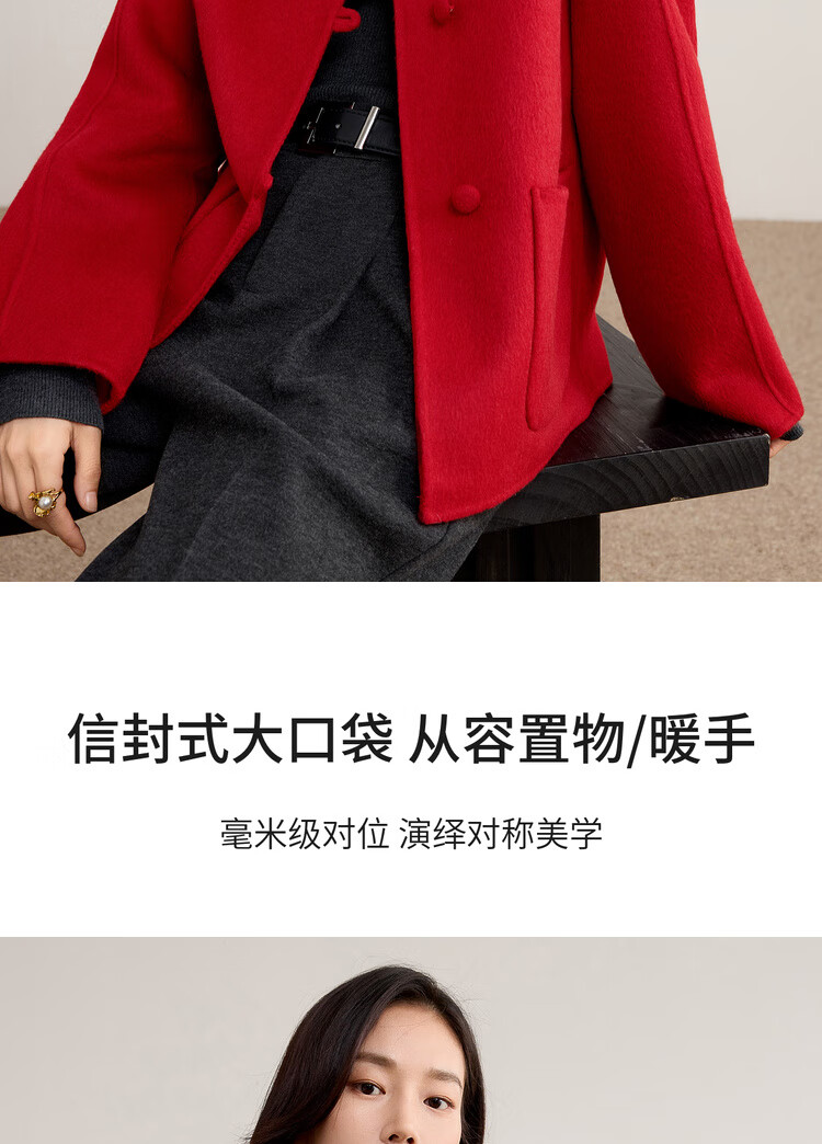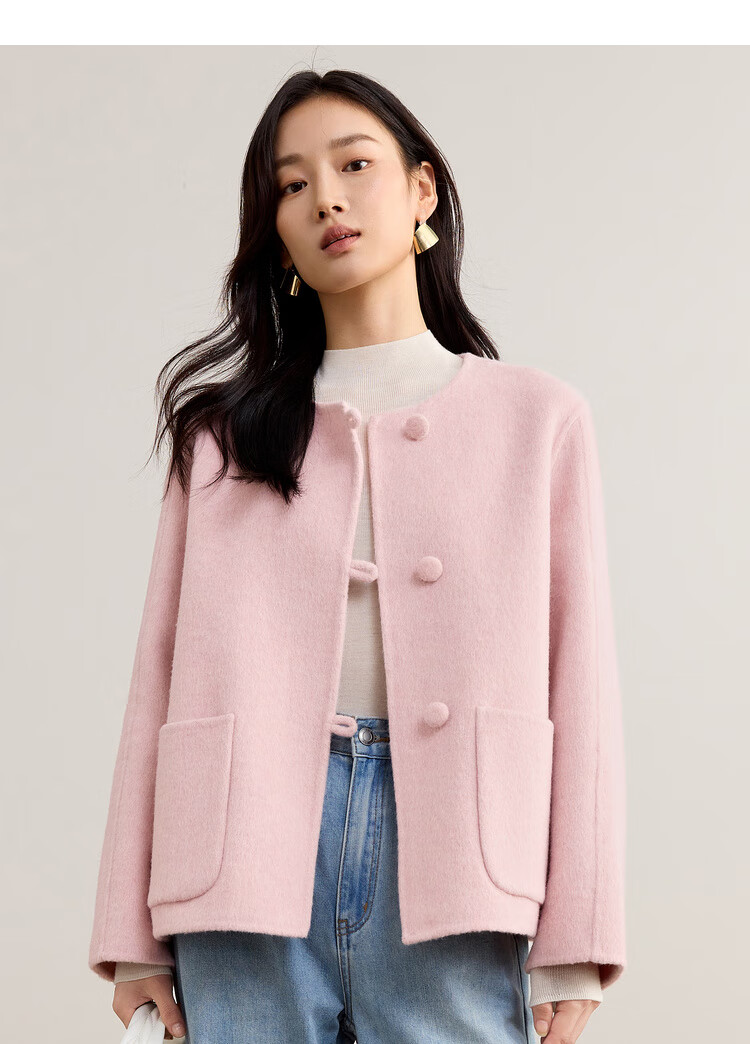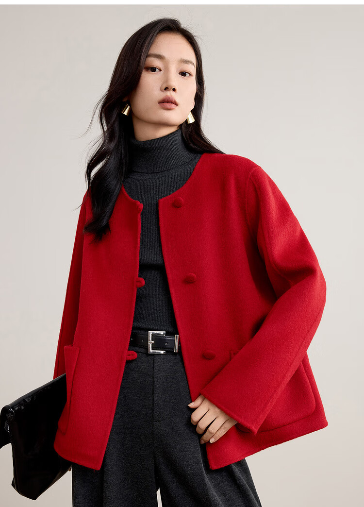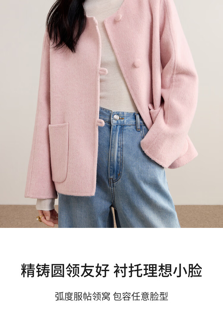 尚都比拉含绵羊毛保暖毛呢大衣女冬季名媛风圆领厚双面呢直筒外套轻奢开衫