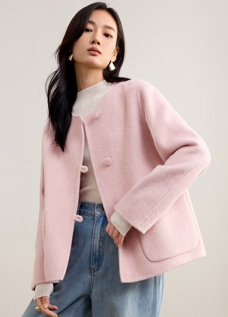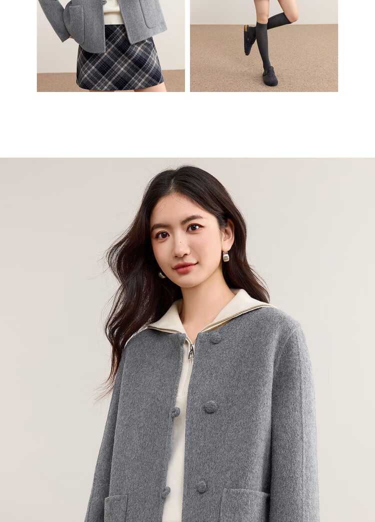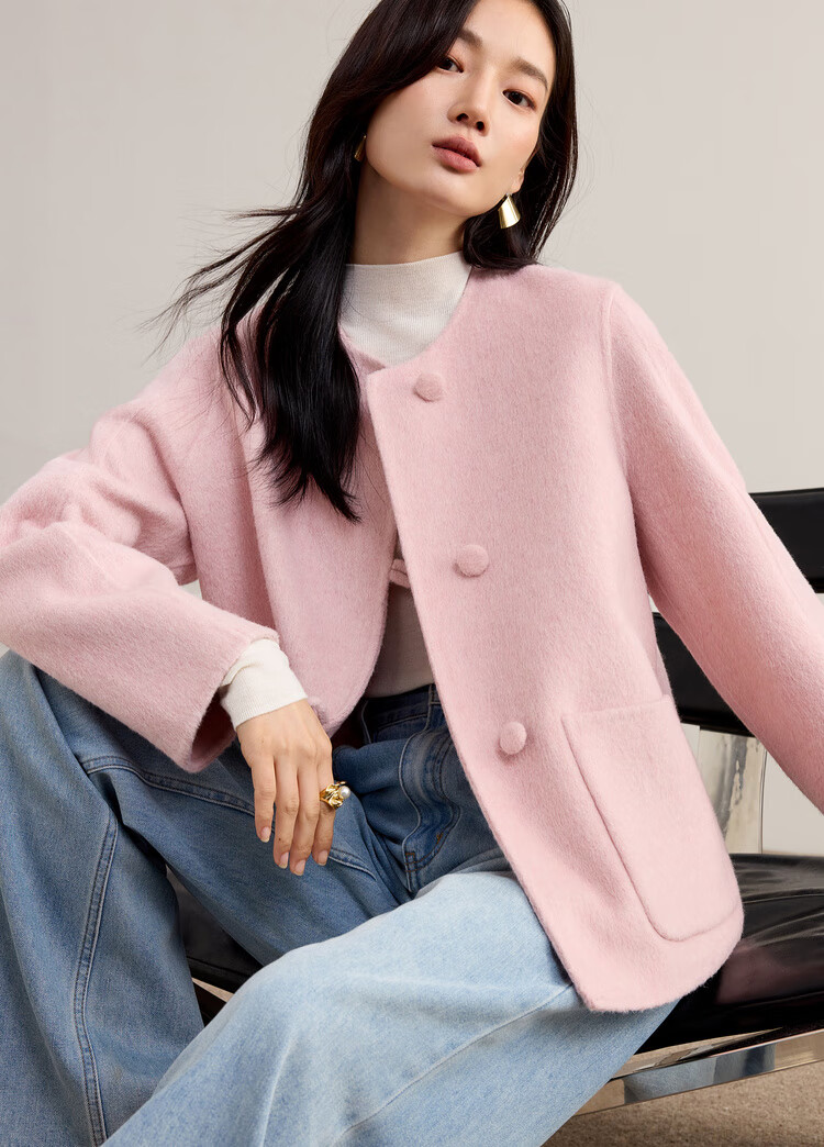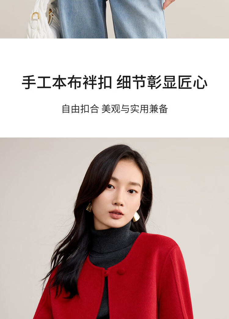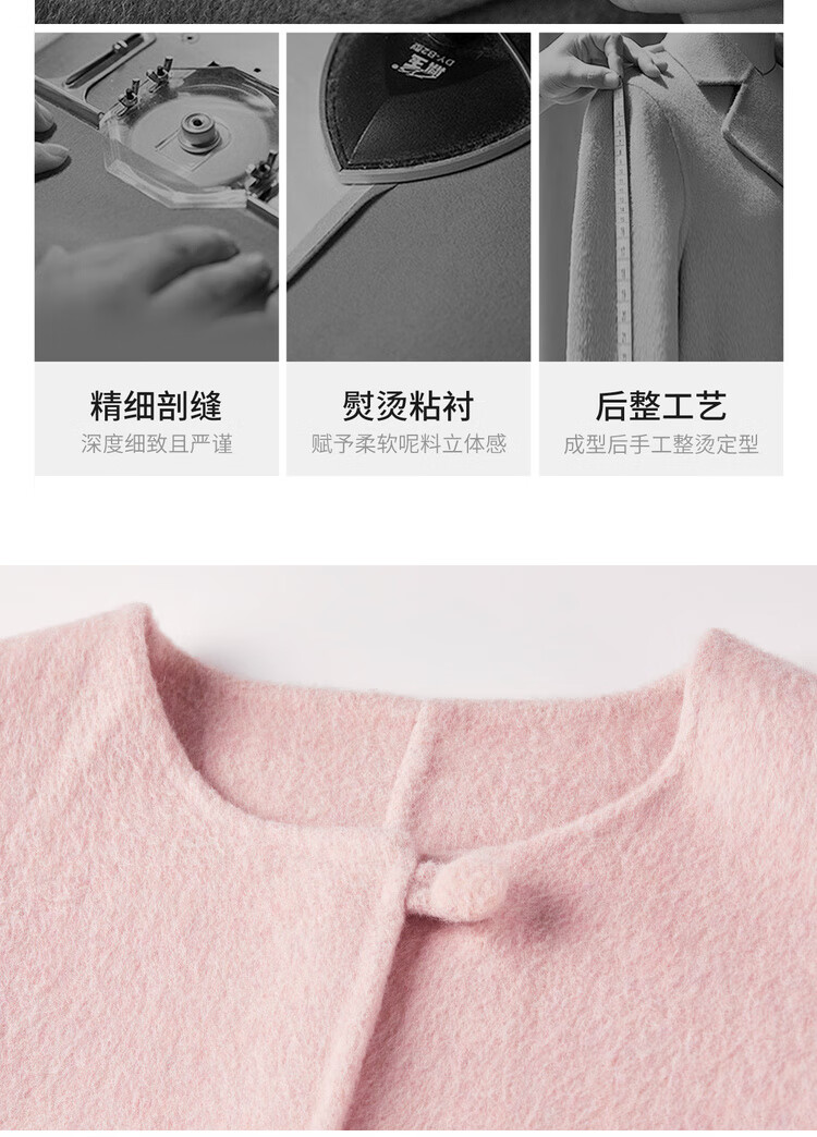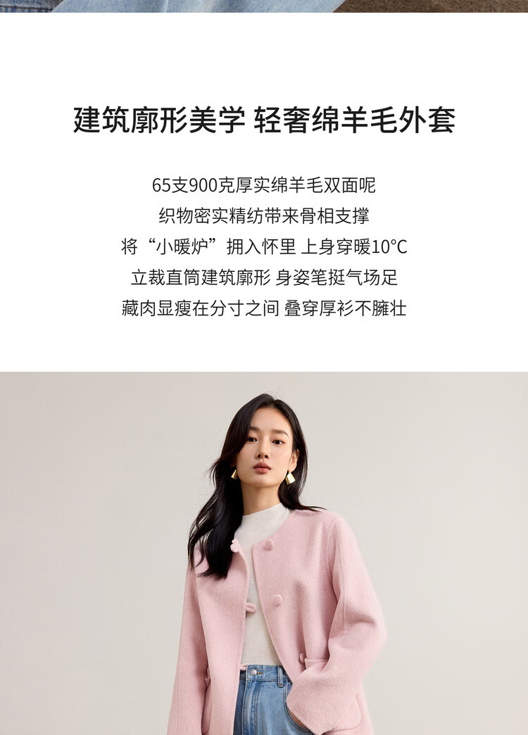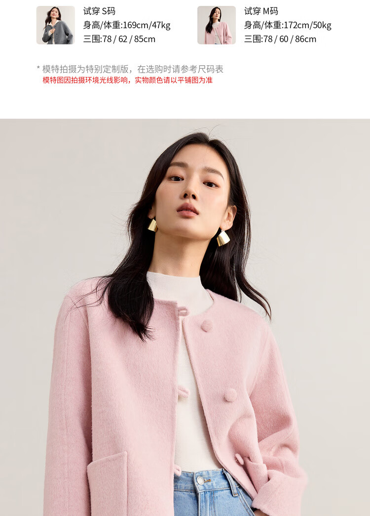 尚都比拉含绵羊毛保暖毛呢大衣女冬季名媛风圆领厚双面呢直筒外套轻奢开衫