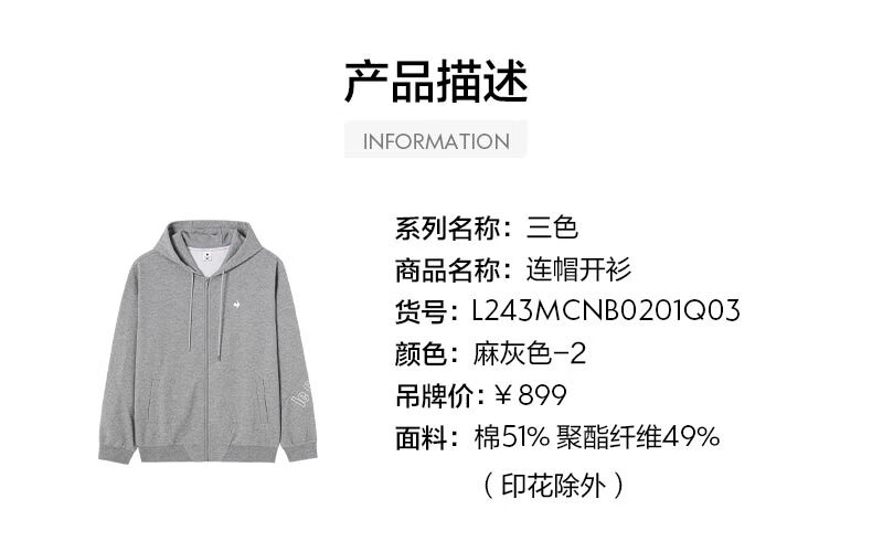 Le coq sportif乐卡克法国公鸡秋季男子运动时尚连帽开衫外套