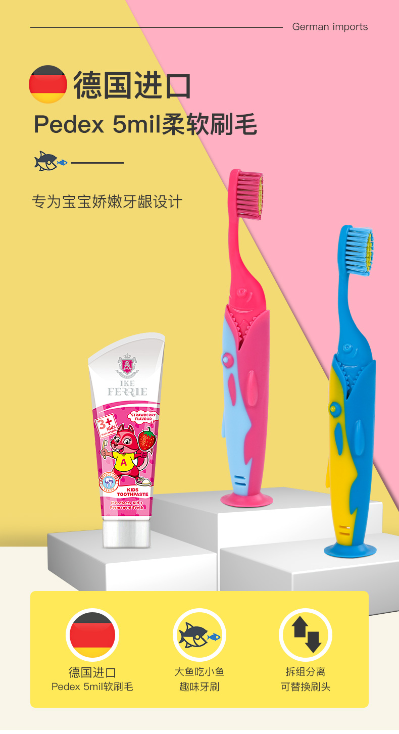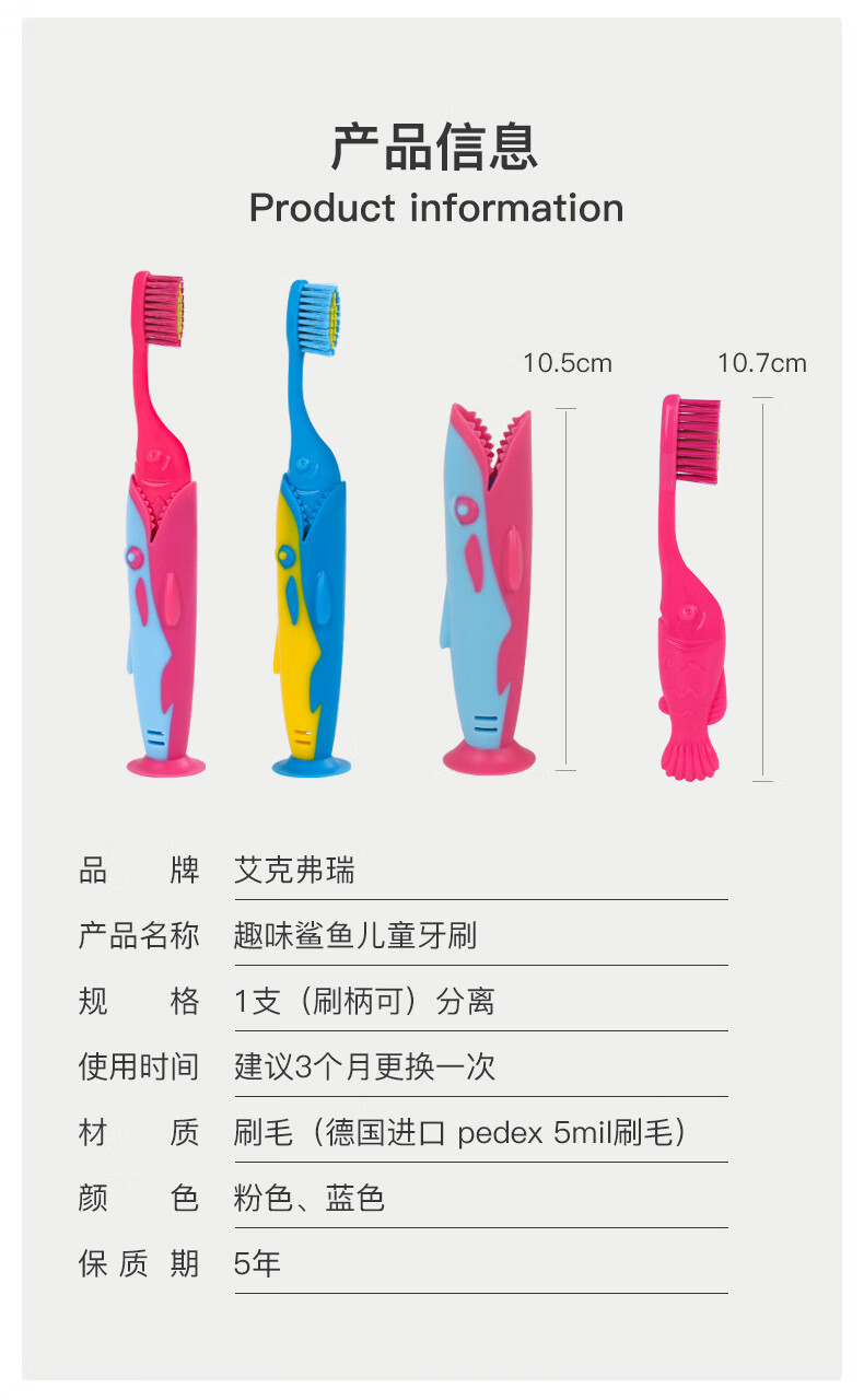 艾克弗瑞软毛牙刷儿童专用牙刷3-6-12岁婴幼儿宝宝乳牙软毛牙刷牙膏卡通 【蓝色】鲨鱼吃小鱼套装 4支