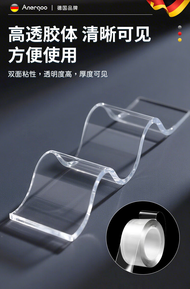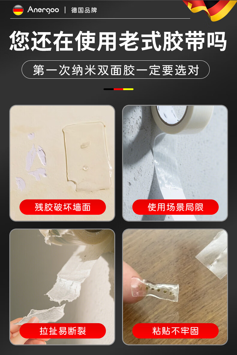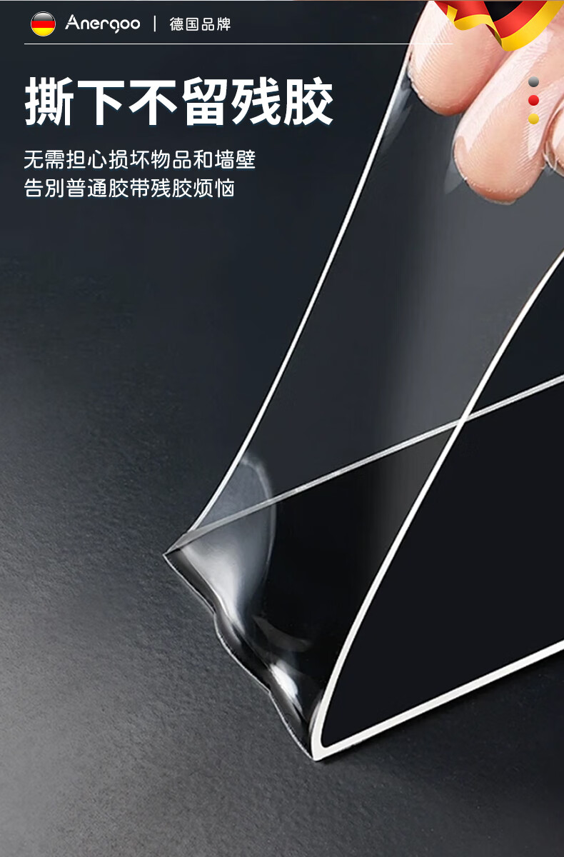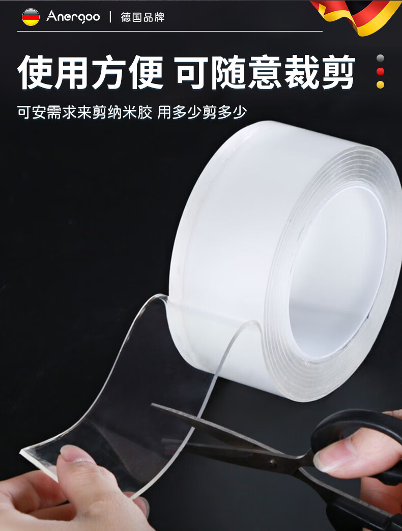 ANERGOO 安尔固强力纳米胶带京东自营无痕双面胶透明胶升级防尘车用家用高粘度不伤墙水洗可重复使用