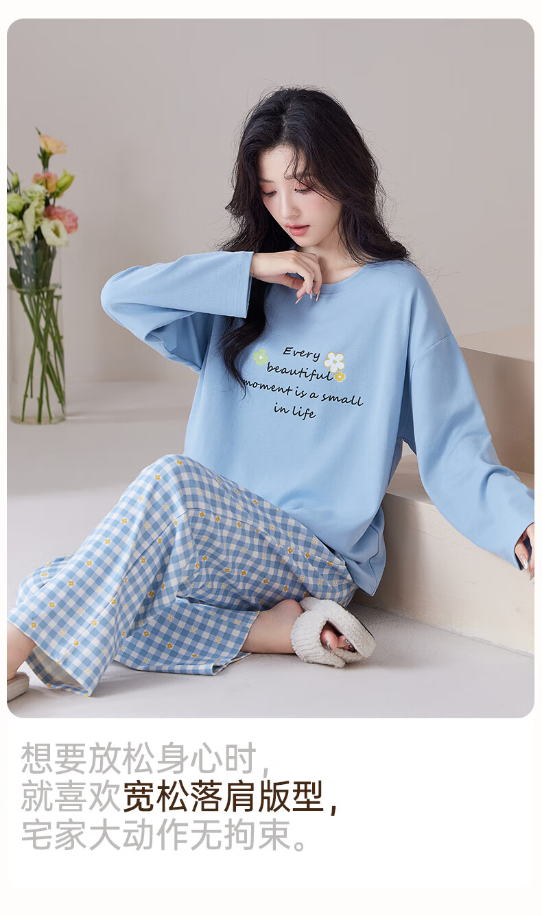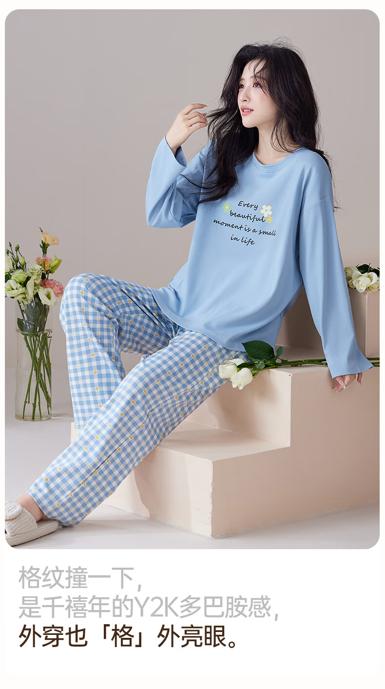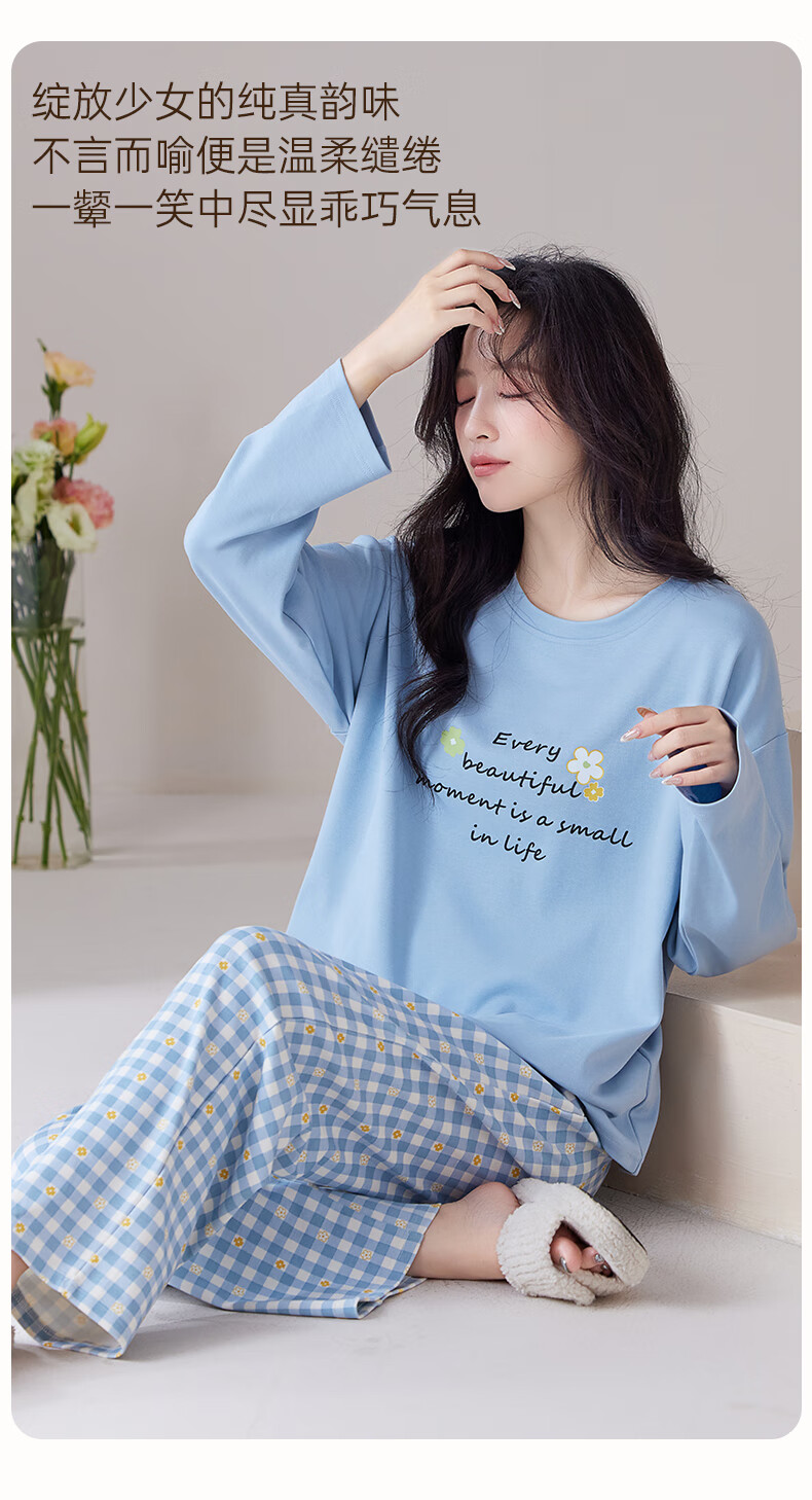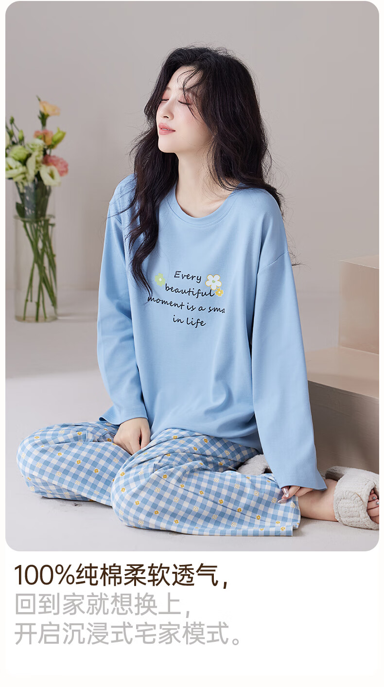 玛伦萨纯棉睡衣女春秋季可外穿2025新款柔软短袖长裤圆领四季全棉家居服 蓝色 M