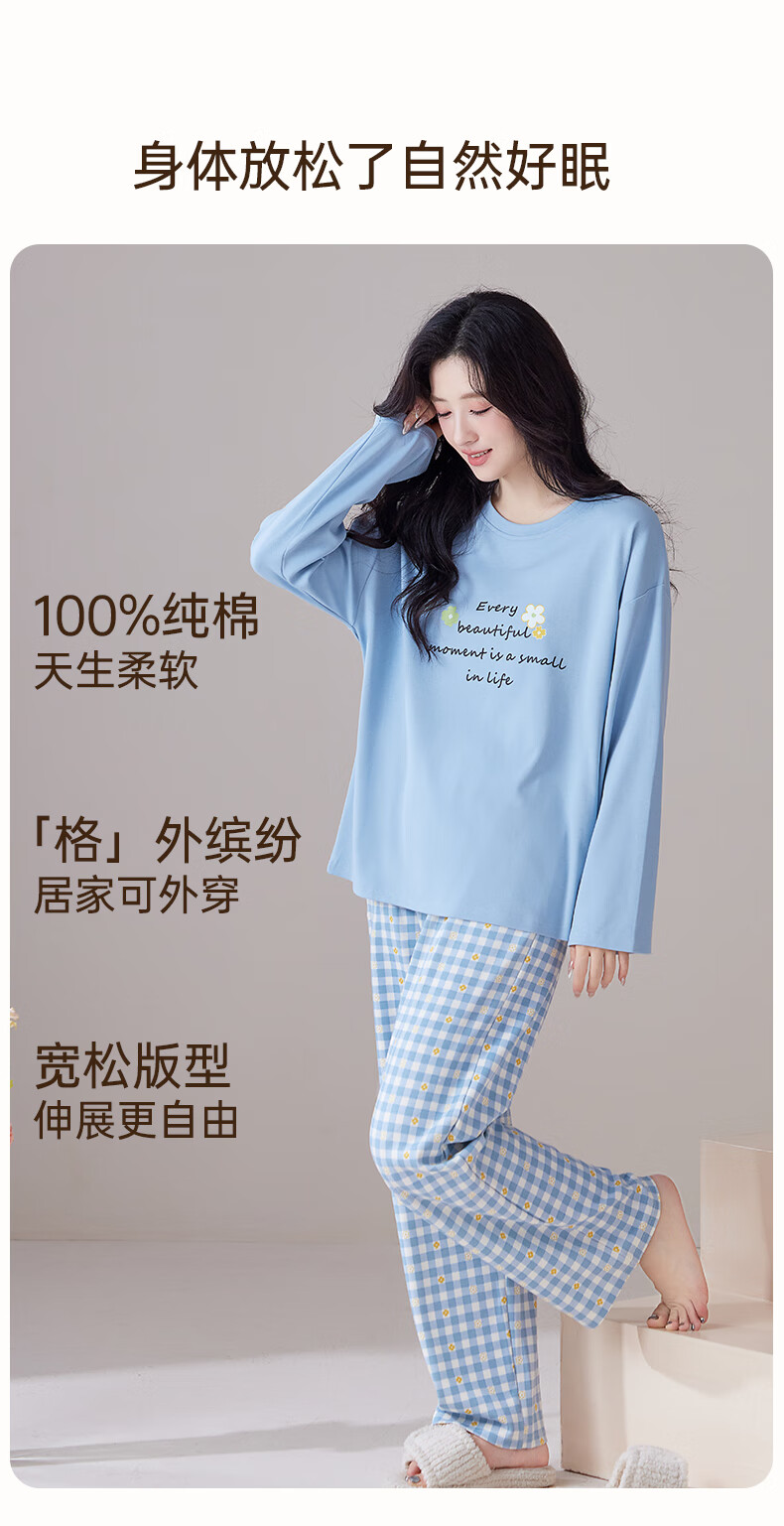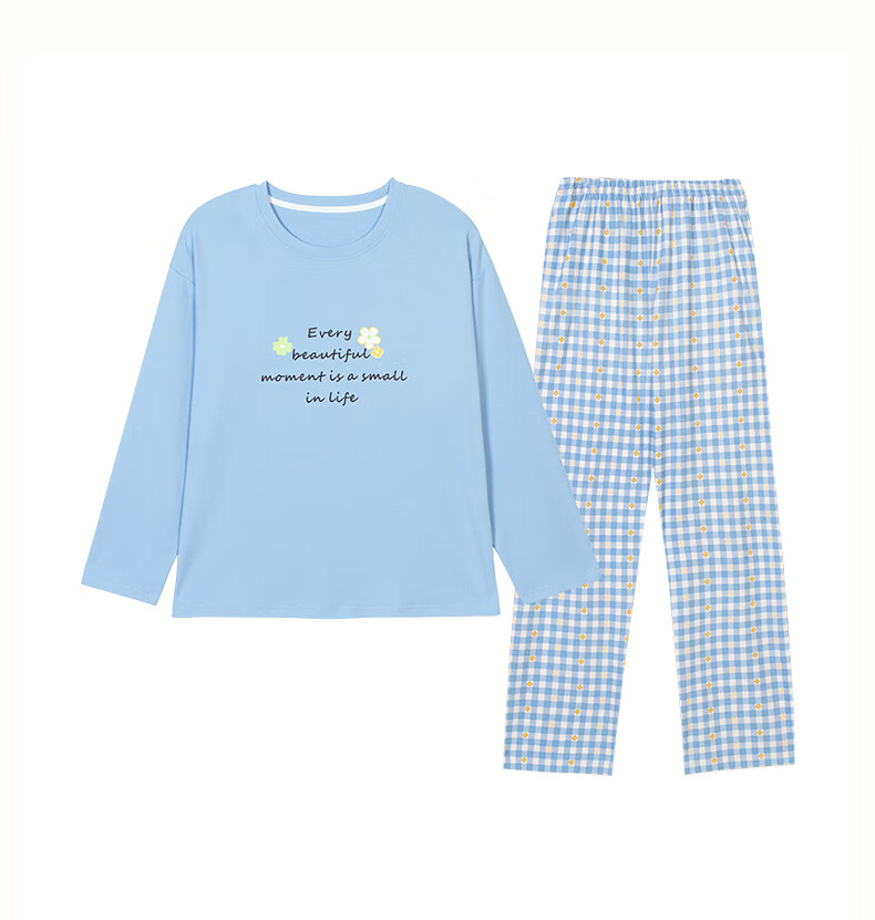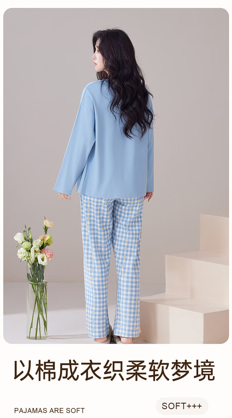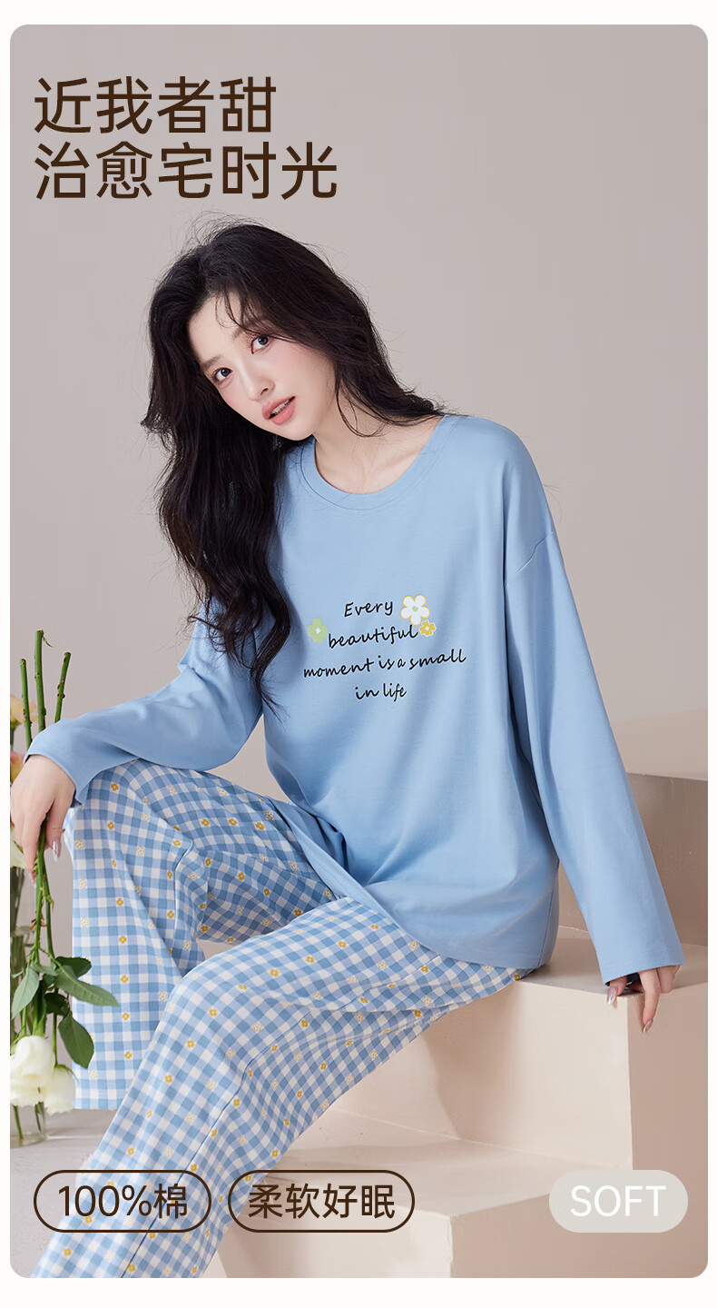 玛伦萨纯棉睡衣女春秋季可外穿2025新款柔软短袖长裤圆领四季全棉家居服 蓝色 M