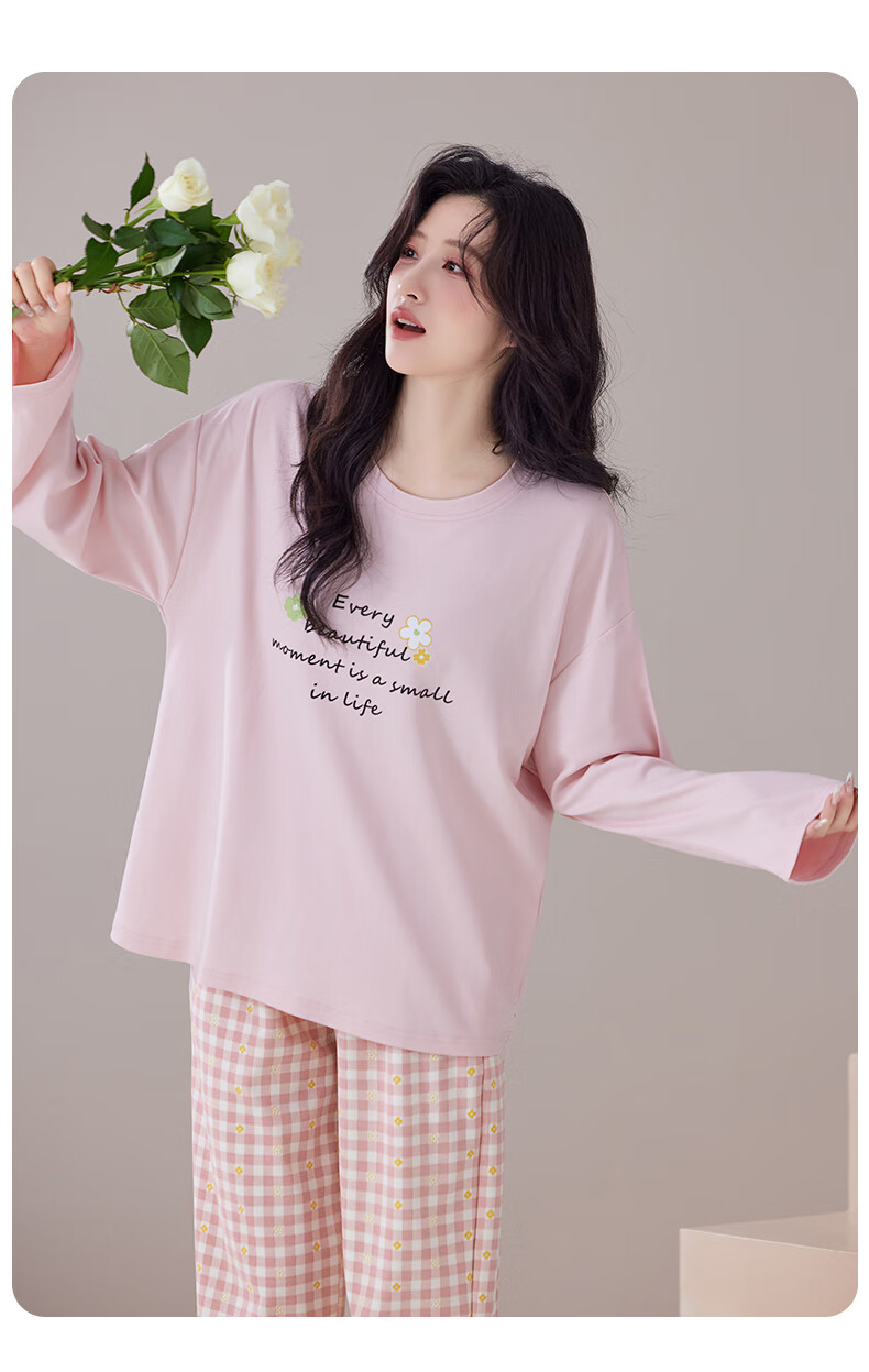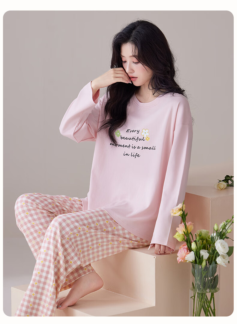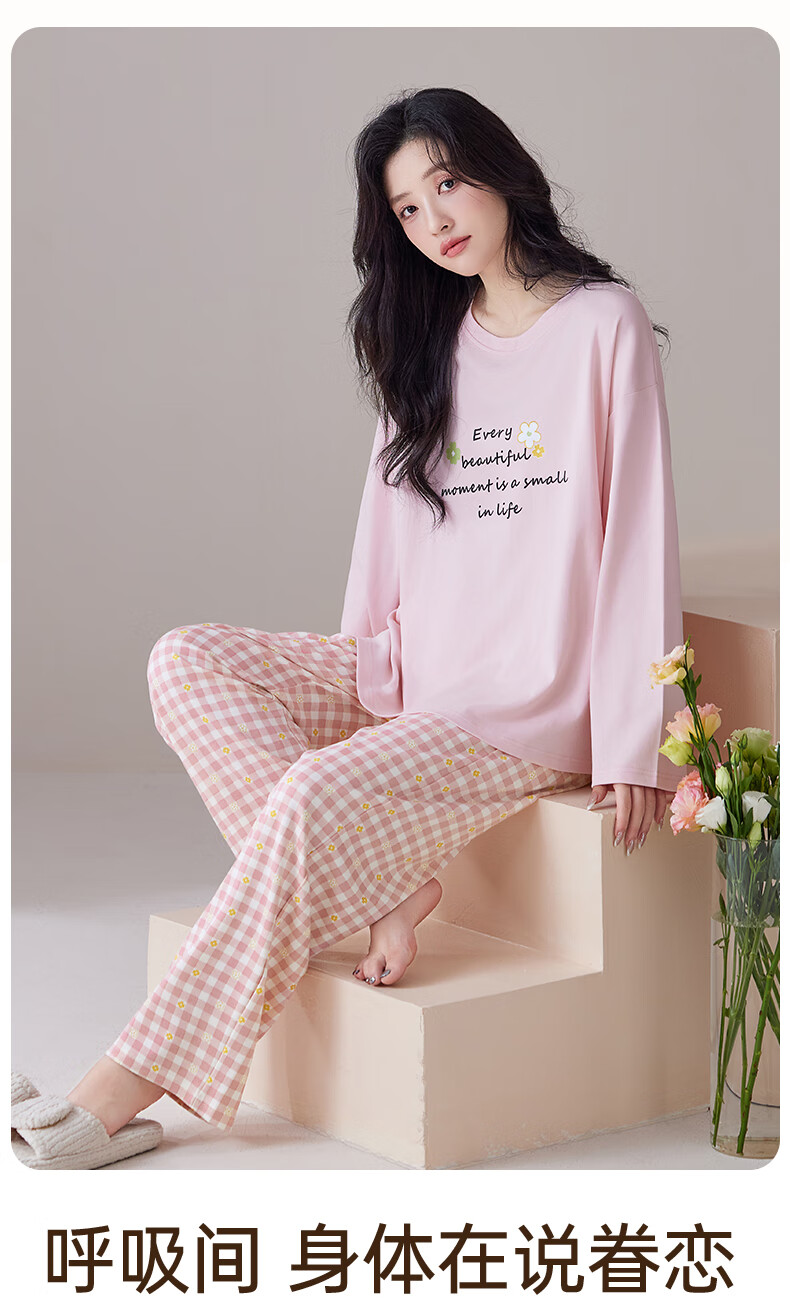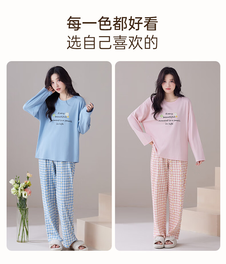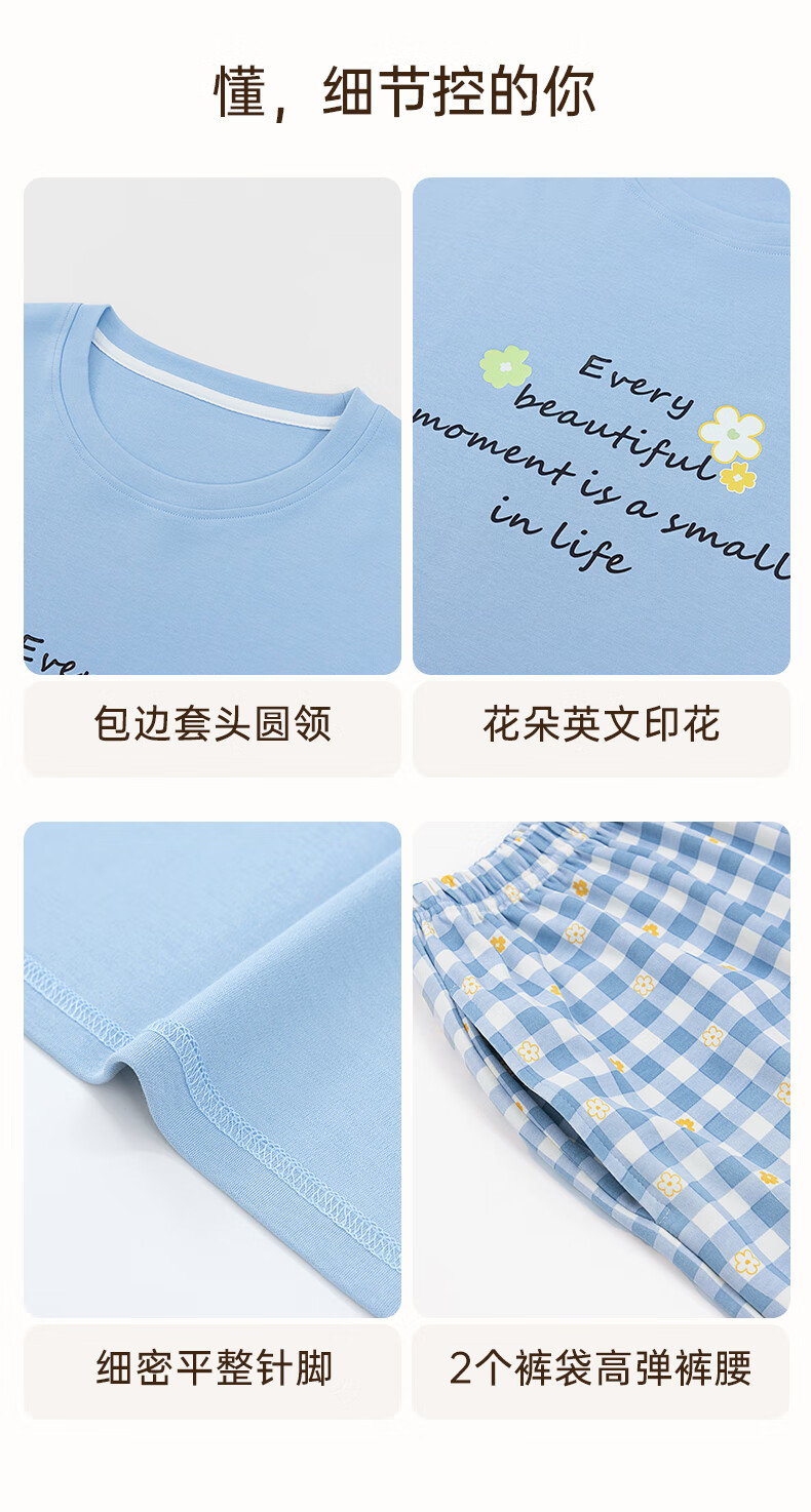 玛伦萨纯棉睡衣女春秋季可外穿2025新款柔软短袖长裤圆领四季全棉家居服 蓝色 M