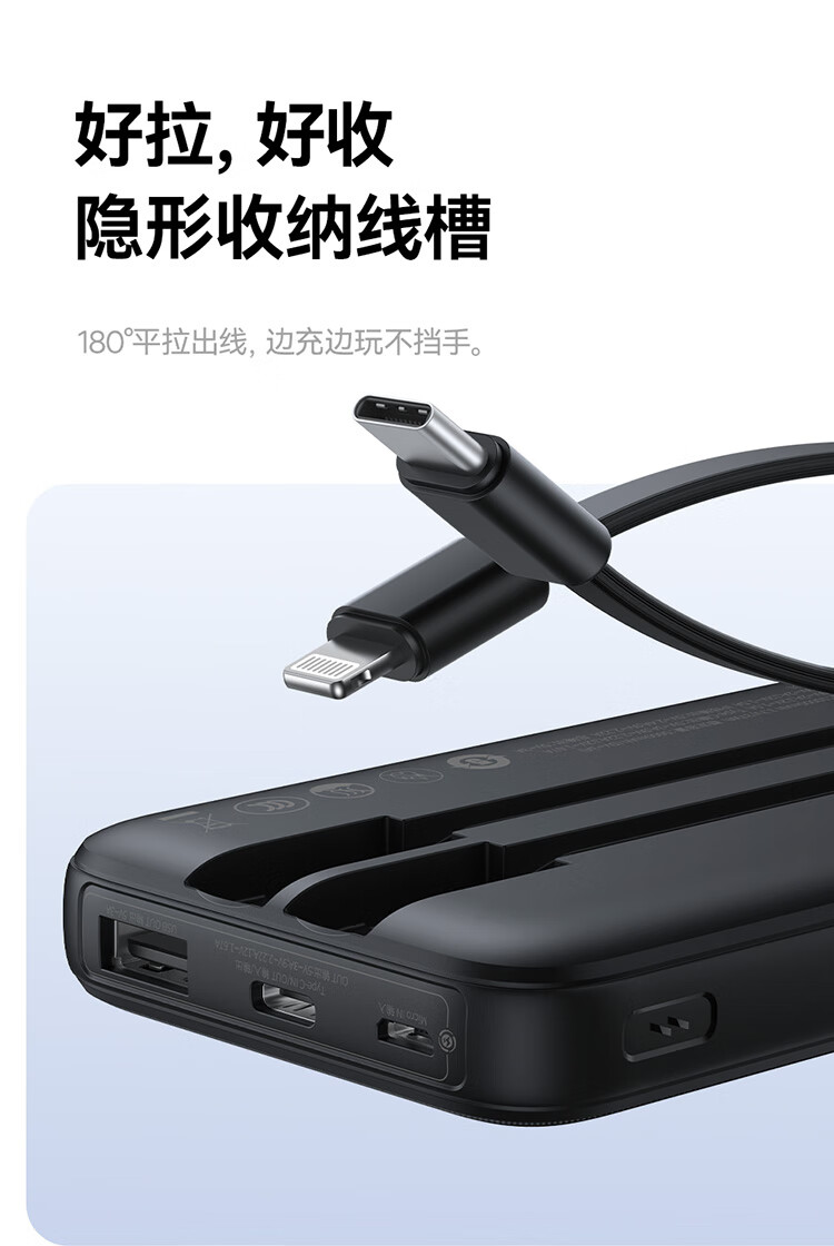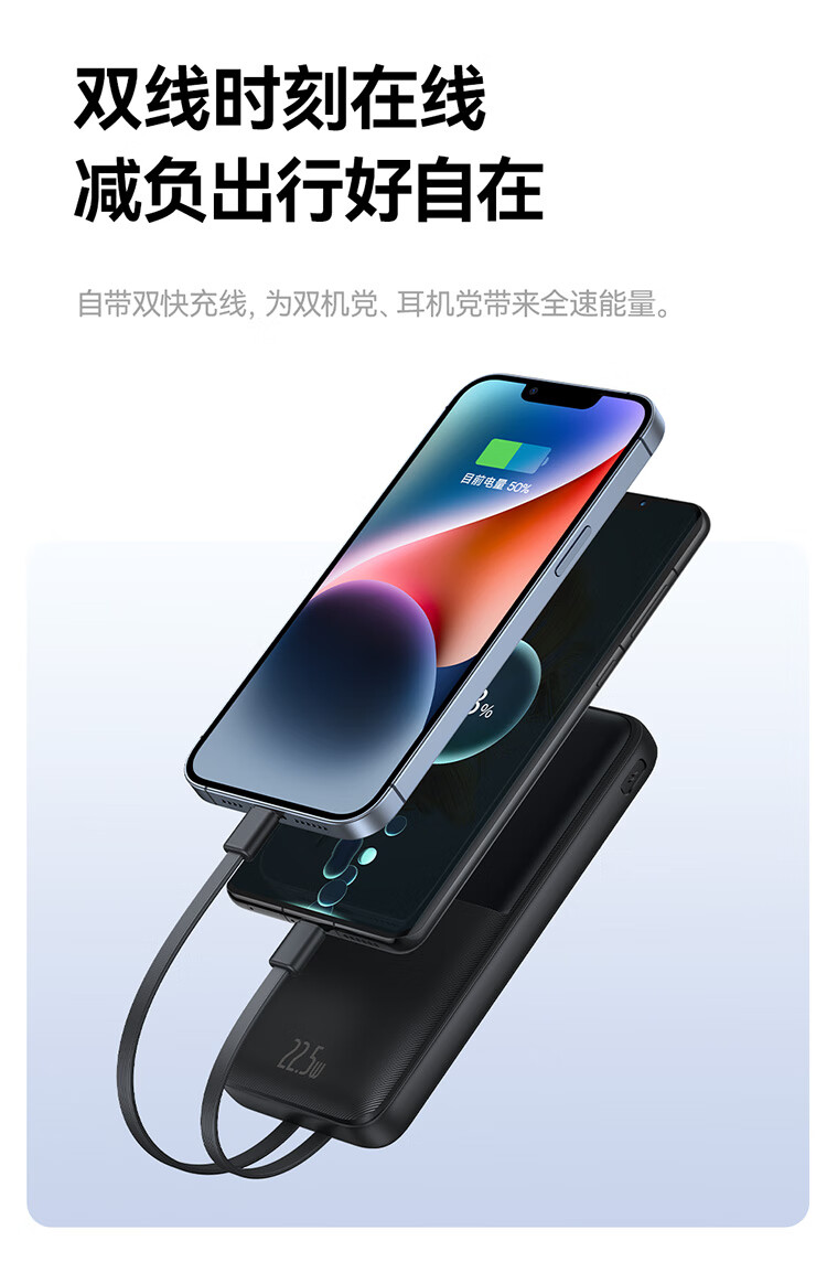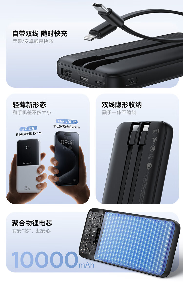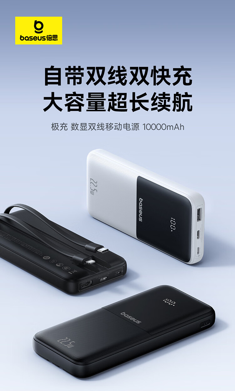 倍思(Baseus)【国标3C认证】充电宝自带线10000毫安22.5W/20W快充移动电源迷你小巧适用苹果华为小米