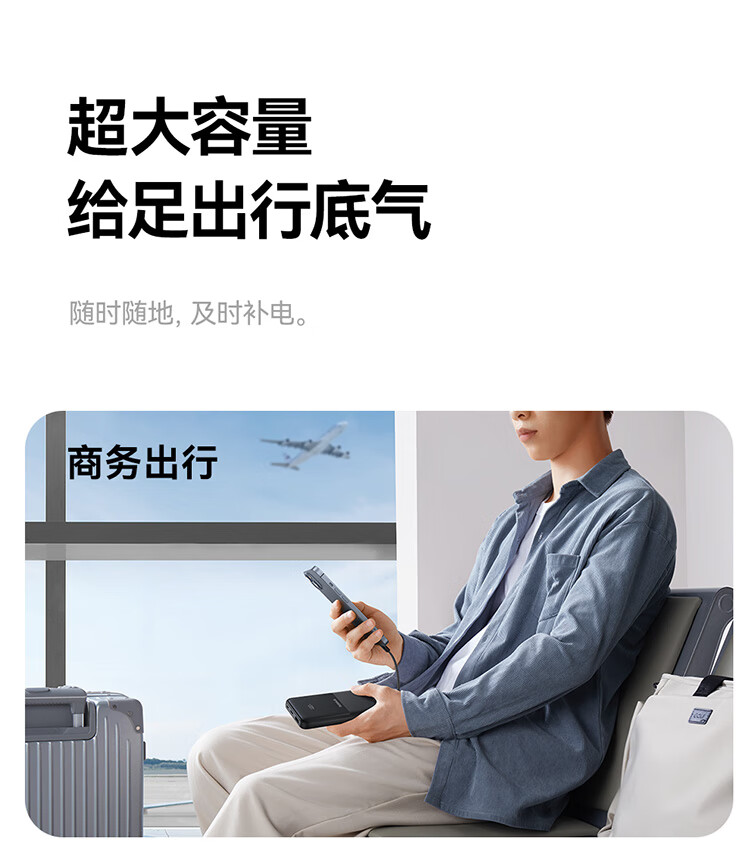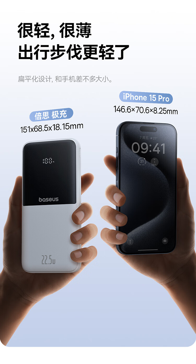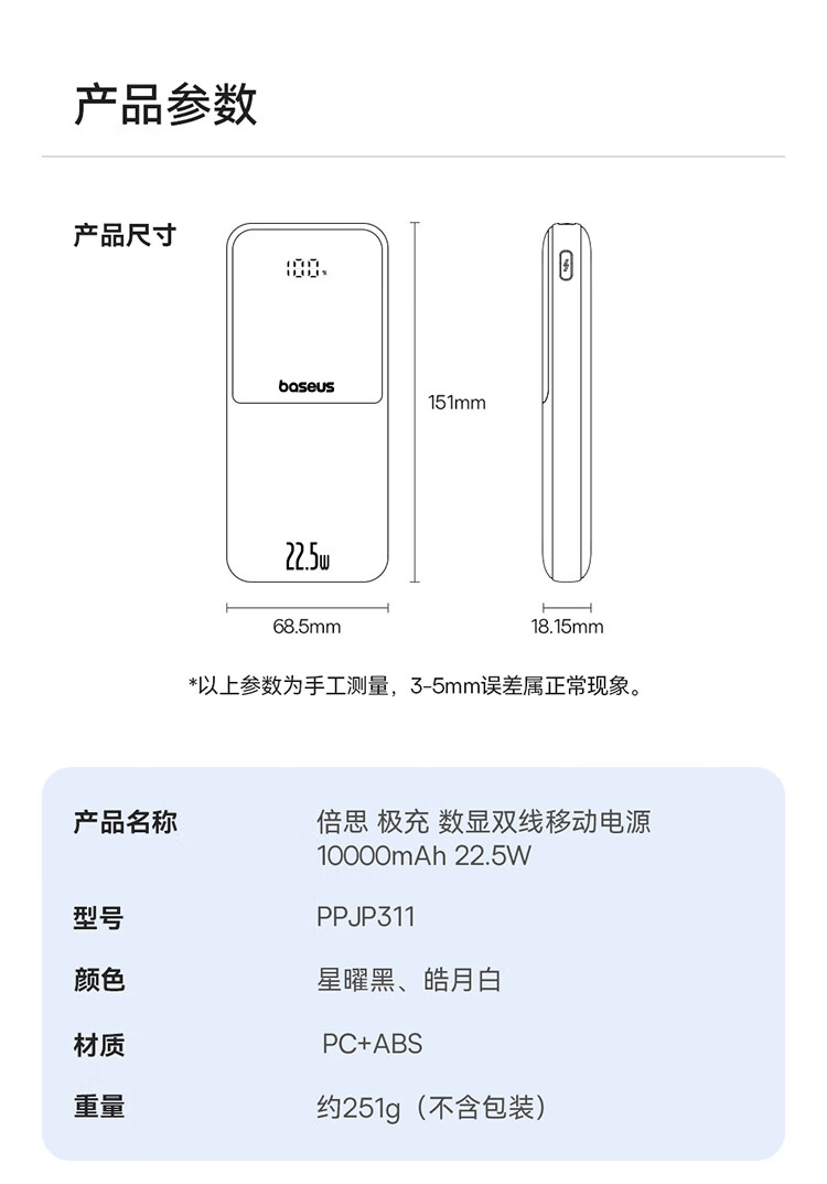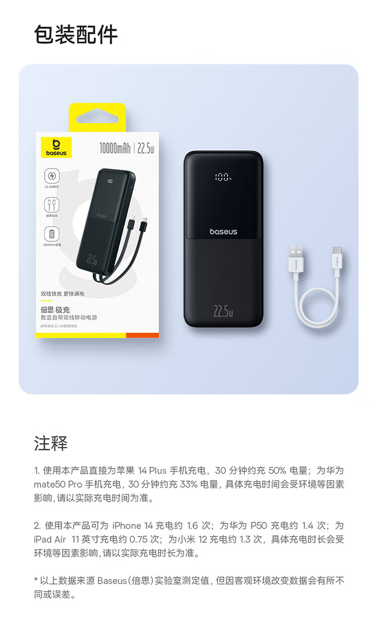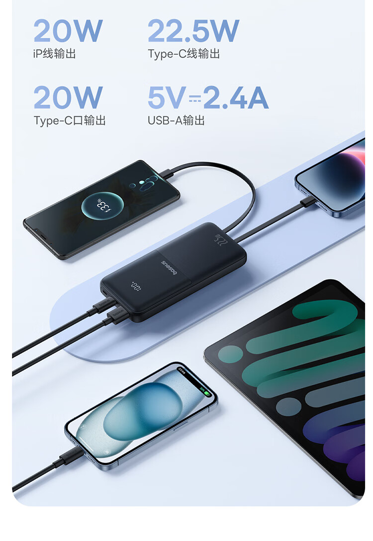 倍思(Baseus)【国标3C认证】充电宝自带线10000毫安22.5W/20W快充移动电源迷你小巧适用苹果华为小米