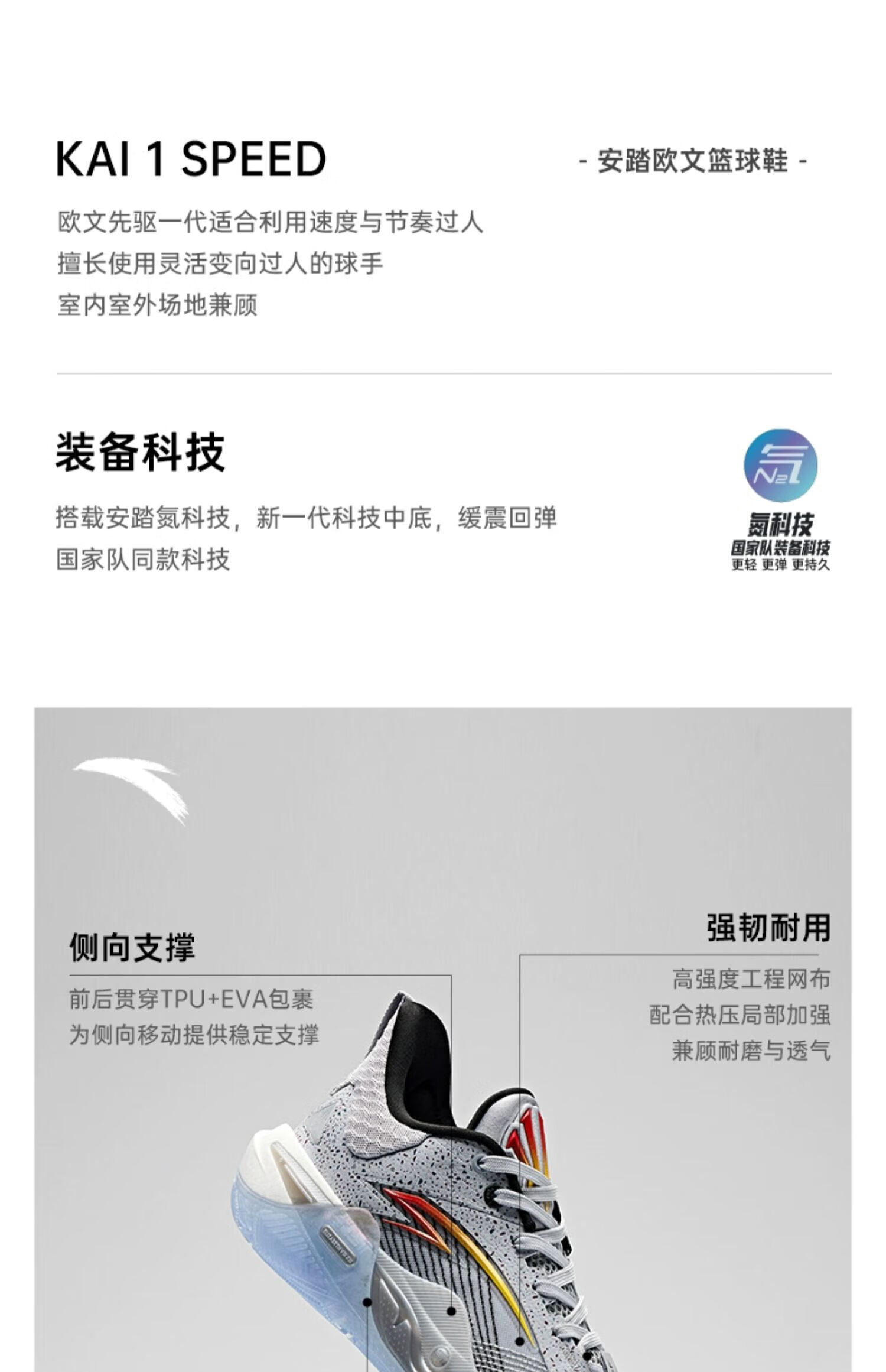 安踏【KAI SPEED】欧文先驱1代丨氮科技缓震耐磨低帮篮球鞋男