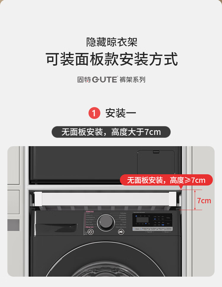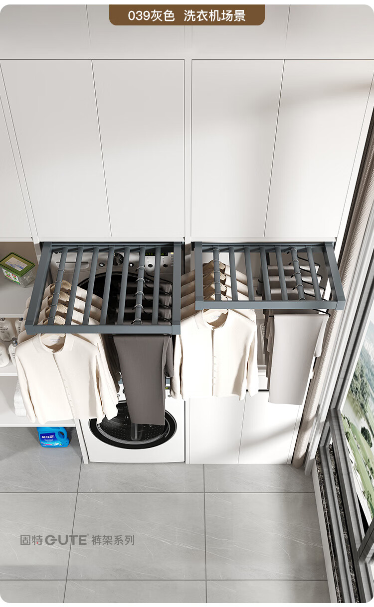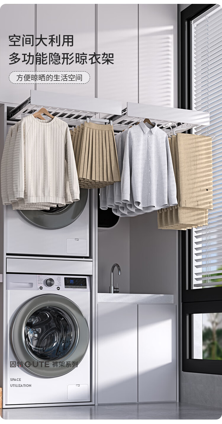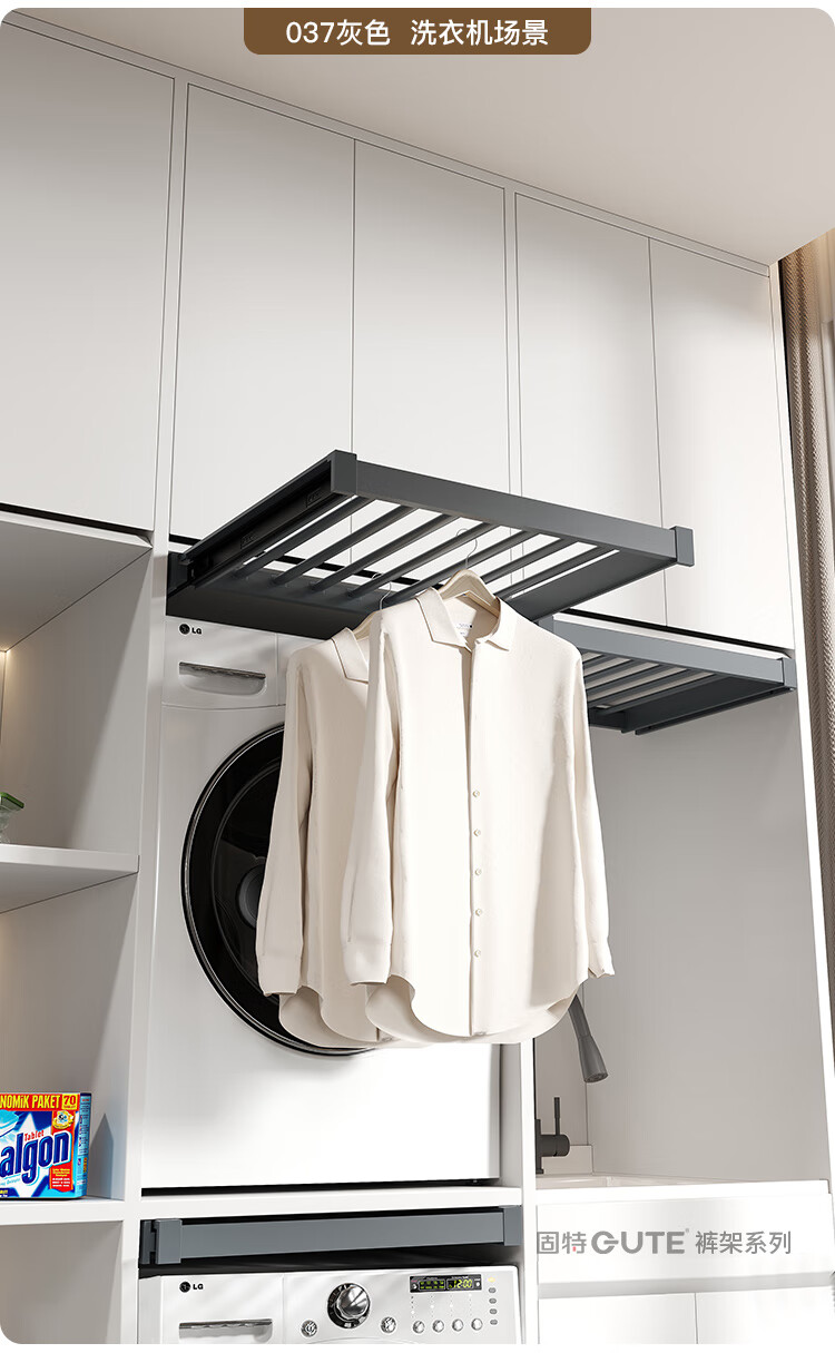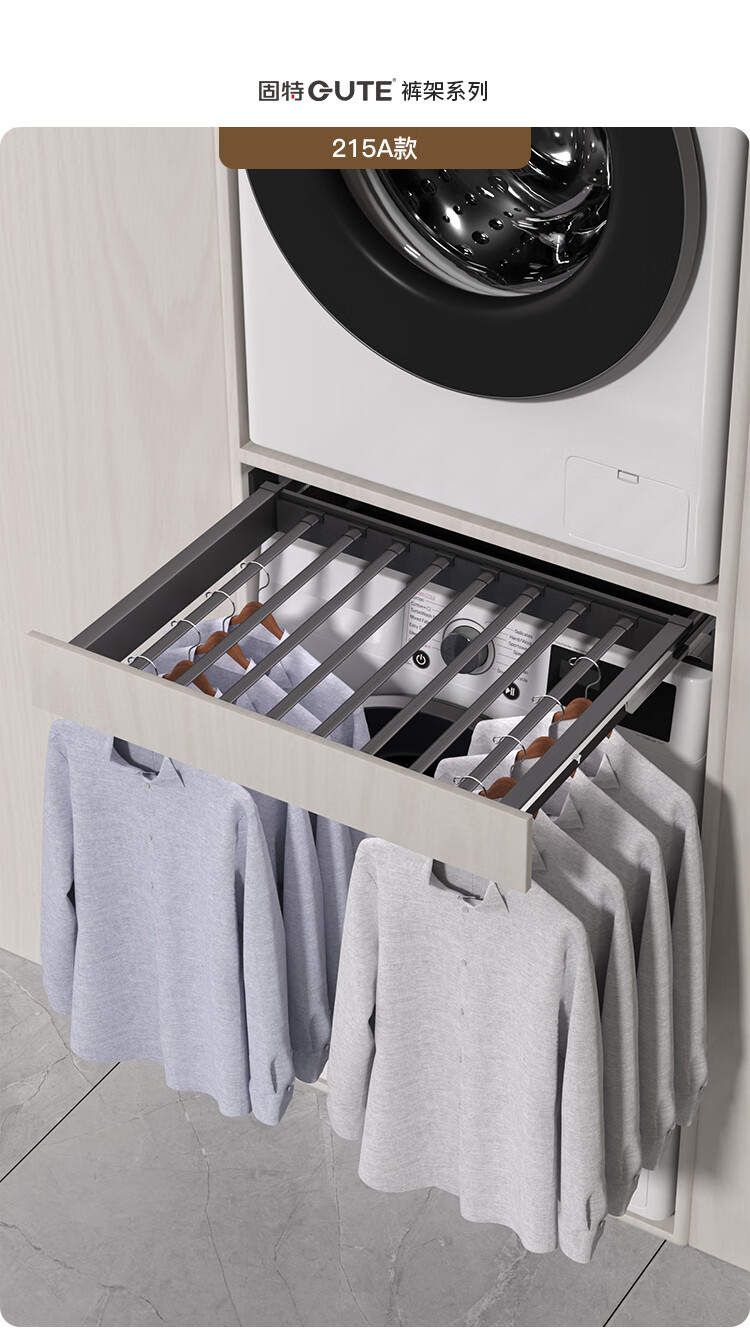 固特(GUTE)隐形晾衣架洗衣机烘干机上方抽拉式收纳架裤架阳台洗衣柜伸缩滑轨 灰色阻尼款(深≥46 宽62-67) 可加装面板
