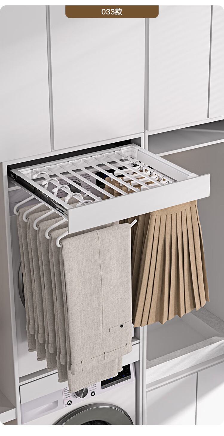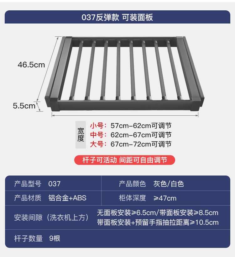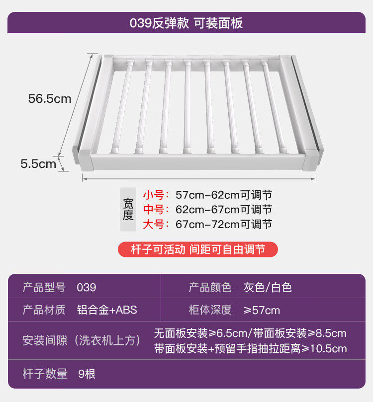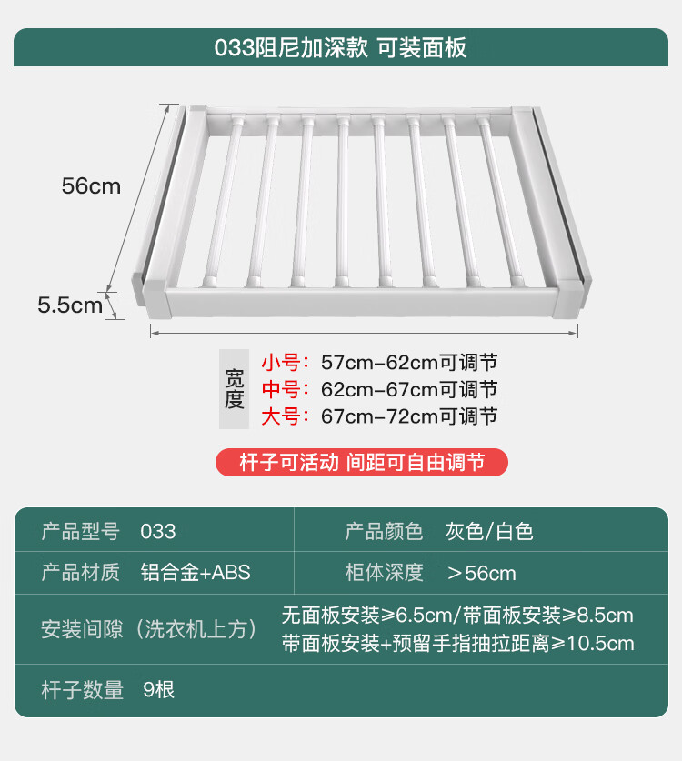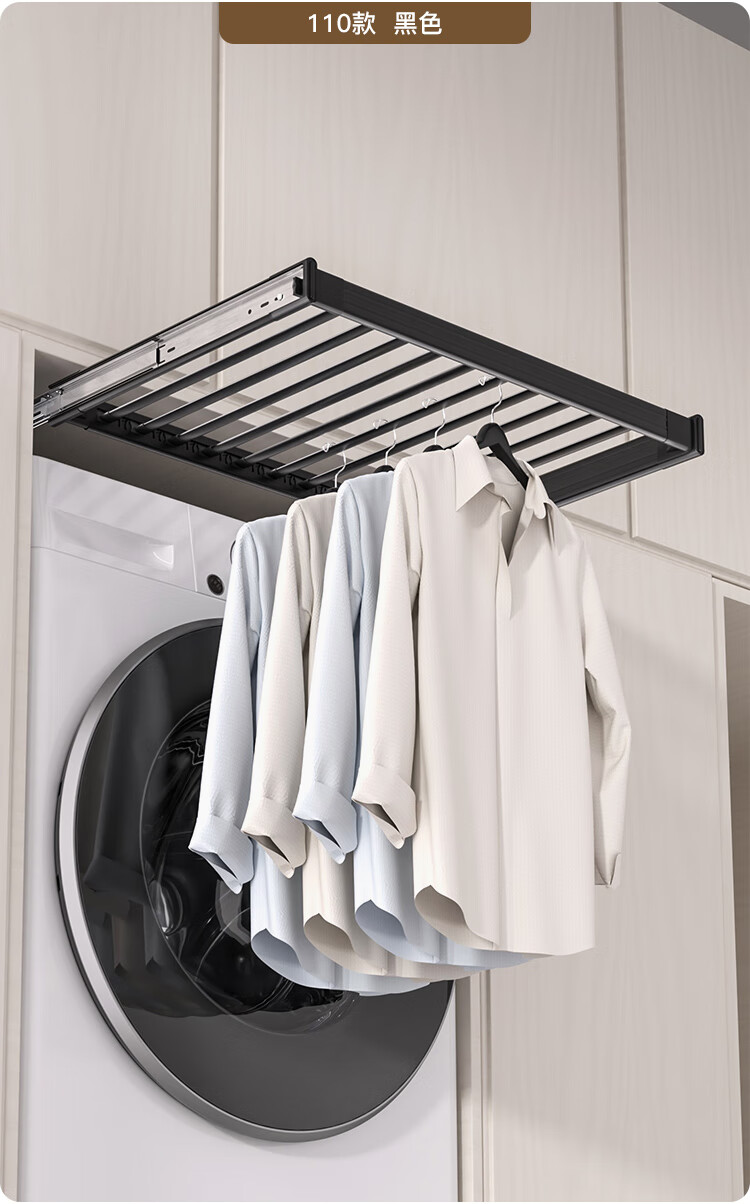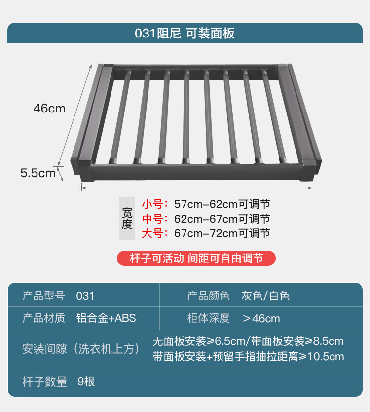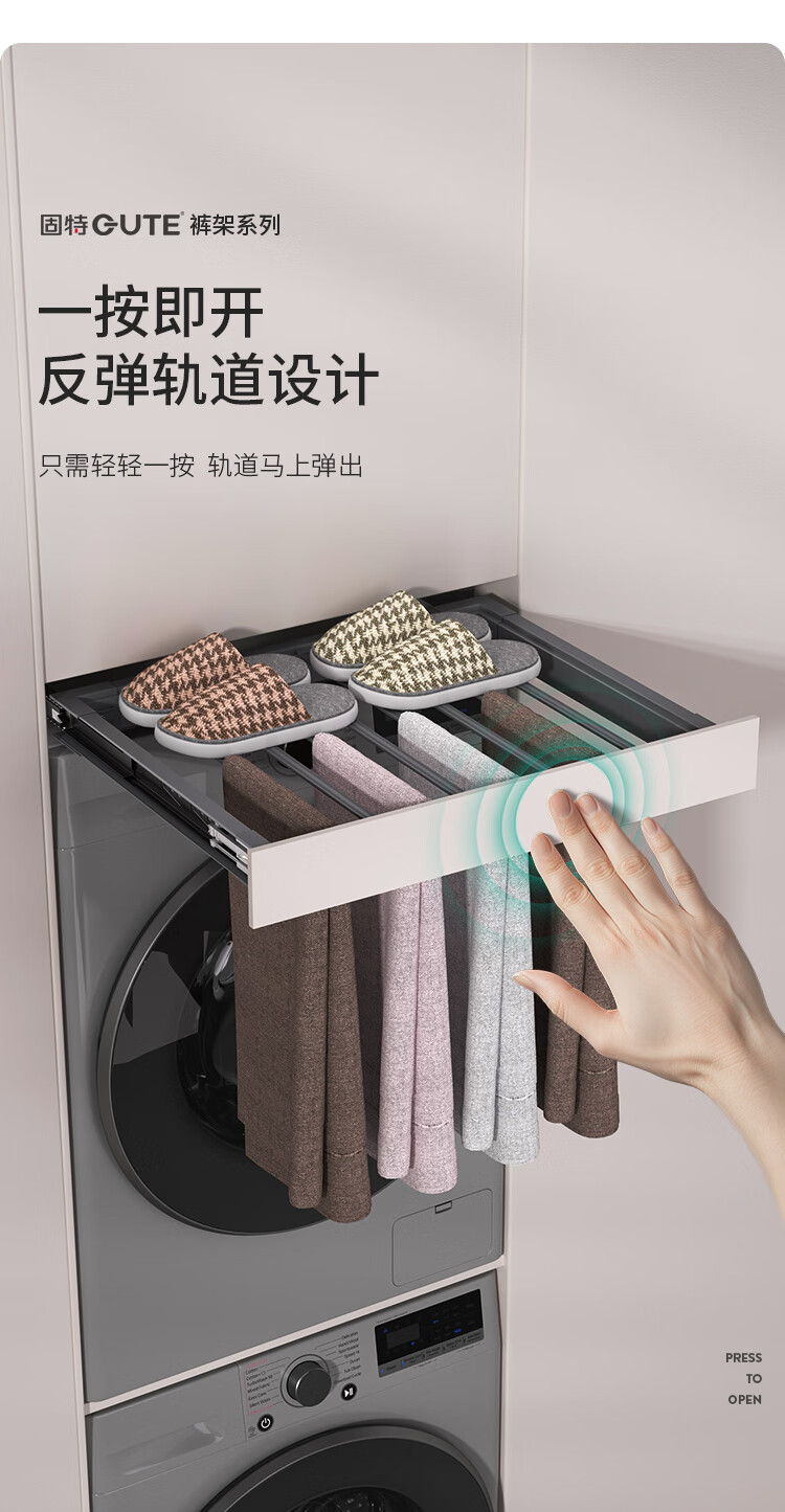 固特(GUTE)隐形晾衣架洗衣机烘干机上方抽拉式收纳架裤架阳台洗衣柜伸缩滑轨 灰色阻尼款(深≥46 宽62-67) 可加装面板