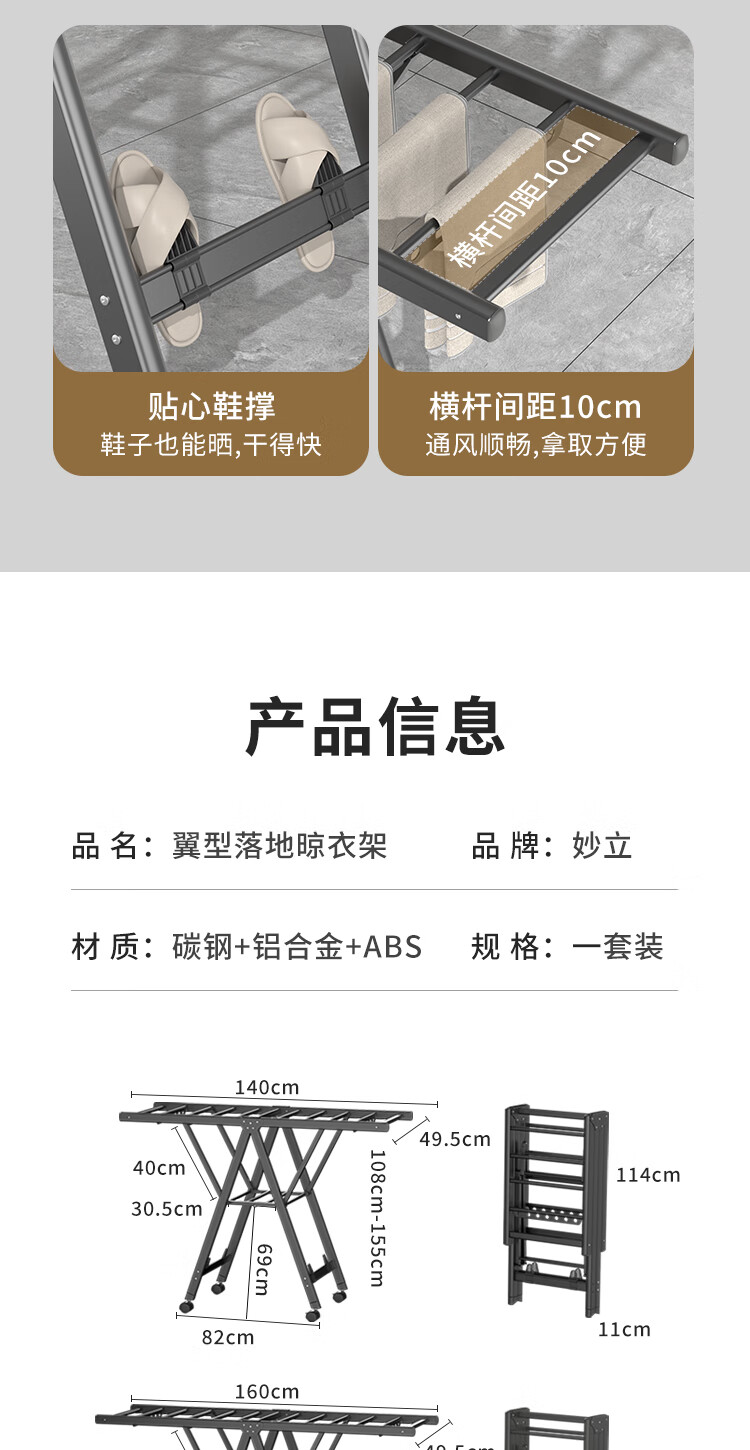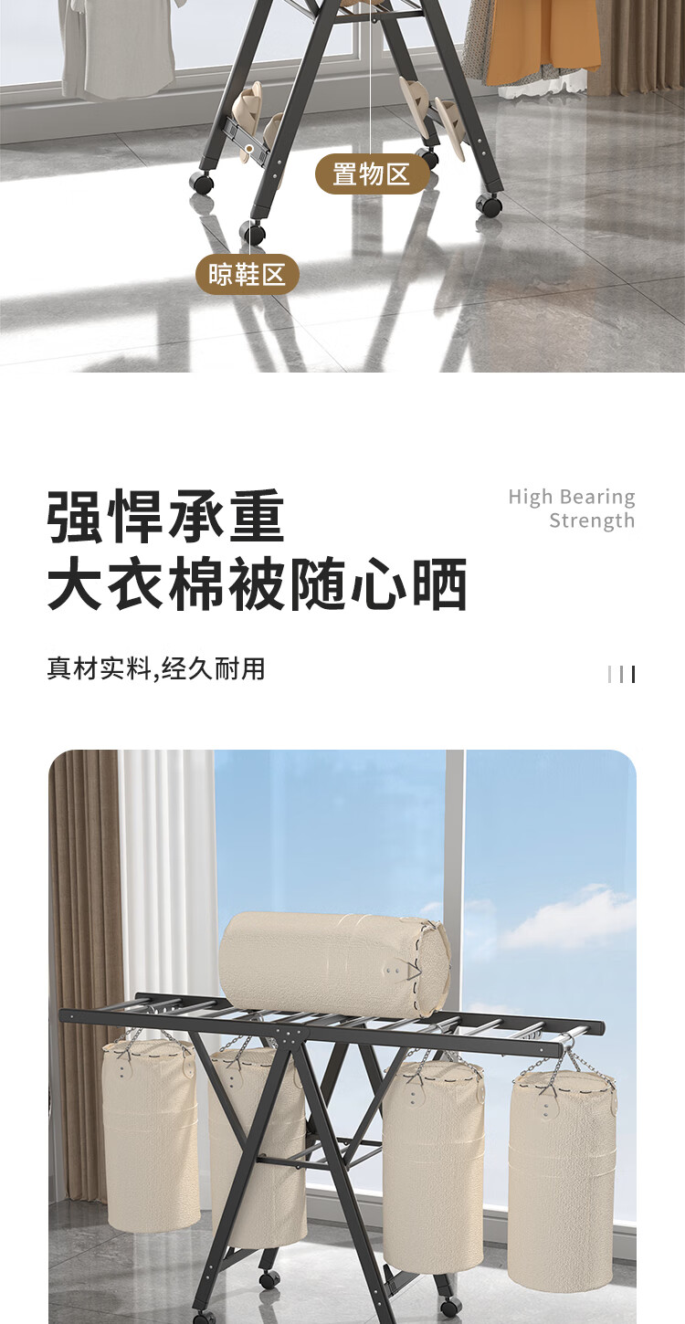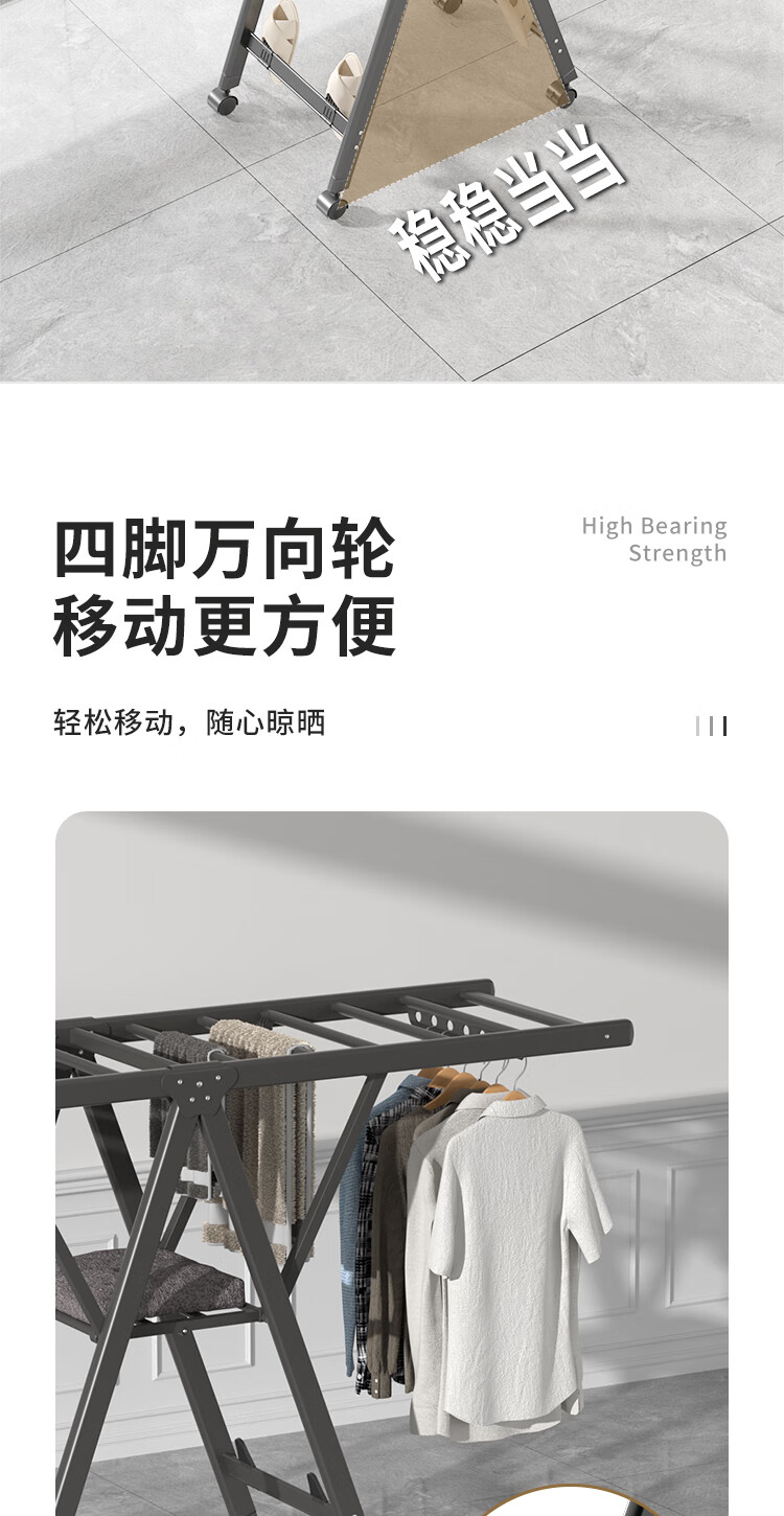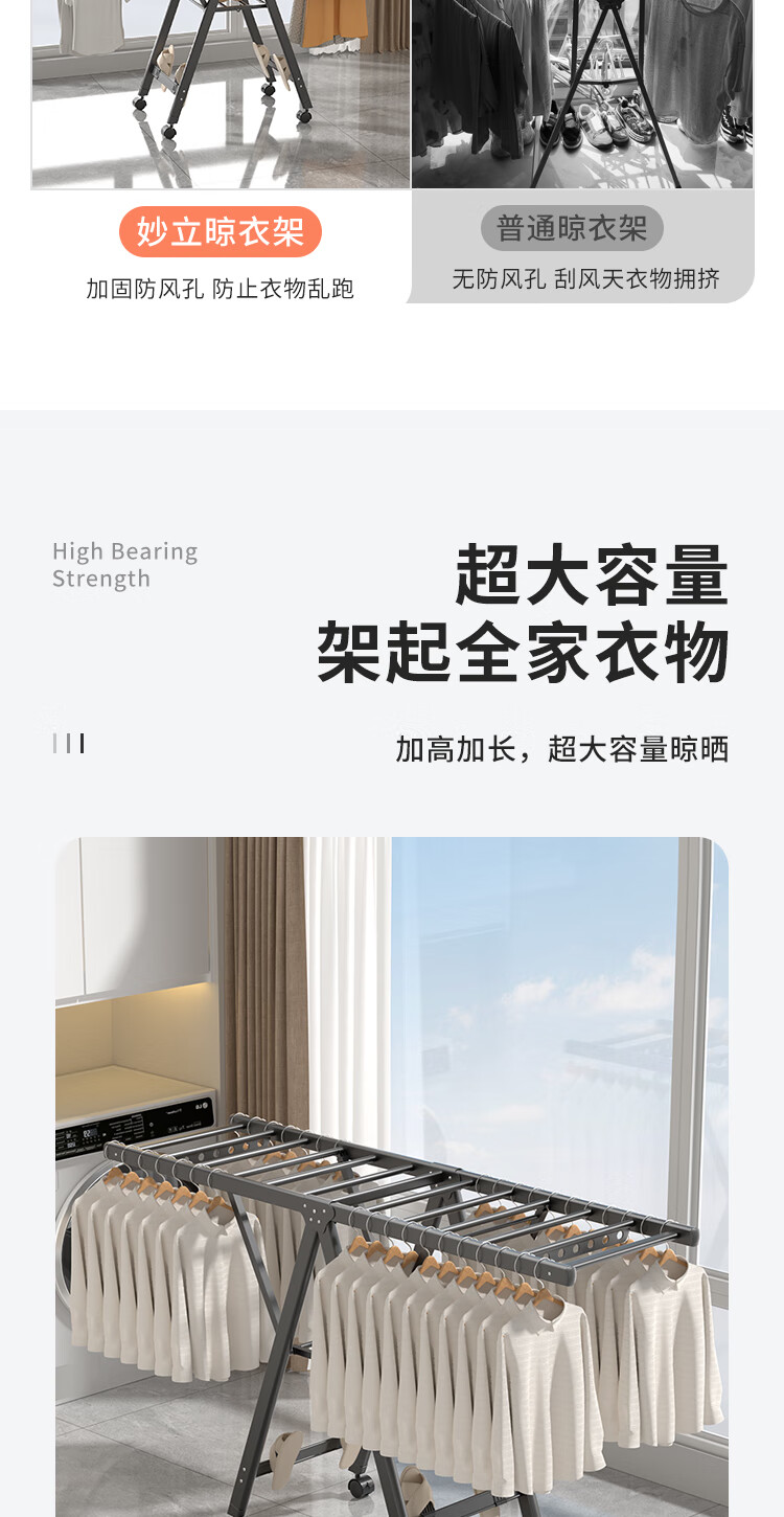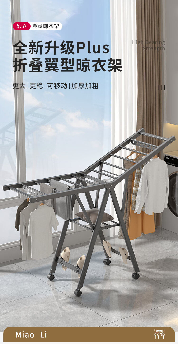妙立晾衣架落地铝合金可折叠室内可移动家用阳台户外防风挂衣架晒被子
