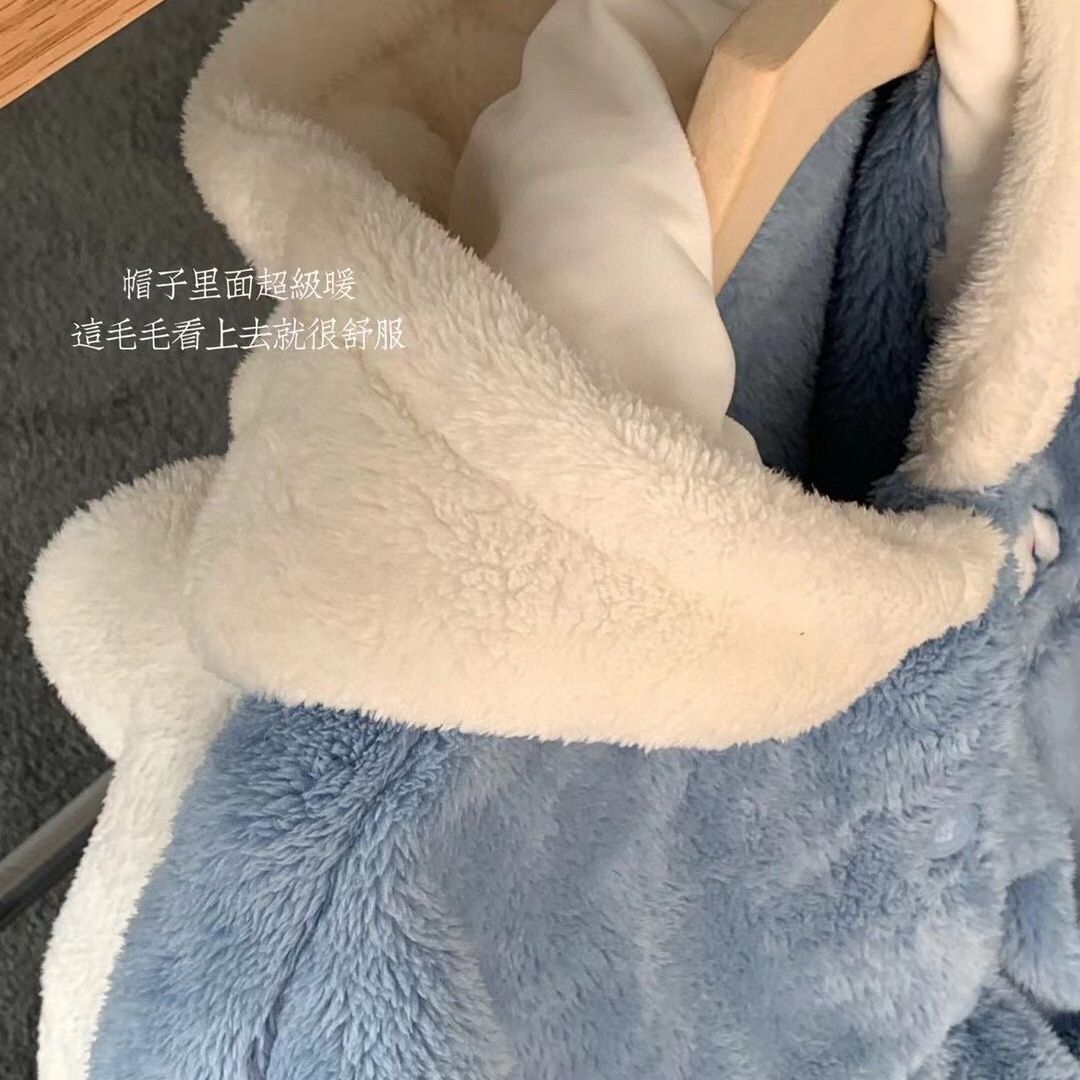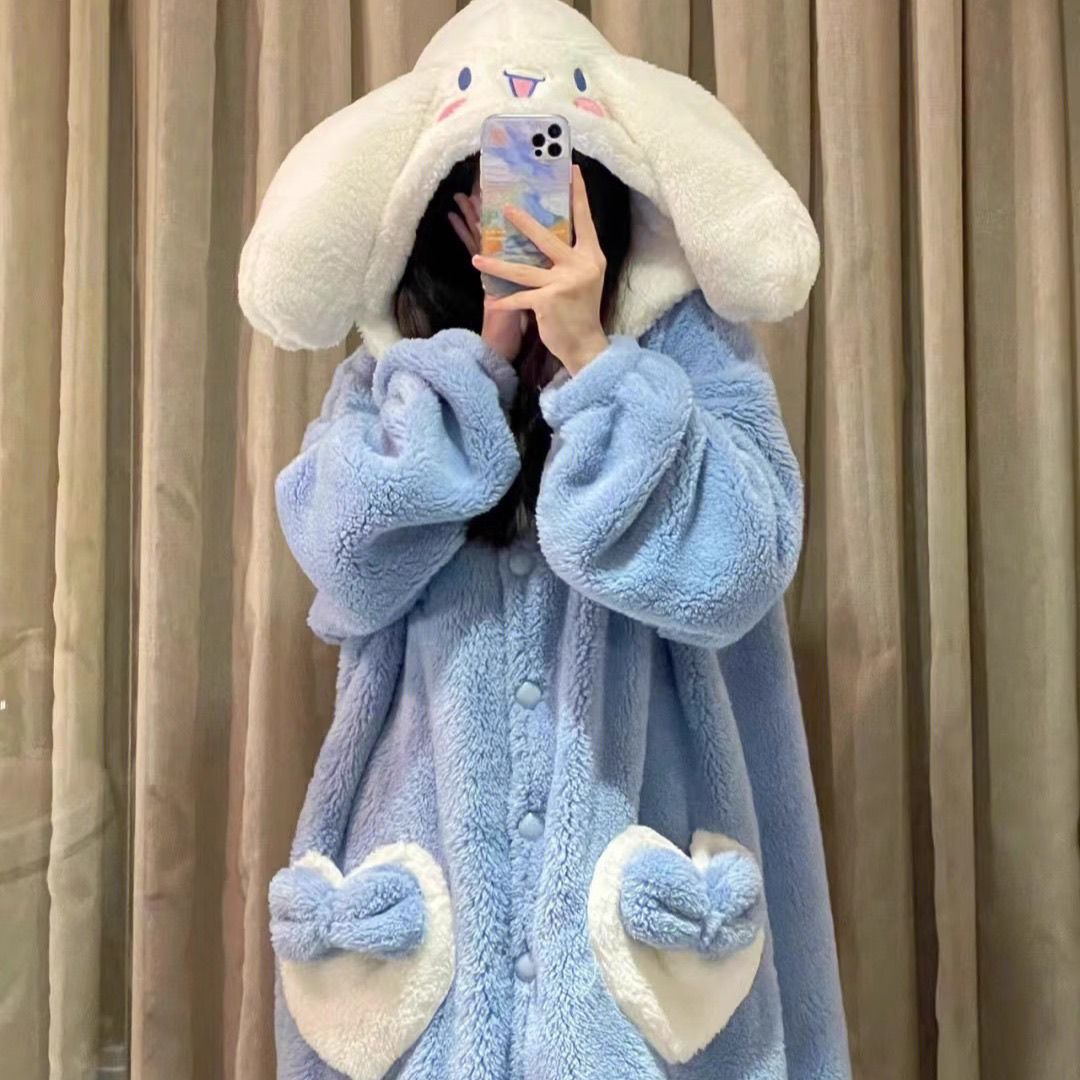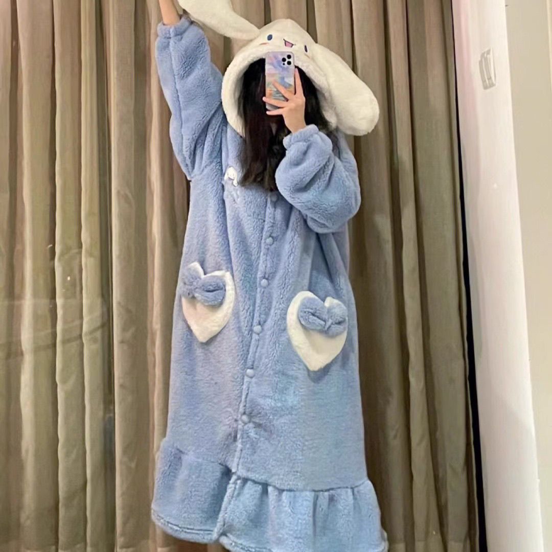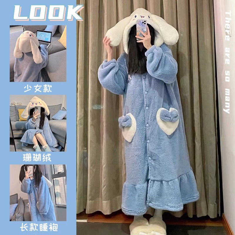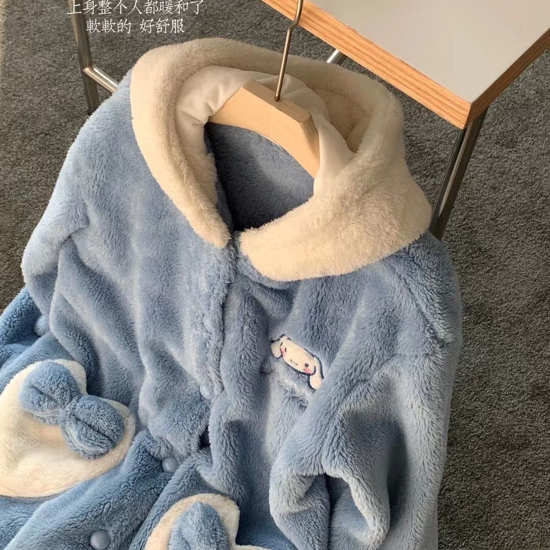 ins秋冬款甜美可爱大耳狗睡袍秋冬排扣V领珊瑚绒加绒加厚口袋睡裙【5天内发货】