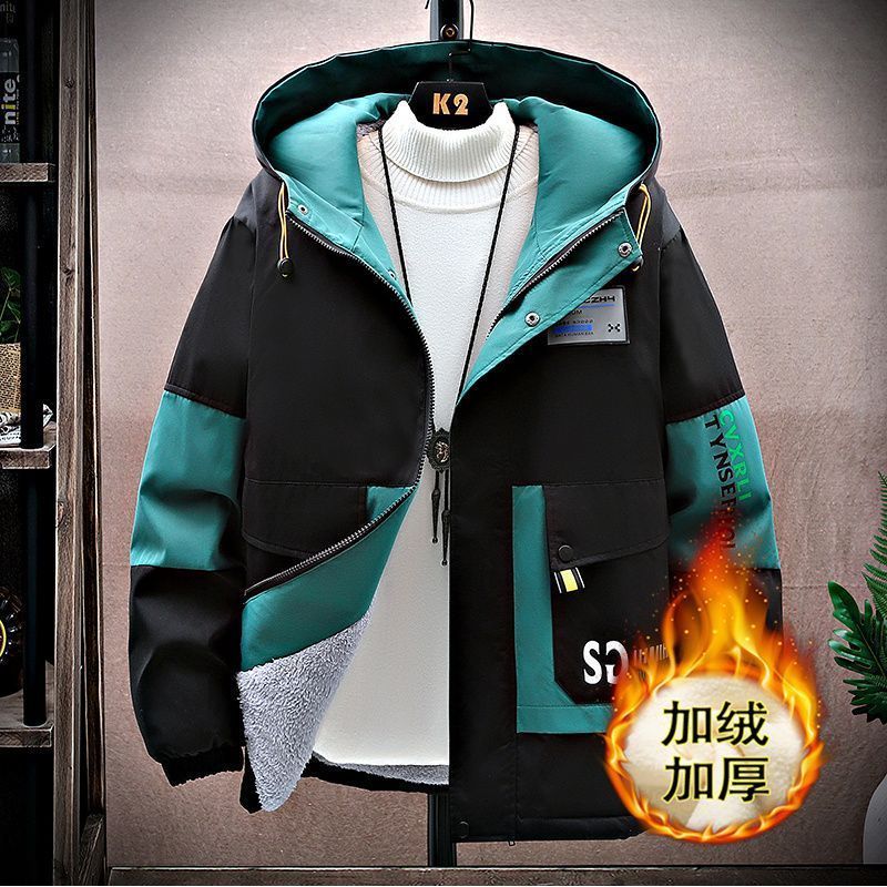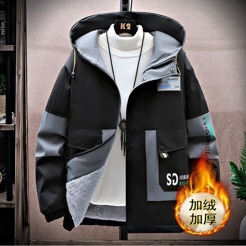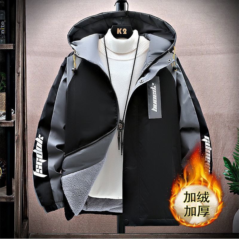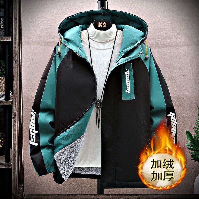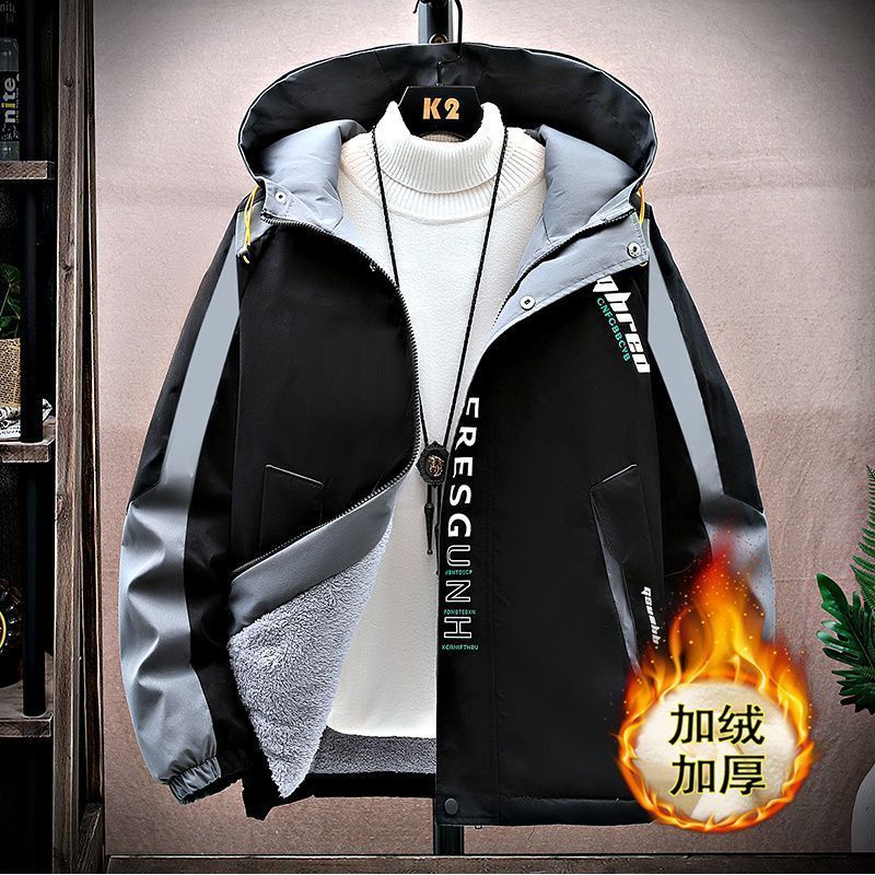 加绒加厚男士秋冬季外套青少年初中学生大学连帽宽松夹克潮流风衣