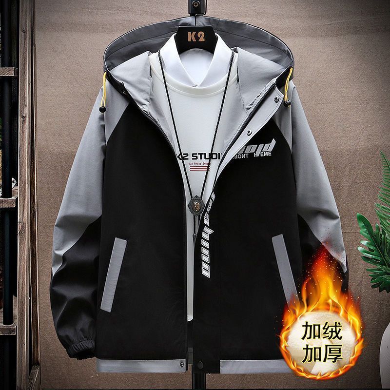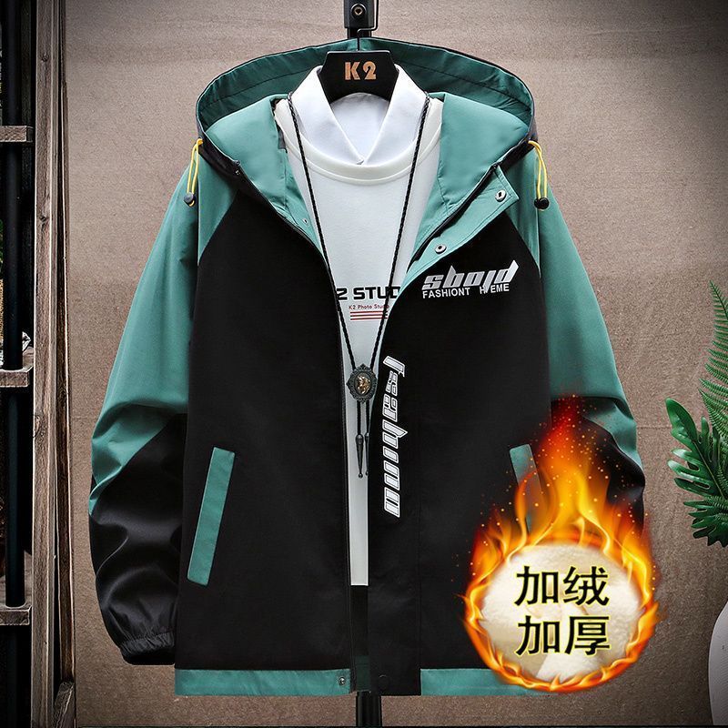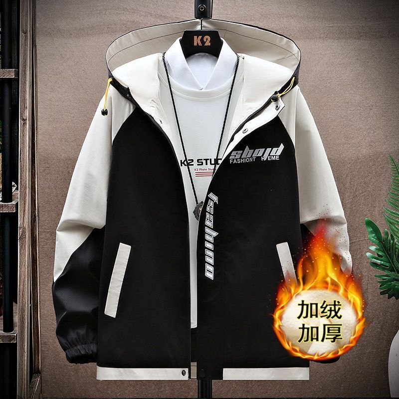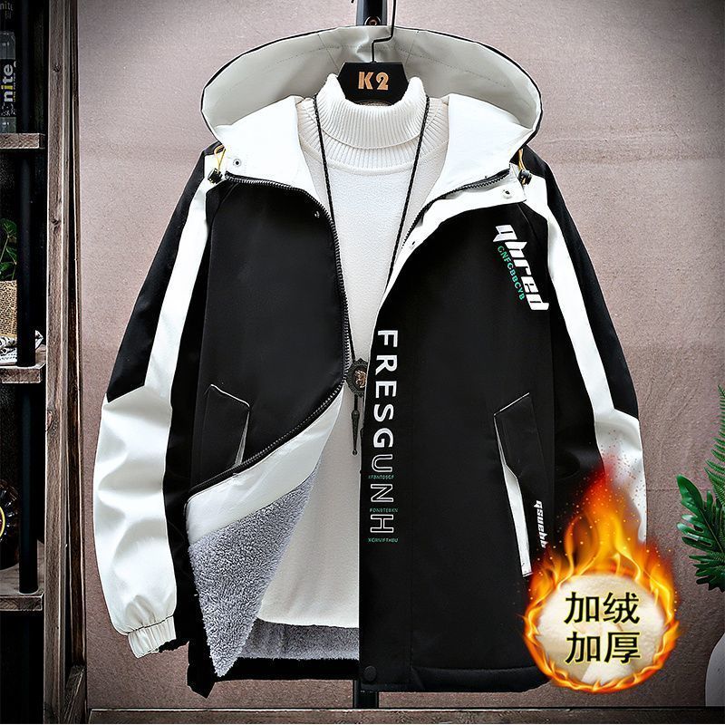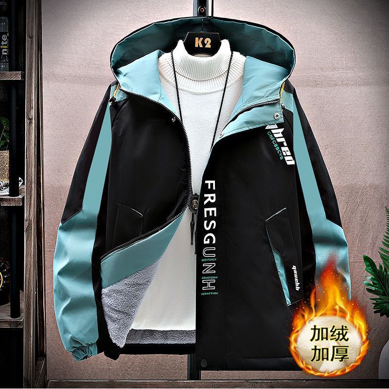 加绒加厚男士秋冬季外套青少年初中学生大学连帽宽松夹克潮流风衣