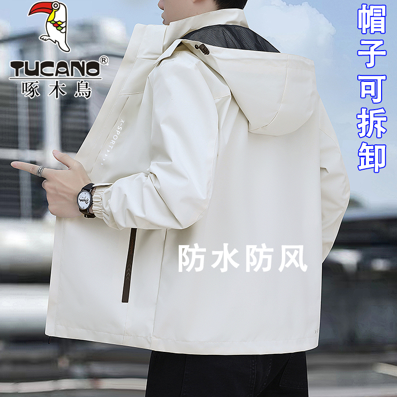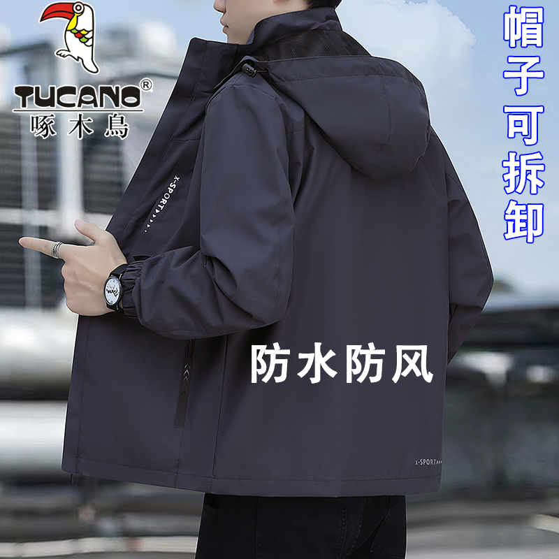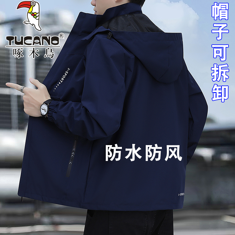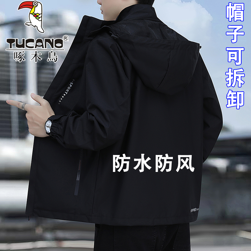 啄木鸟冲锋衣夹克男士春秋季外套宽松防风防水可拆帽城市休闲男